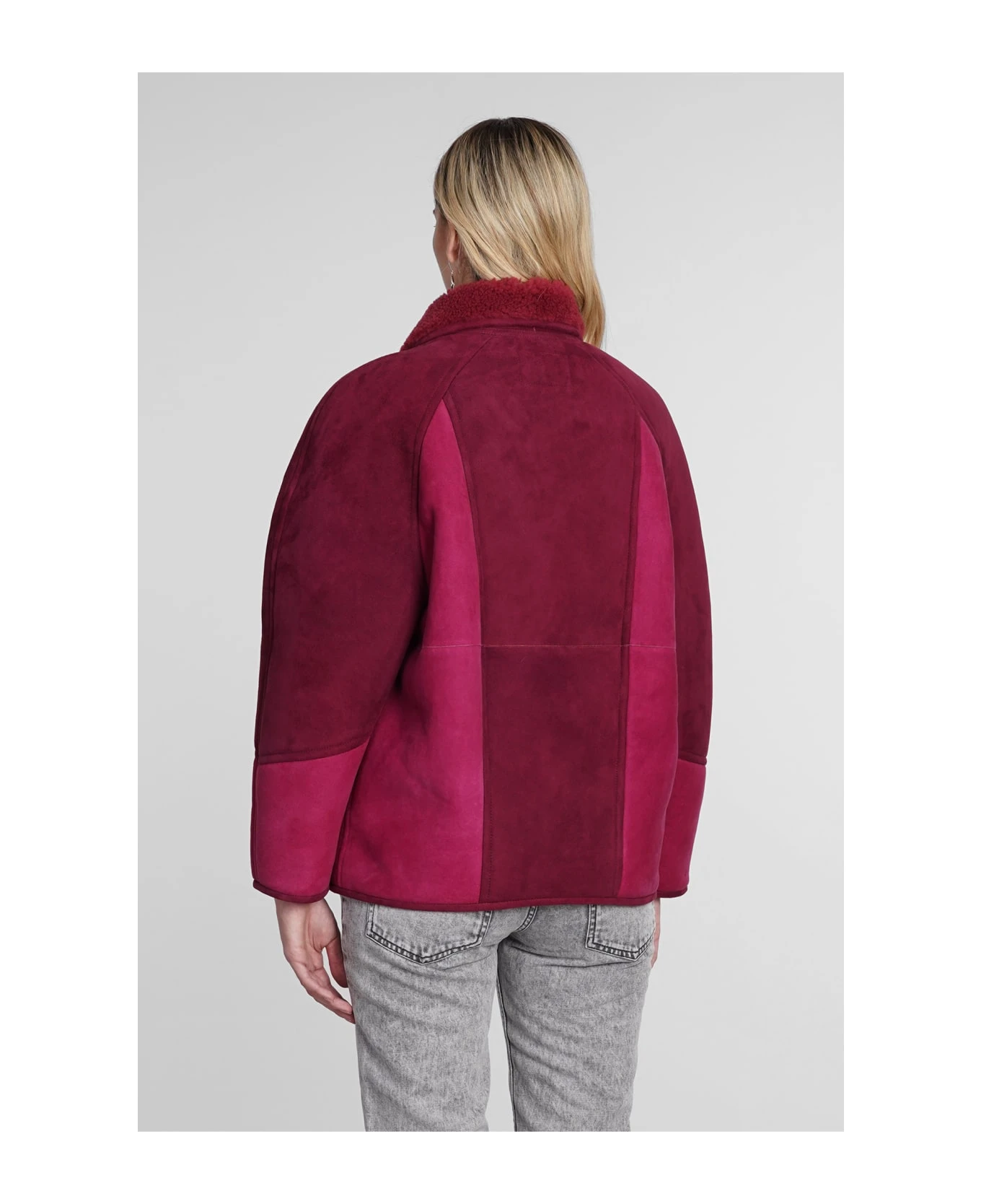 Abeni Coat in bordeaux leather, frontal buttoning, long sleeves, pockets, bicolor, 100% Lamb Leather, Made in Turkey, Model is 180 cm and wears 36