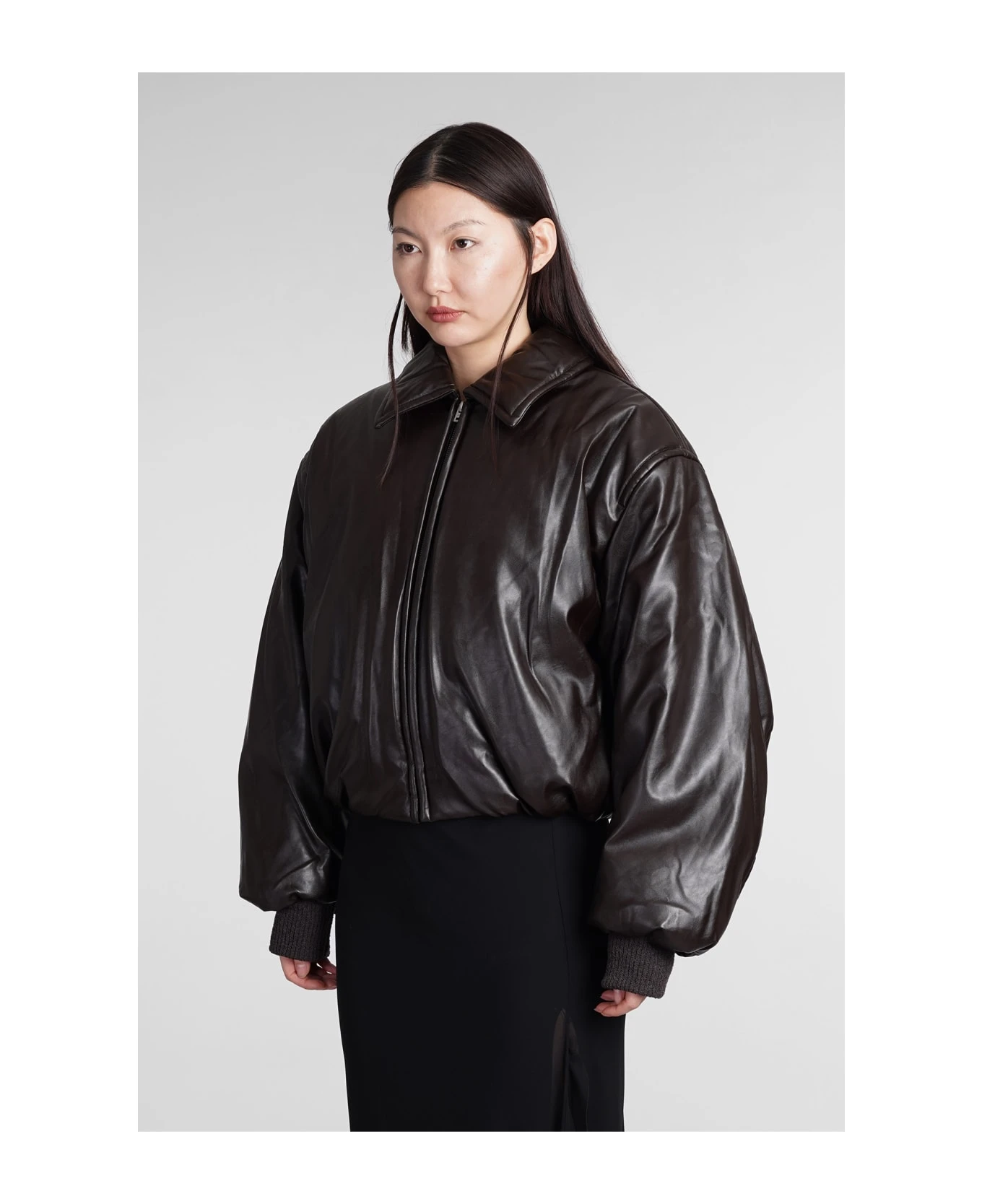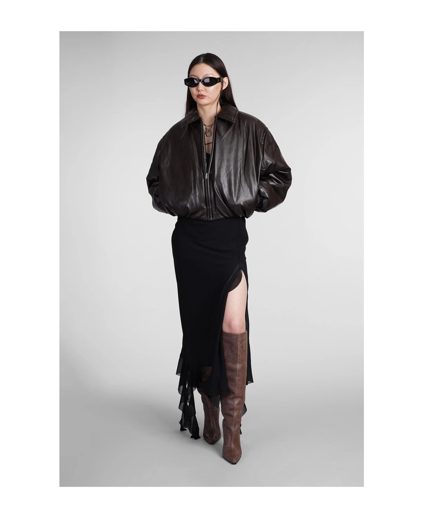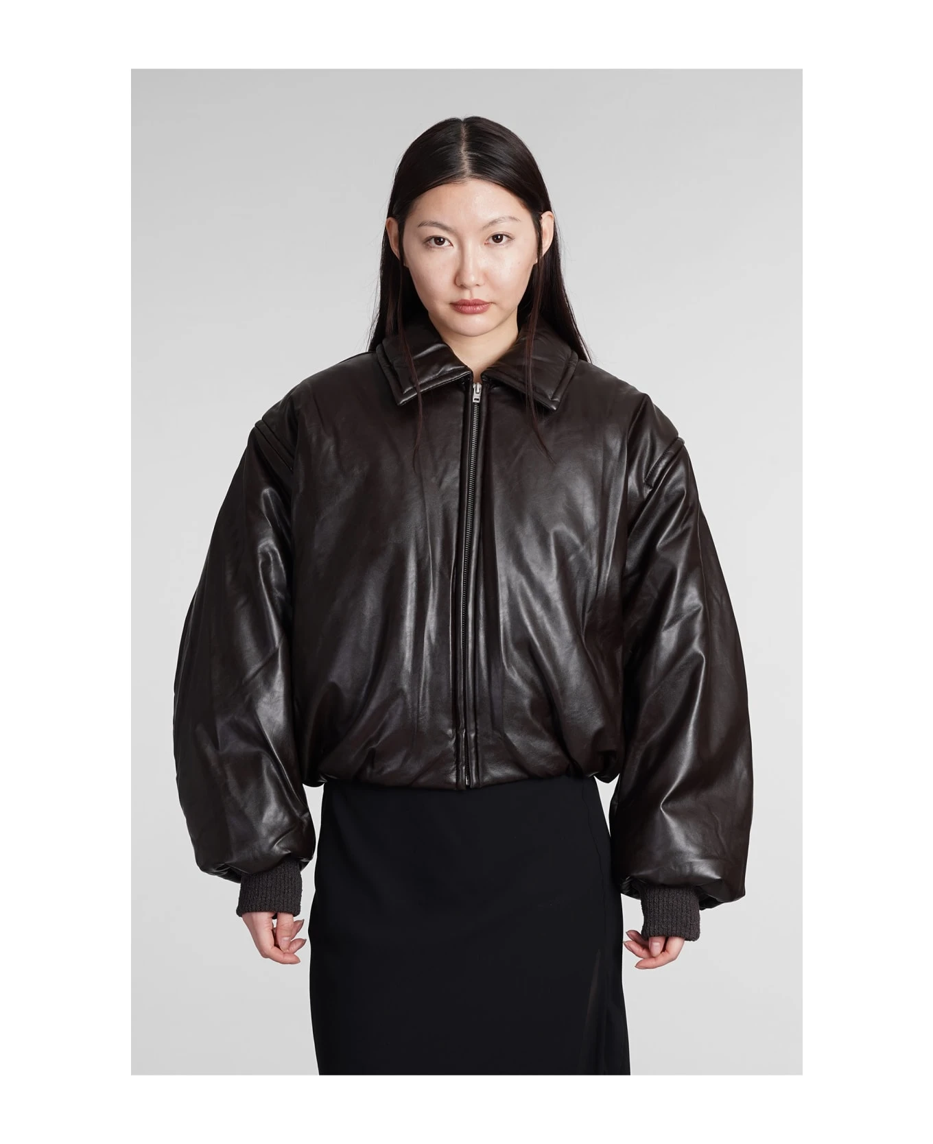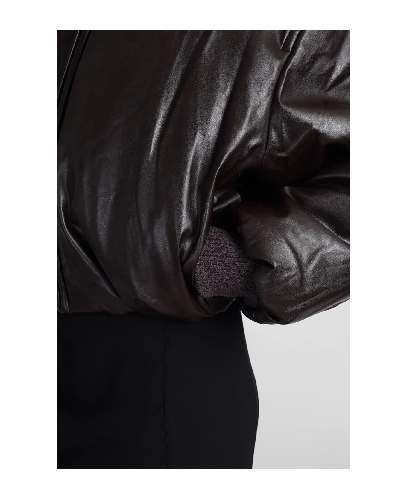Bomber in brown polyester, collar, long sleeves, zip clousure, oversized fit, ribbed cuffs and bottom, crop cut, 55% polyester, 45% polyurethane, Made in China, Model is 180 cm and wears 36