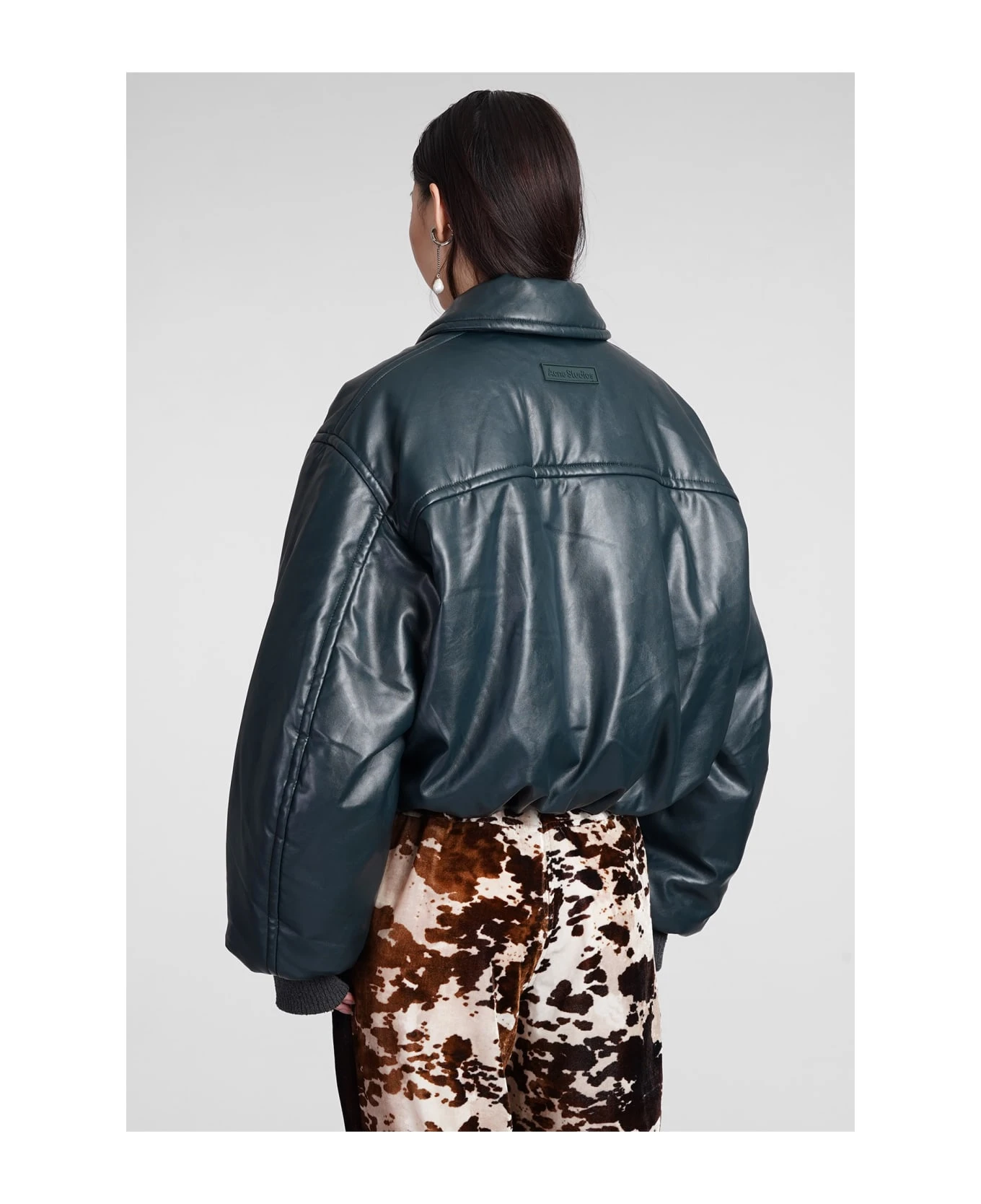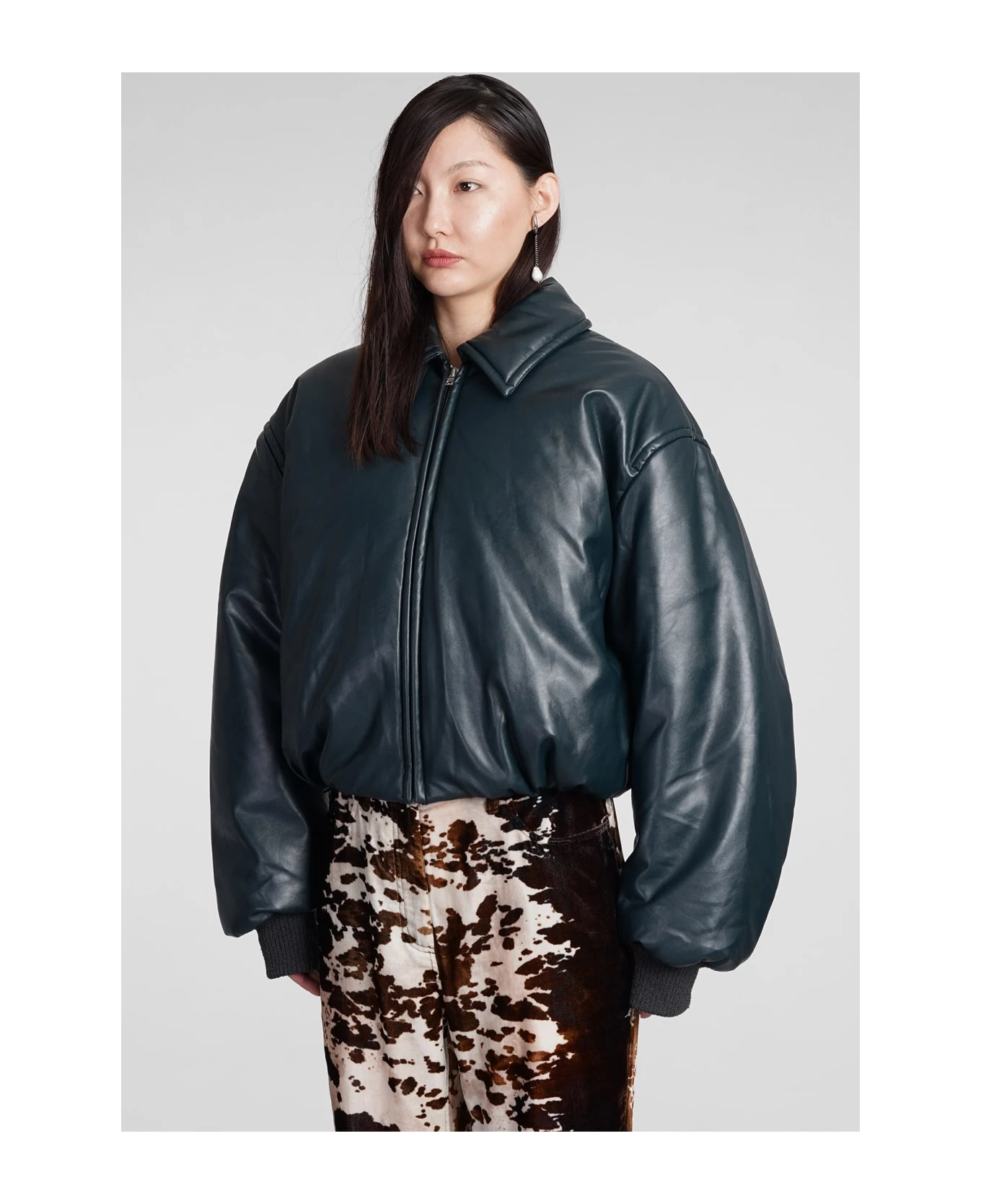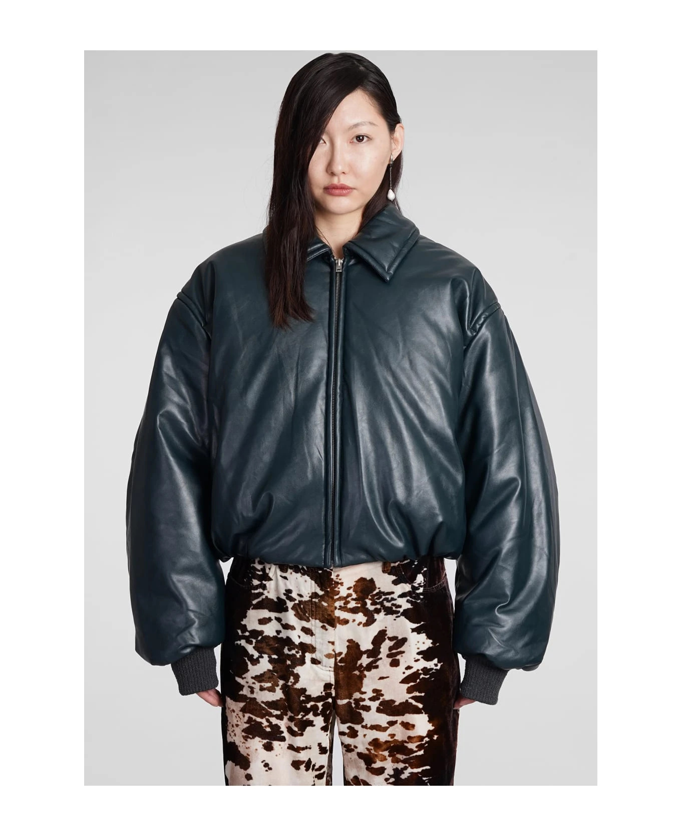 Bomber in green polyester, collar, long sleeves, zip clousure, oversized fit, ribbed cuffs and bottom, crop cut, 55% polyester, 45% polyurethane, Made in China, Model is 180 cm and wears 36