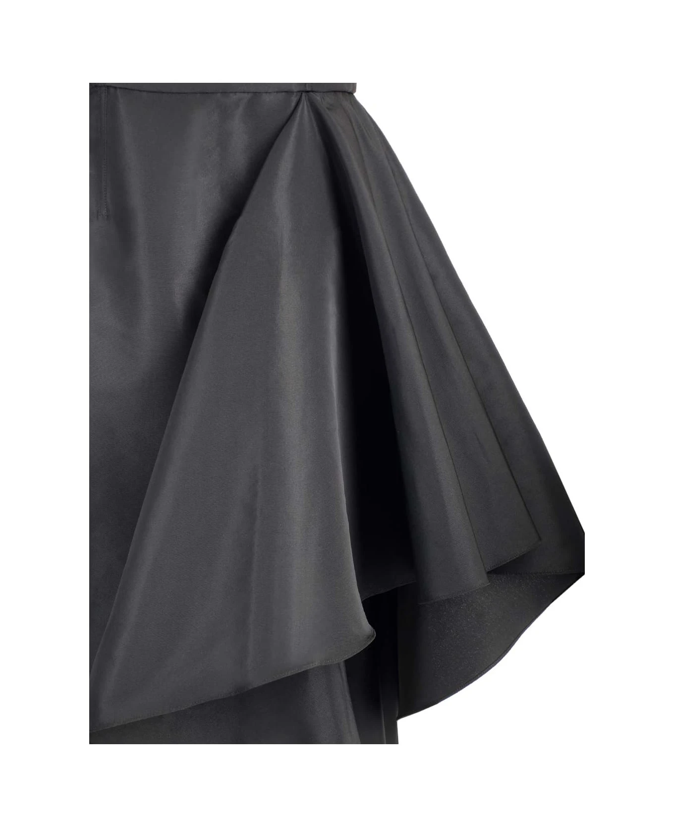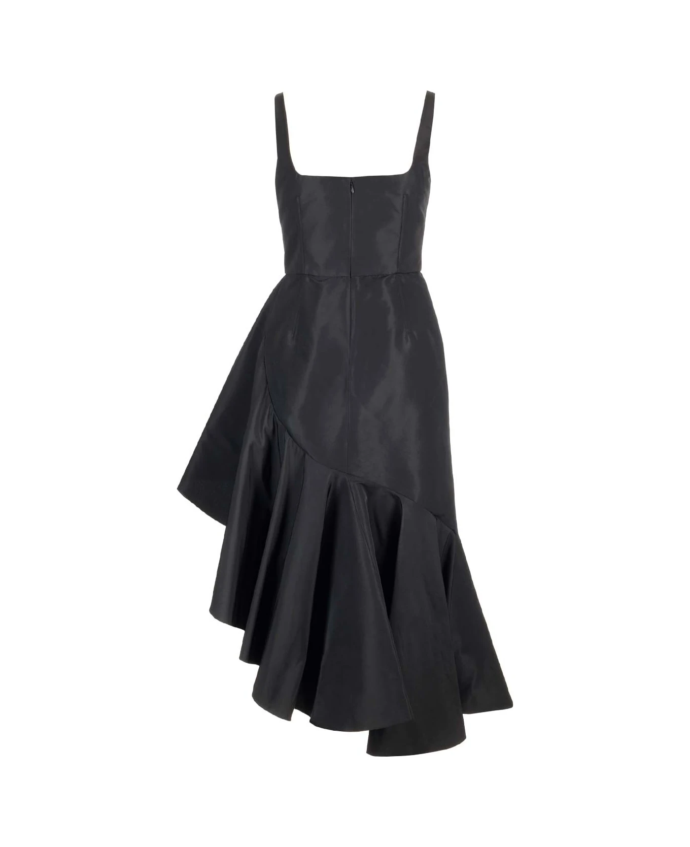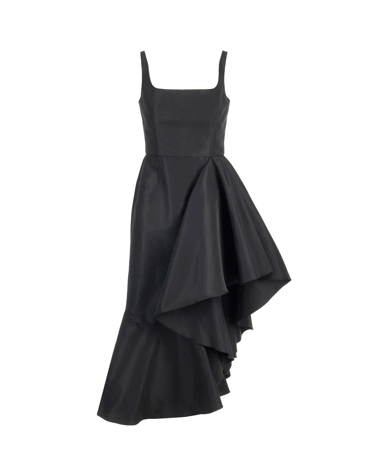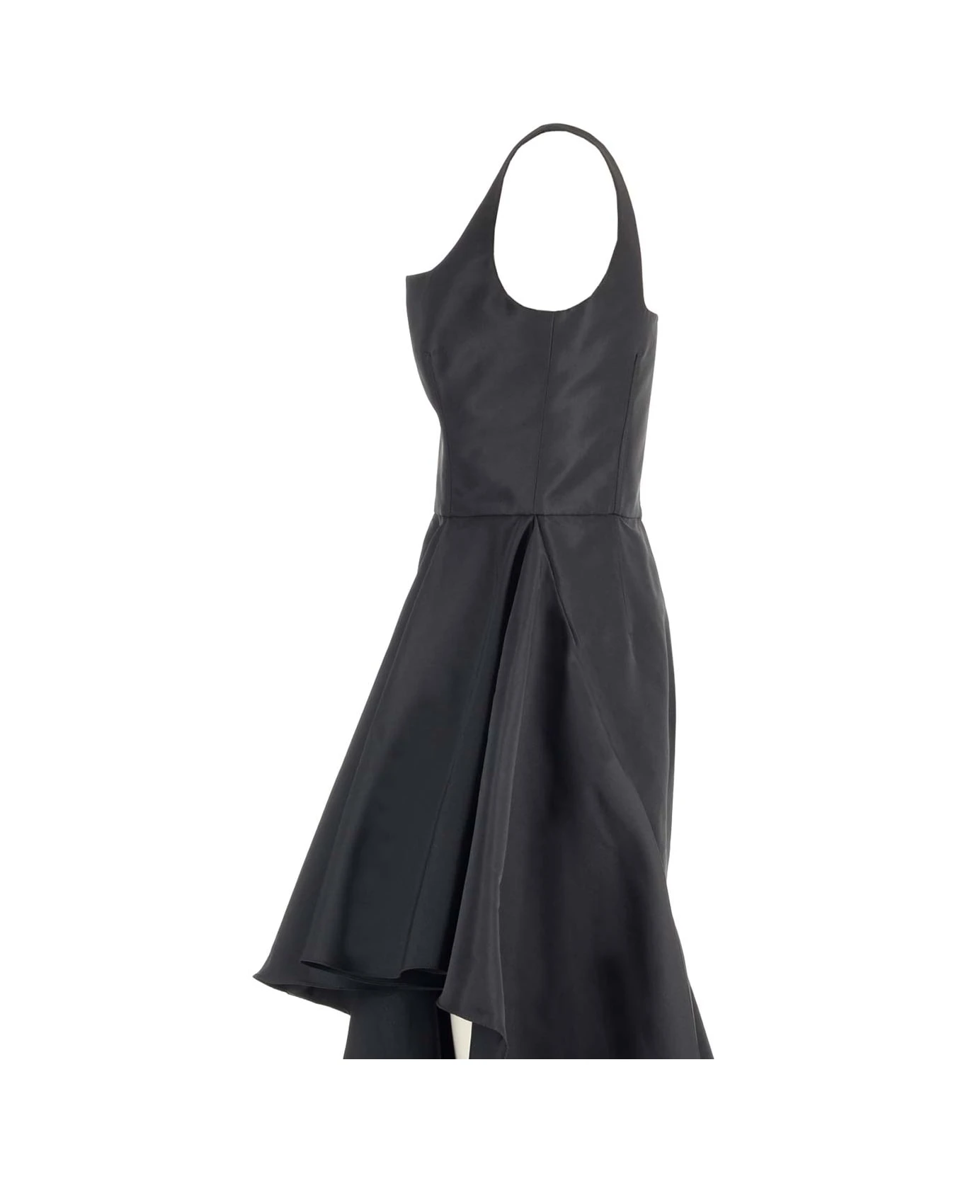 Black polyfaille dress from Alexander McQueen with asymmetrical draped details, with a square neckline and a zip closure on the back.