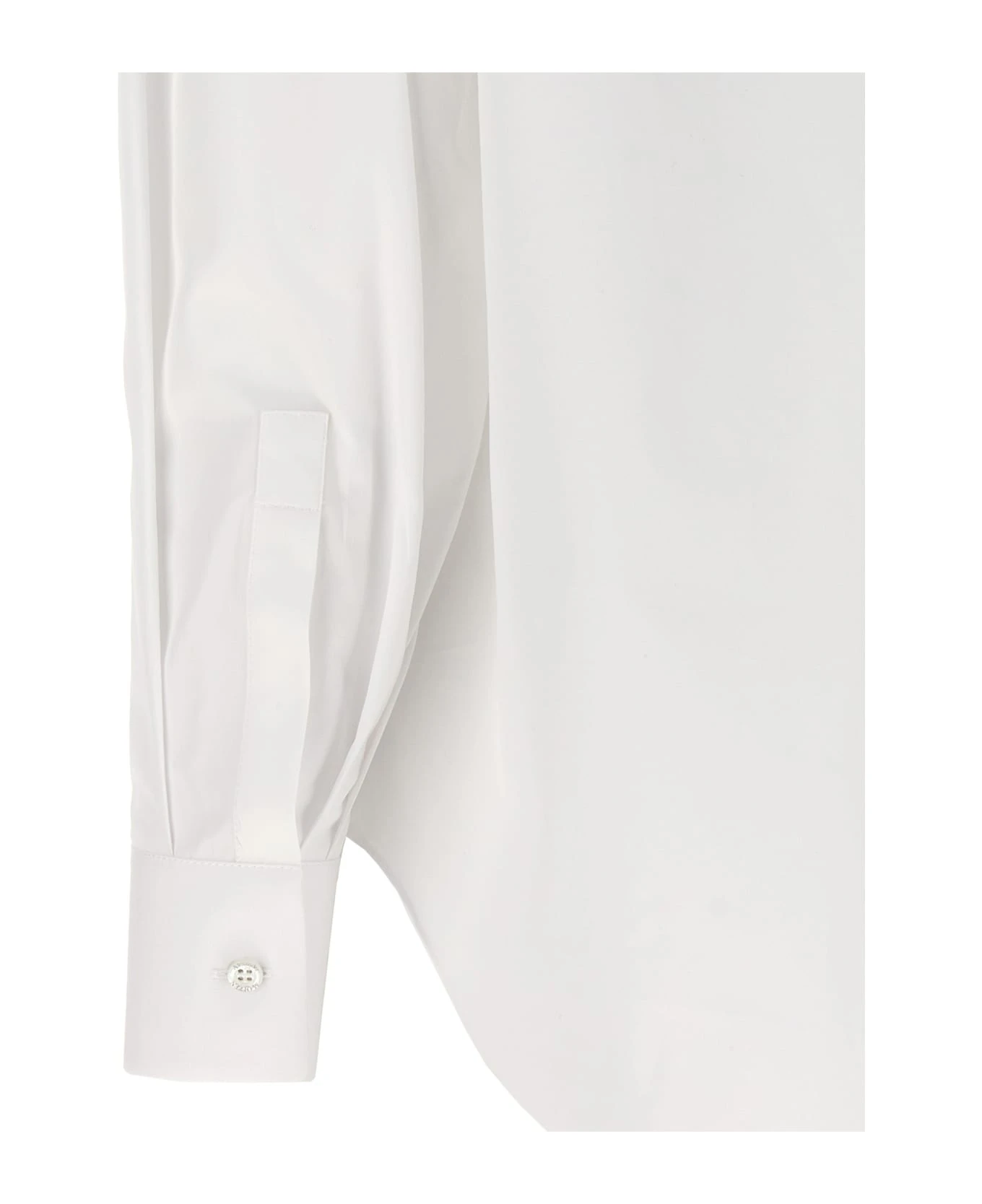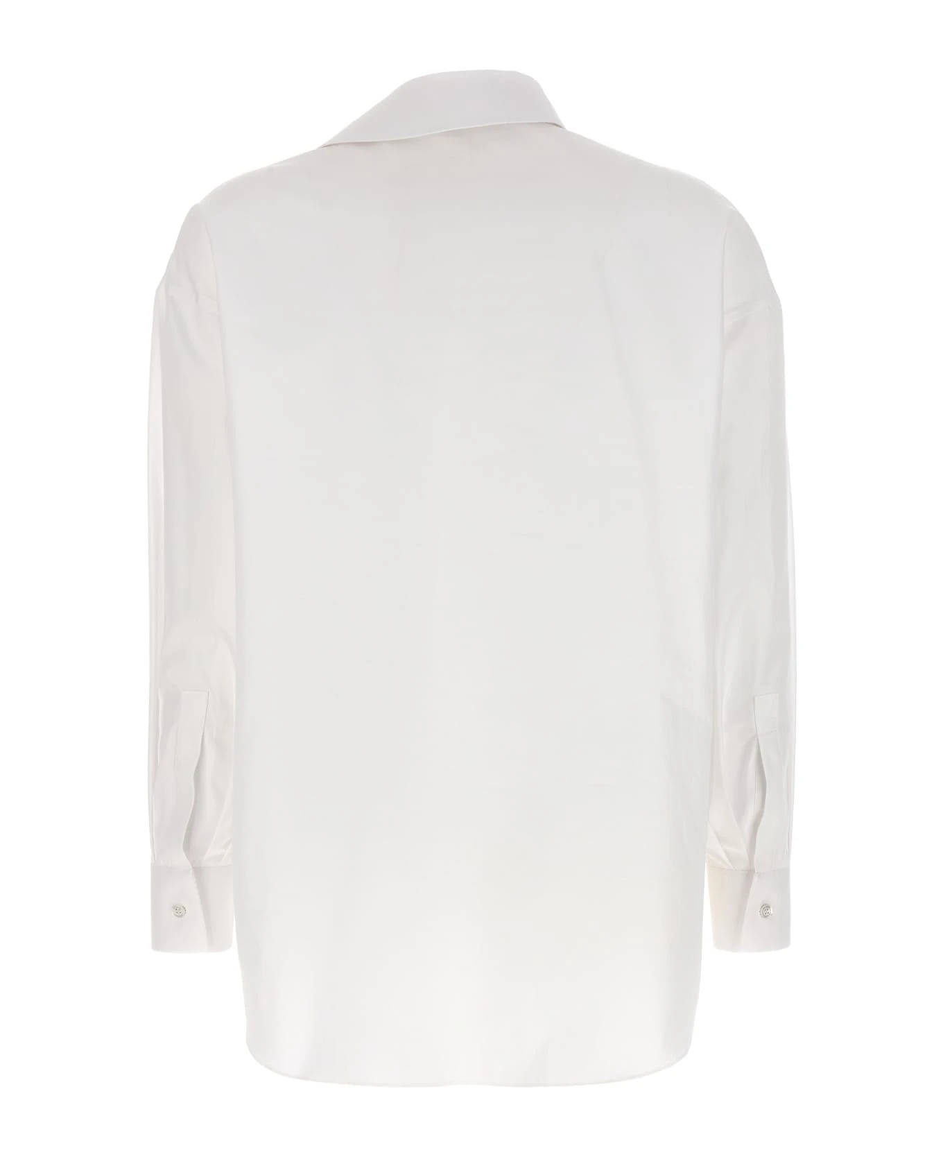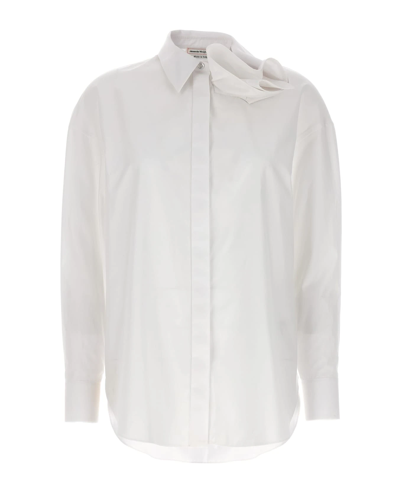 Cotton poplin shirt with draped detail on the collar, button closure, and long cuffed sleeves.