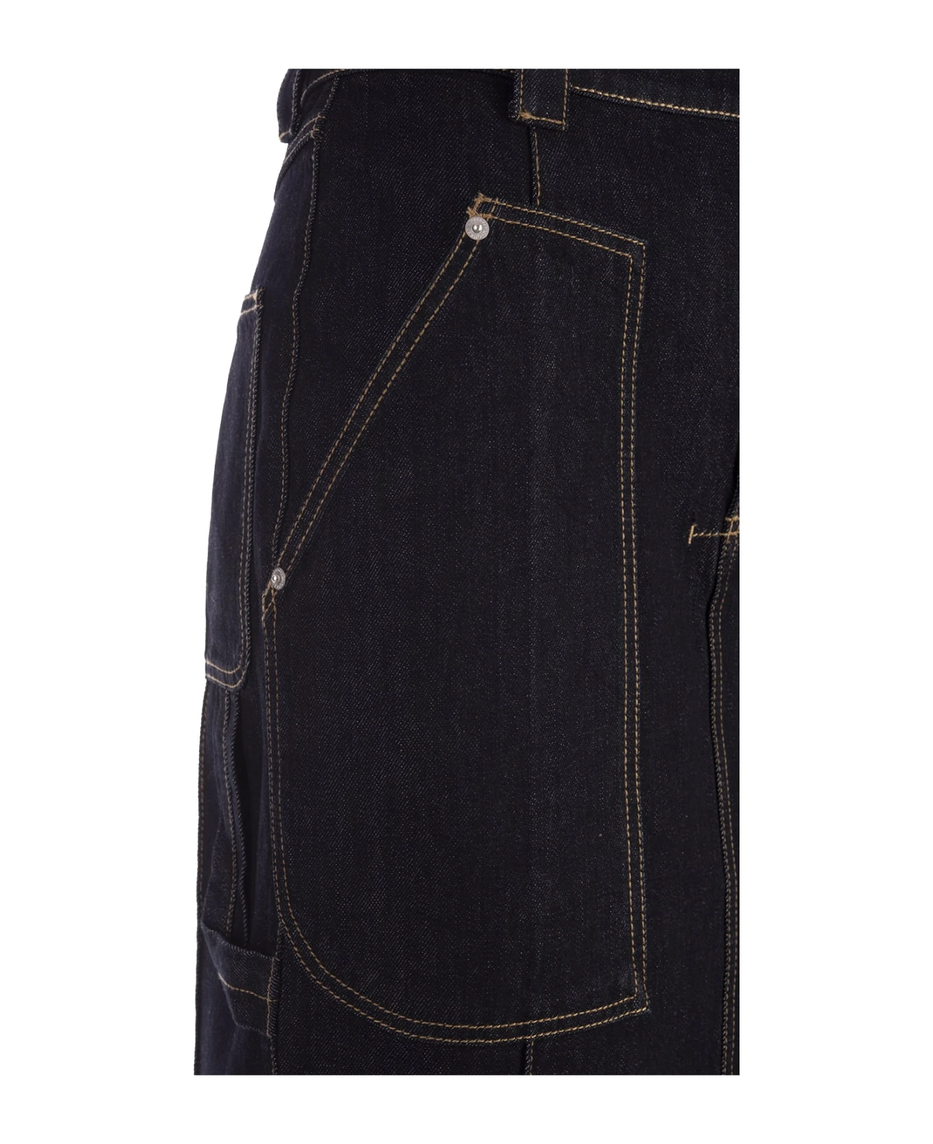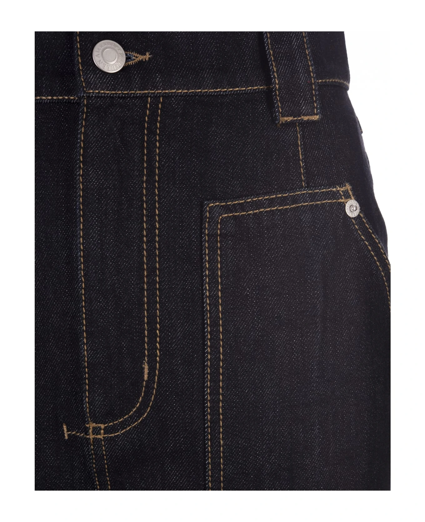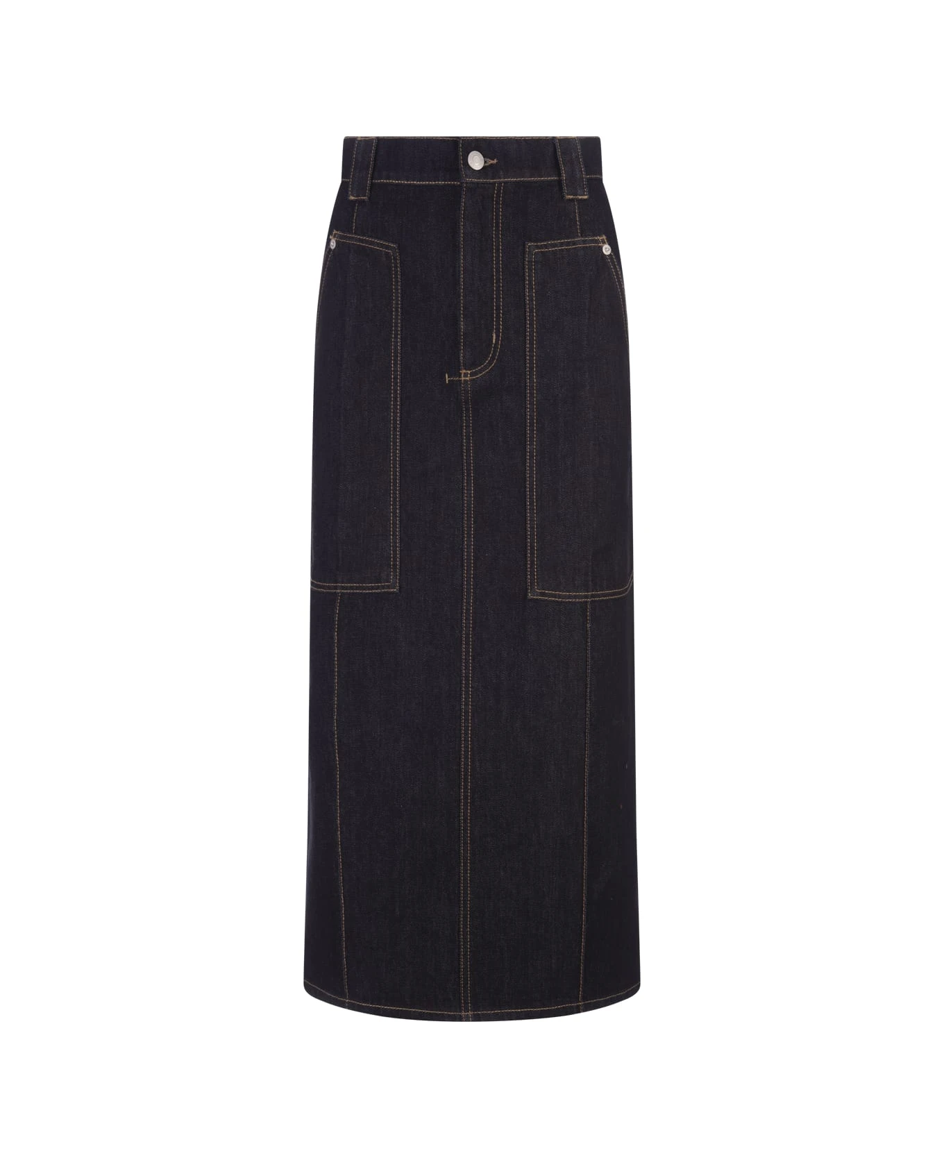 Functional pencil skirt by Alexander McQueen in indigo denim featuring a high waist, tobacco stitching, patch pockets and side tab detail. Zip and button fastening. Article made from organic cotton yarn.