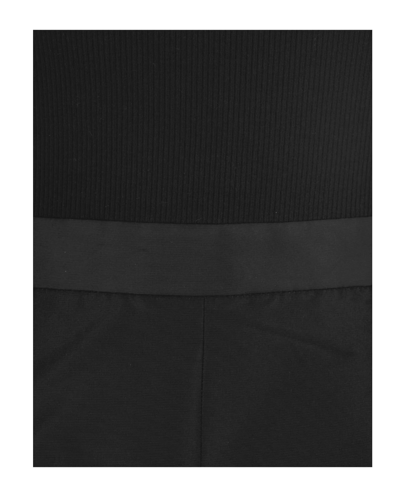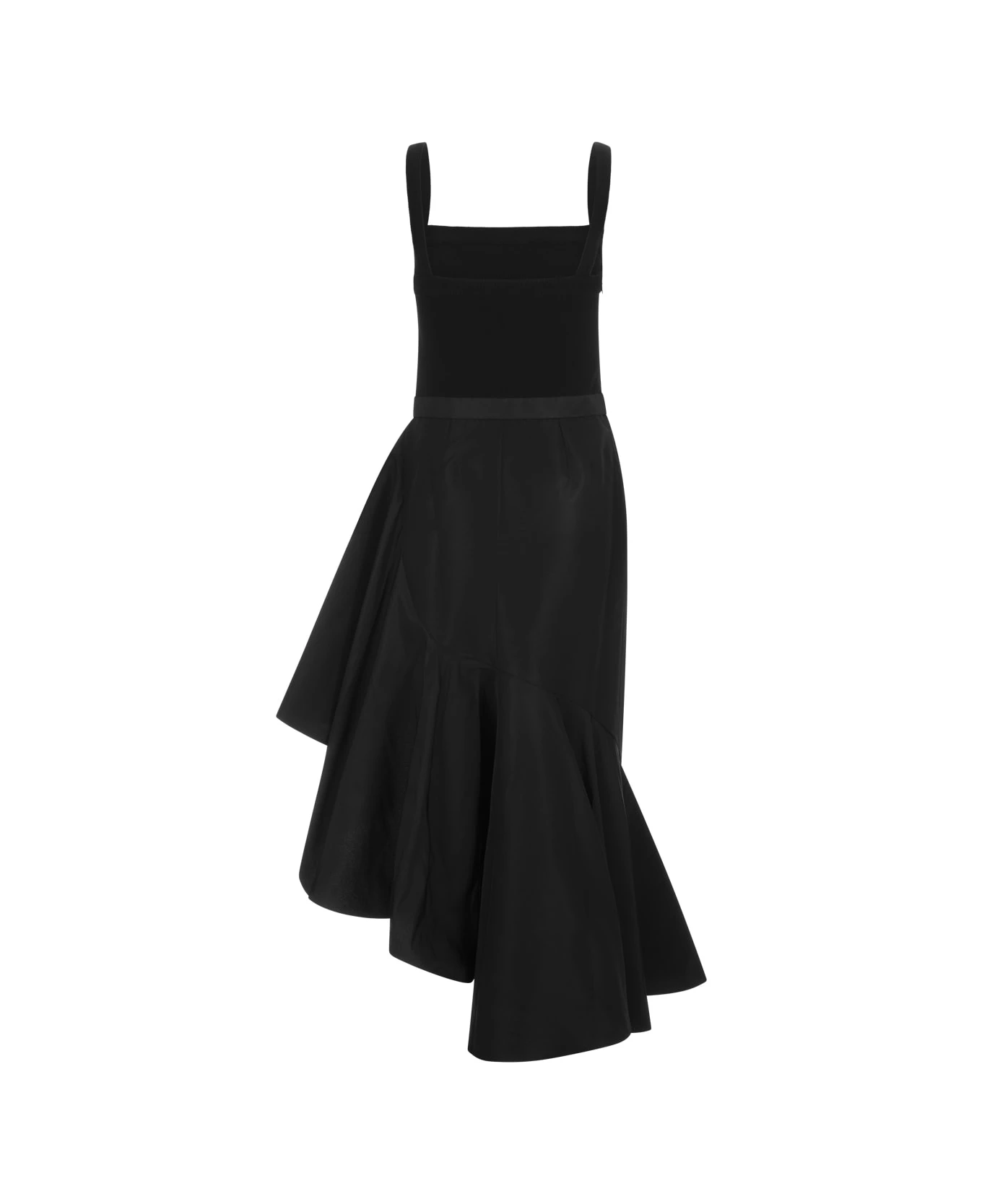 Black sleeveless dress by Alexander McQueen composed of a ribbed stretch cotton top and polyfaille midi skirt. It features a square neckline, asymmetric draped details and a back zip fastening.
