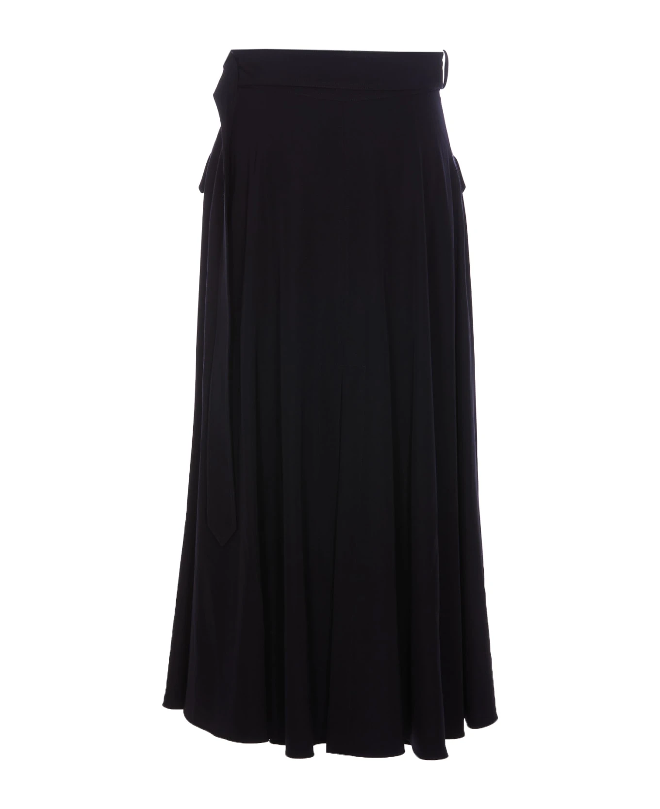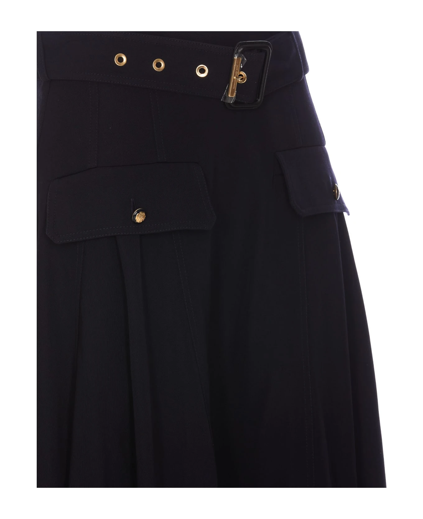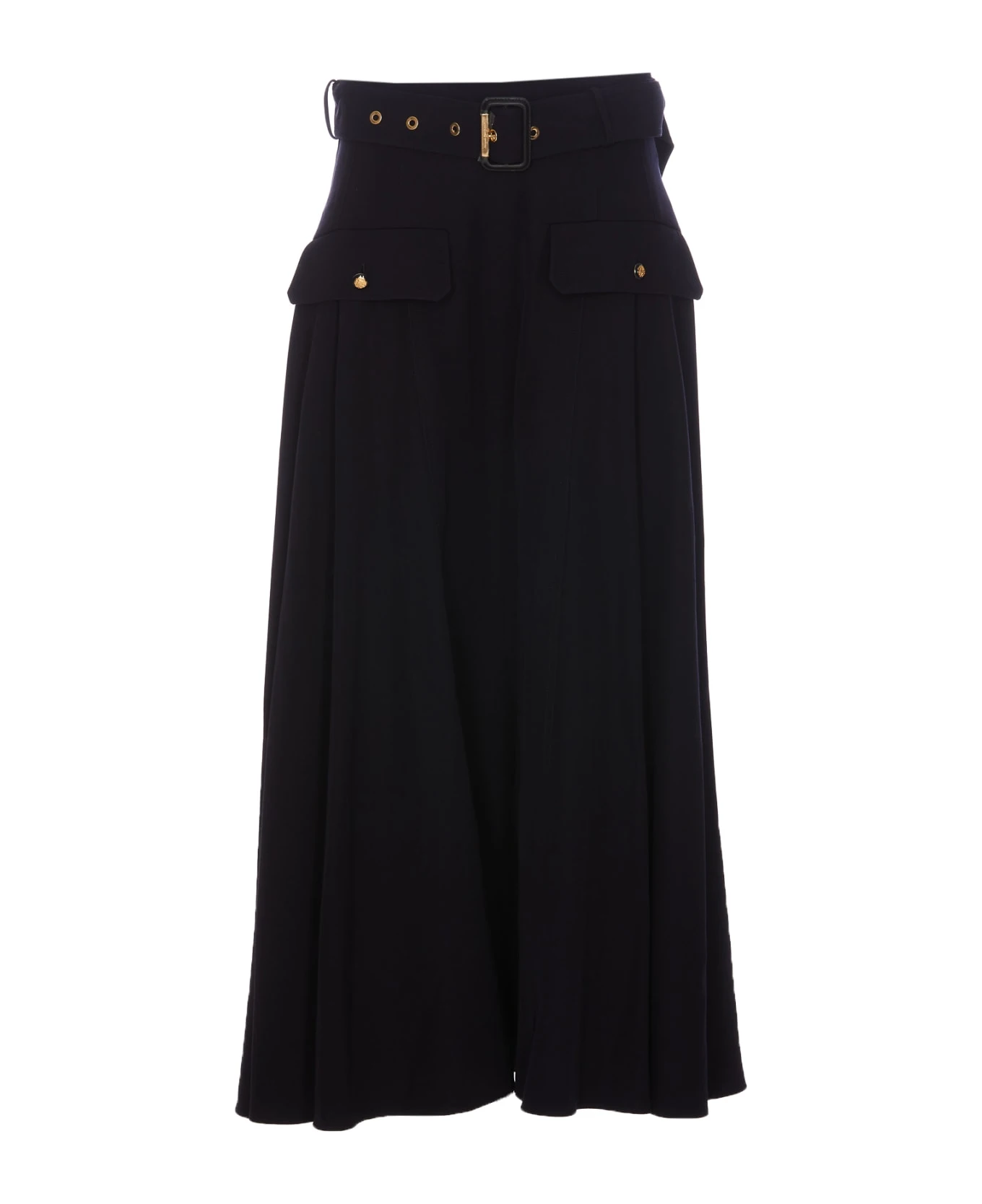 Alexander Mcqueen blue long skirt, zip closure on the back, belt closure, high waist, pockets with golden button