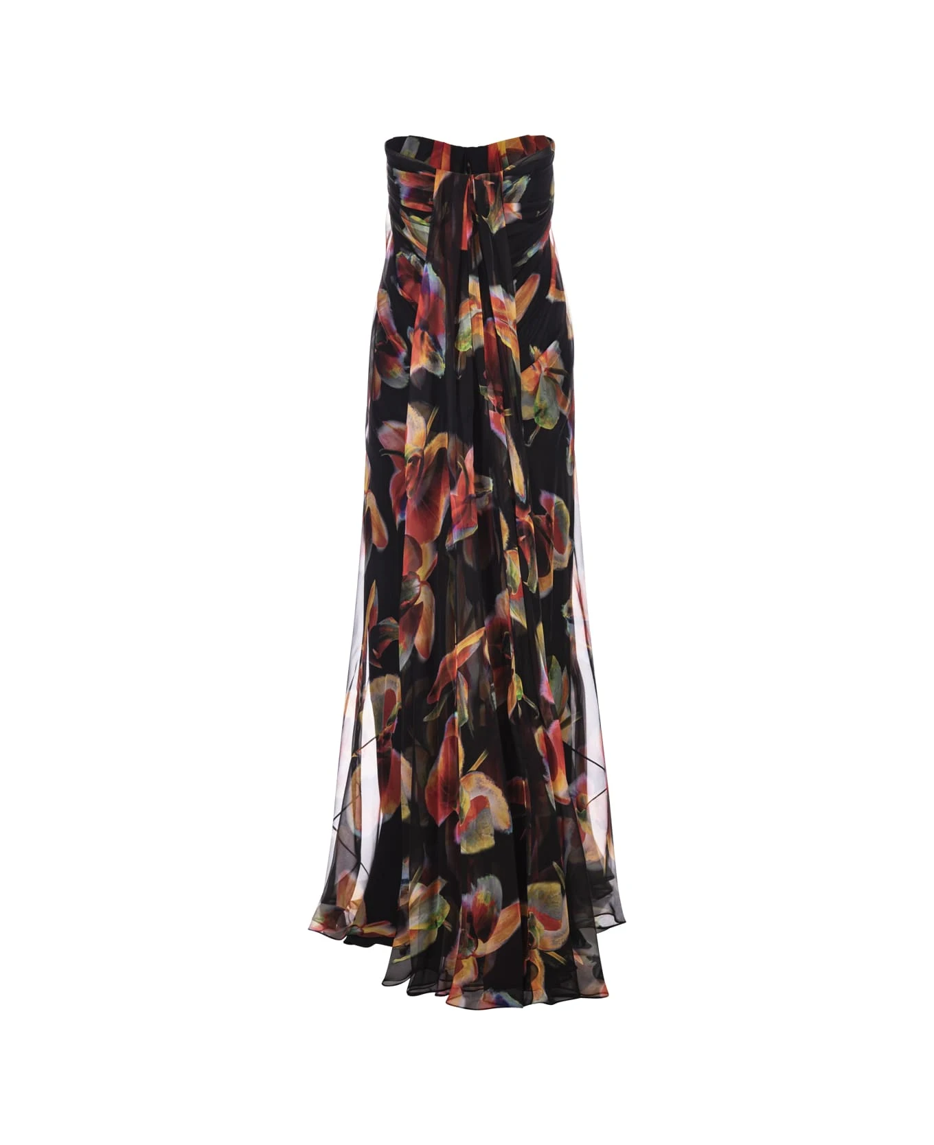 Alexander McQueen long bustier dress in black chiffon with all-over Solarised Orchid print. Featuring a sweetheart neckline, draped details and a back zip fastening. Article made from organic silk yarn.