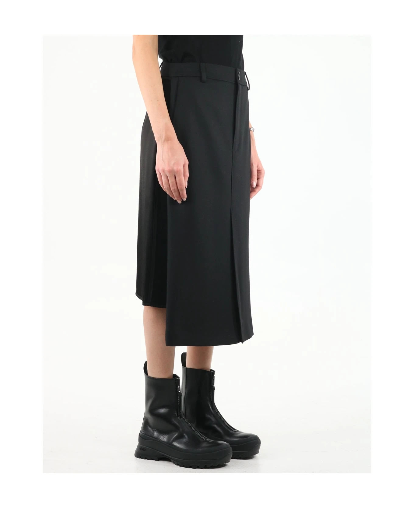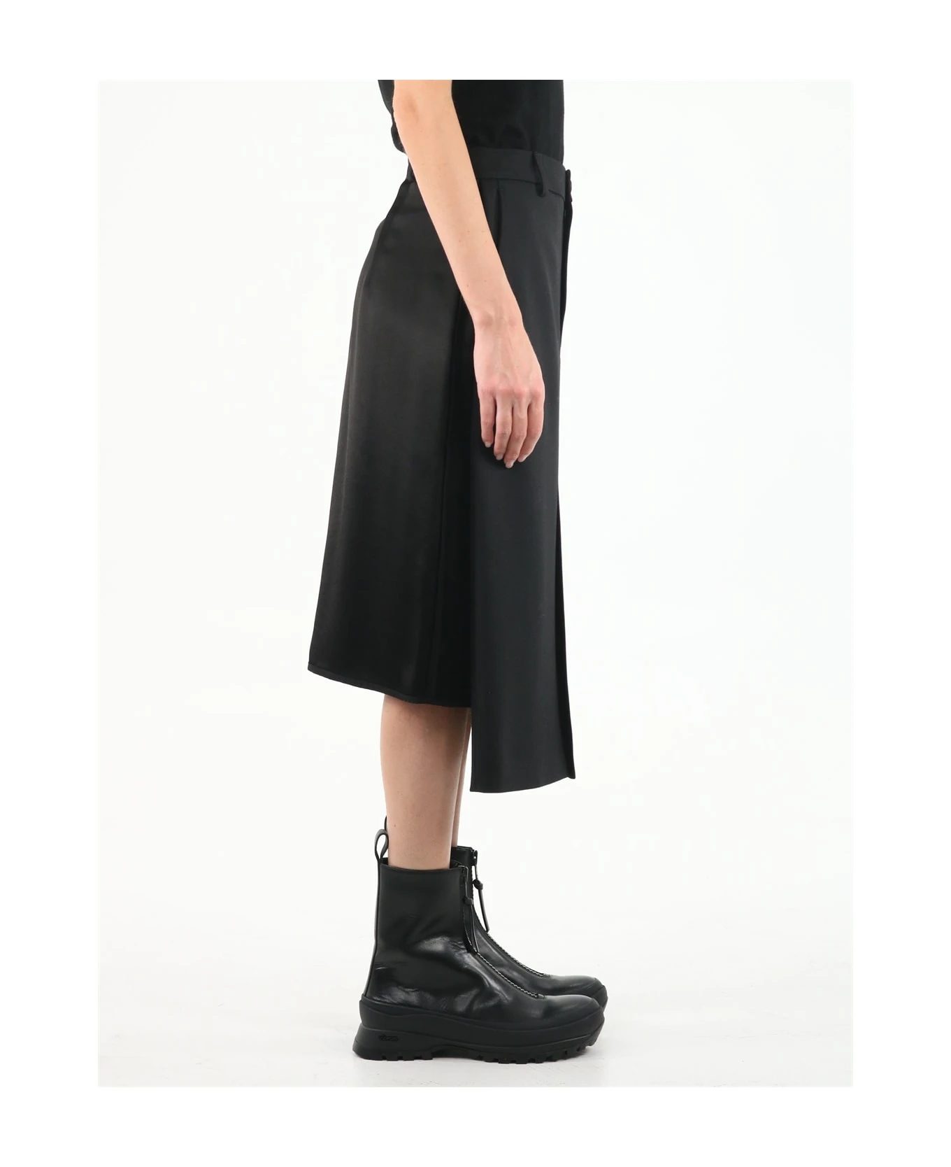 Satin skirt with a front wool skirt-style decorative panel, and a zip concealed fastening at the back.