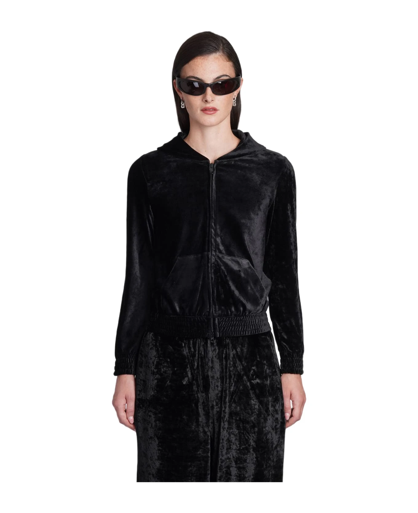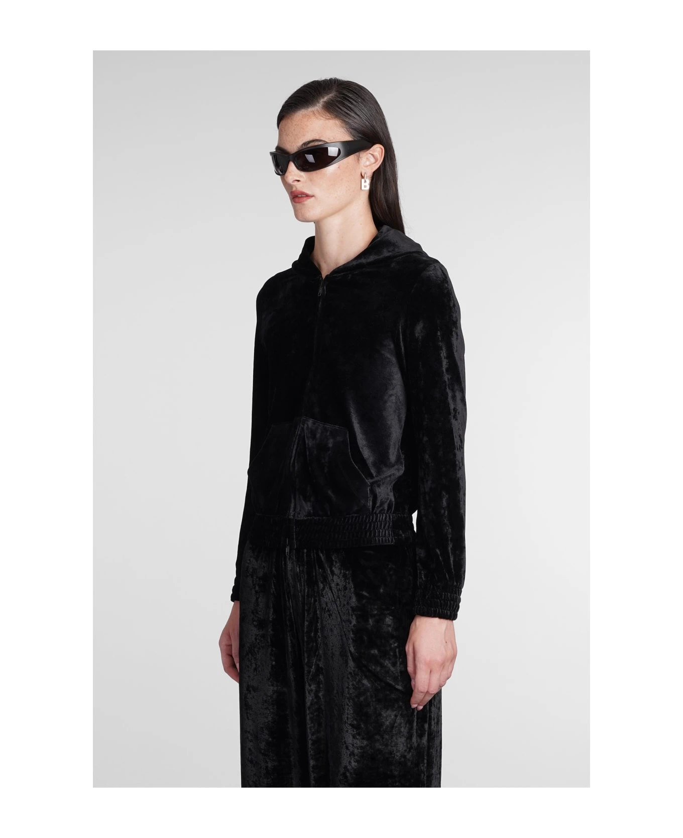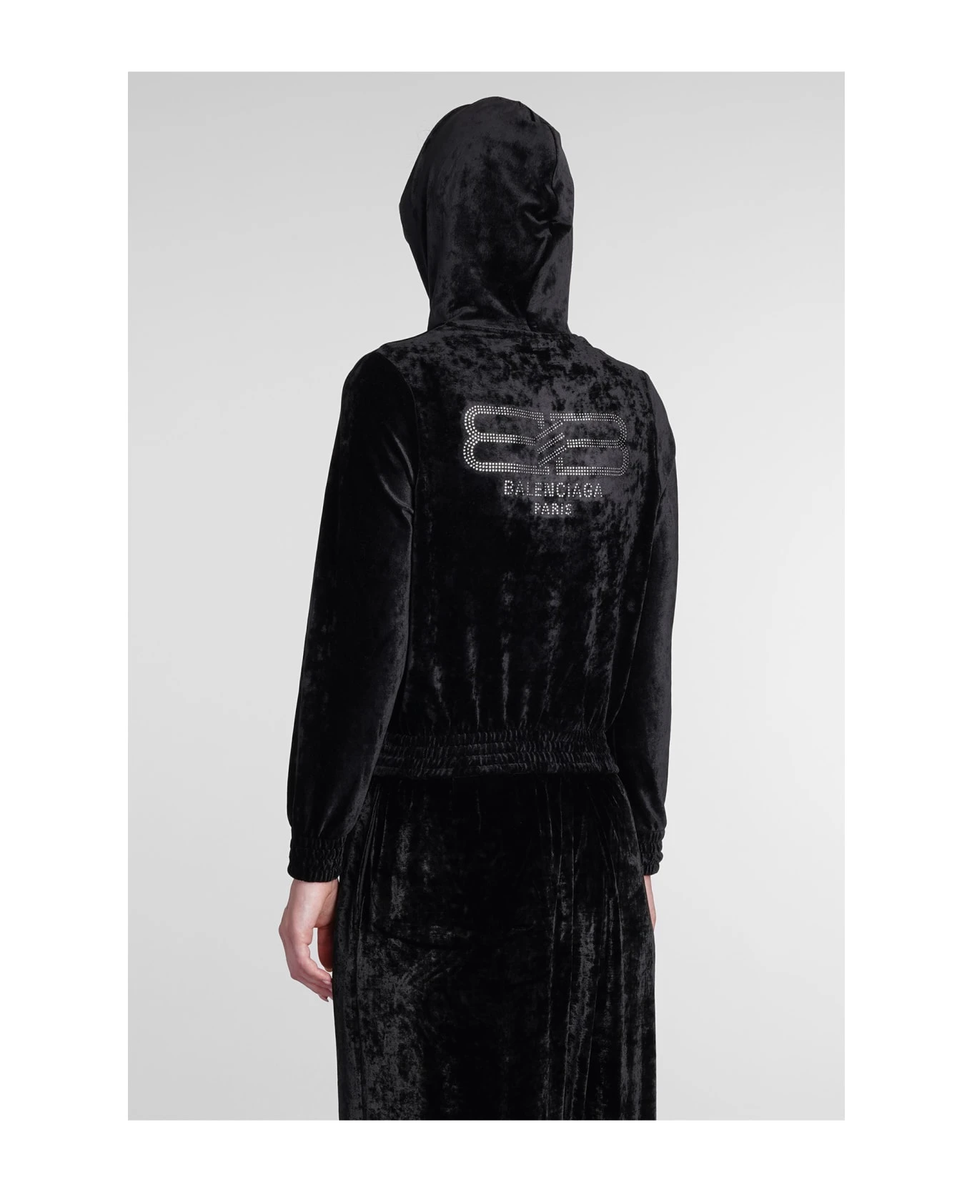 Sweatshirt in black viscose, hood, pockets, zip clousure, crystals detail, chenille texture, 79% viscose, 19% polyamide, 2% elastan, Made in Portugal, Model is 180 cm and wears 36