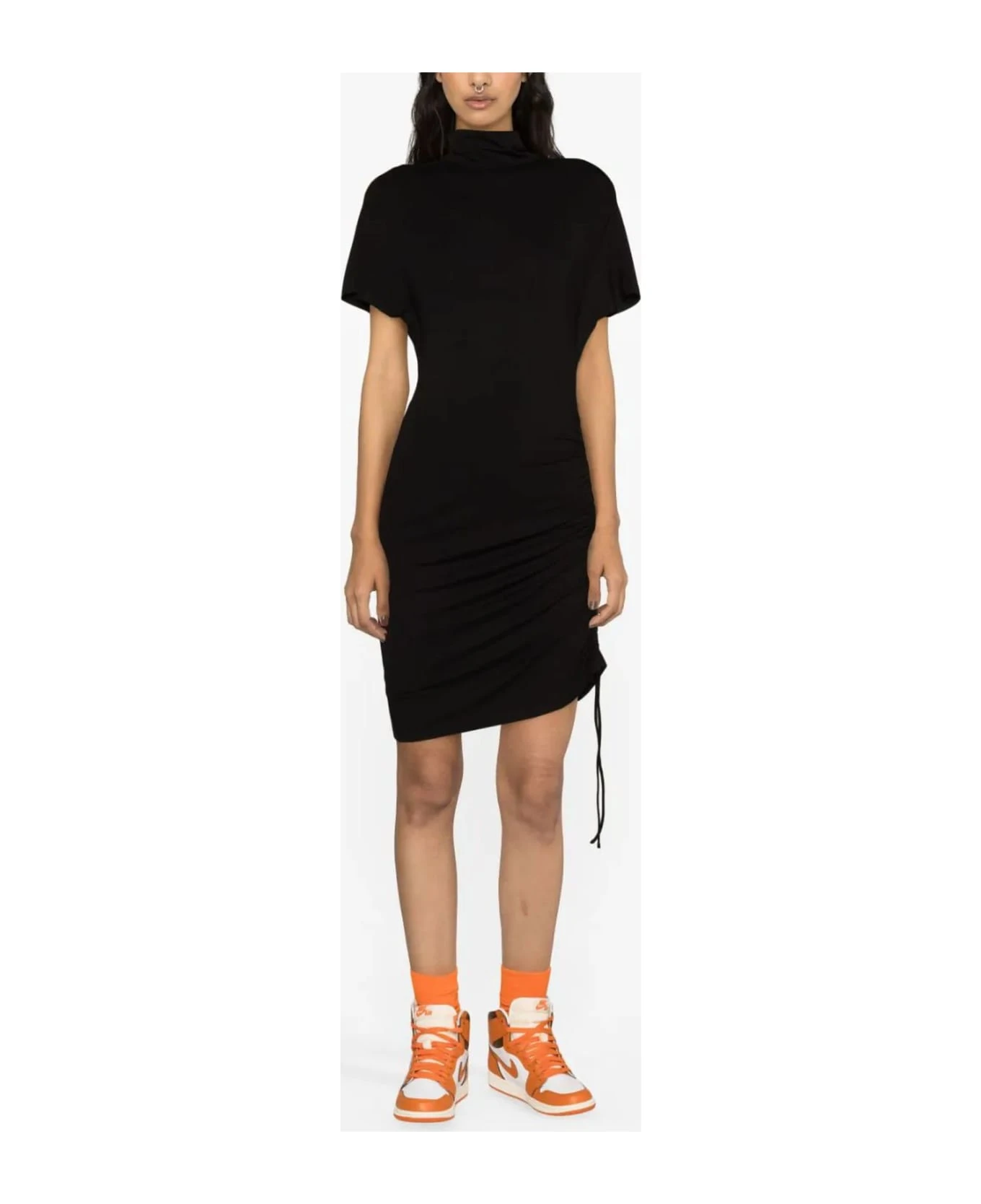 Black Lya draped-design dress, stretch-design, draped design, high neck, keyhole detail to the rear, single rear button fastening, short sleeves, asymmetric hem