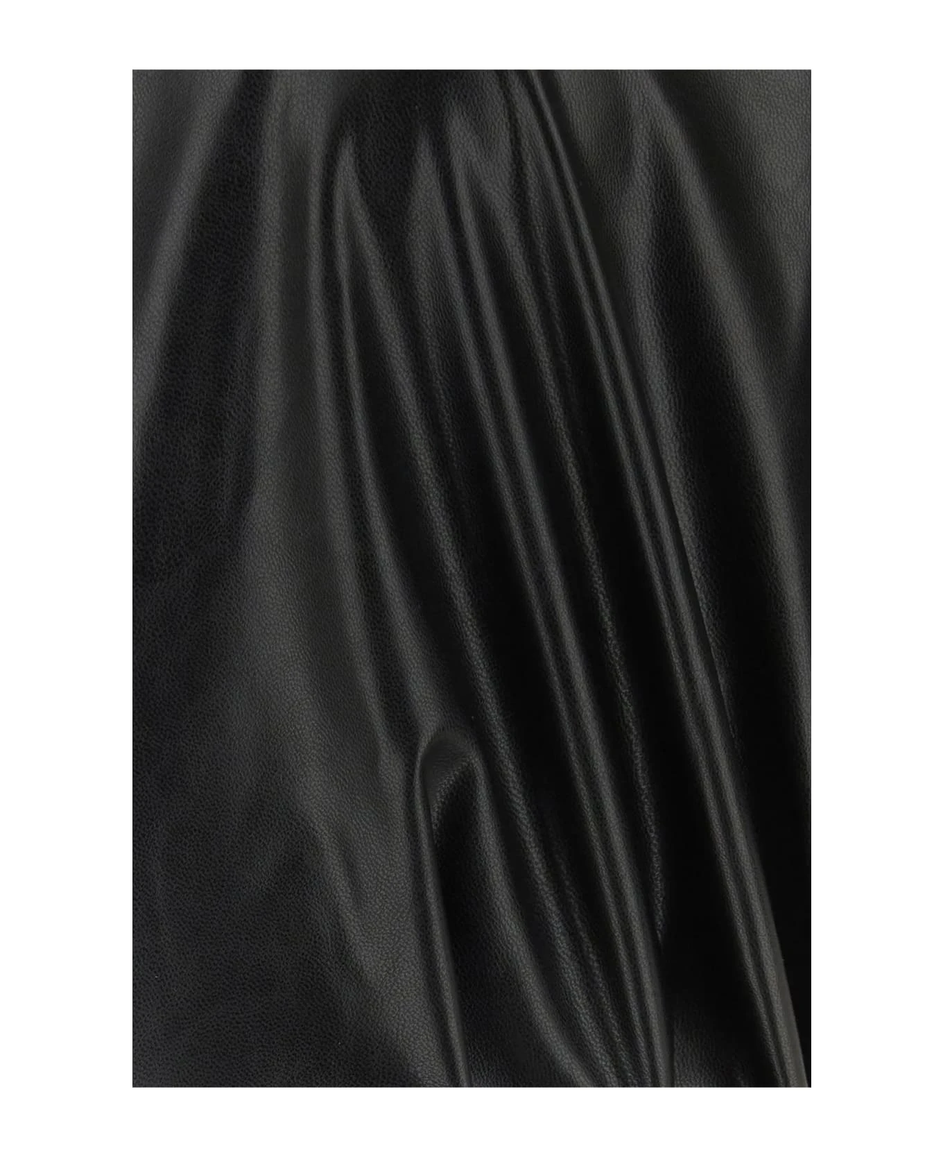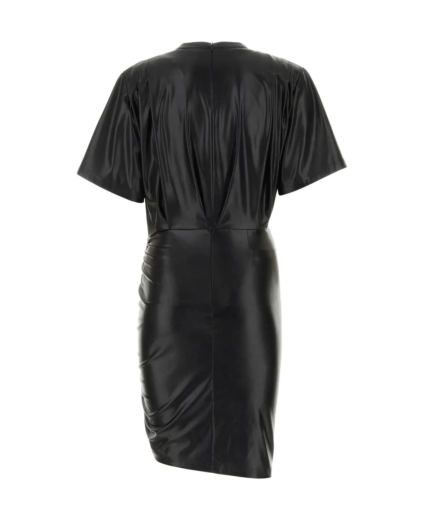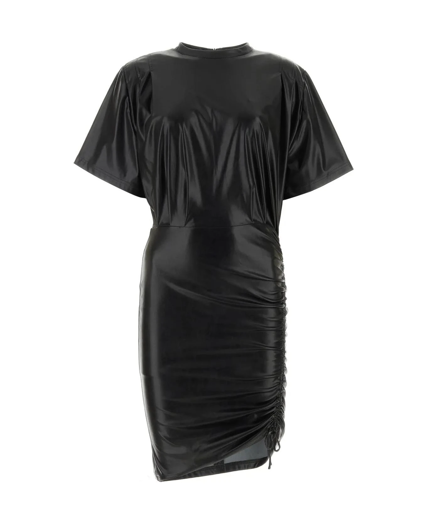 Dress realized in synthetic leather characterized by gathering with laces to tie on the side.