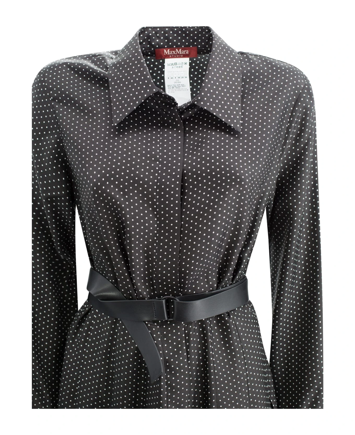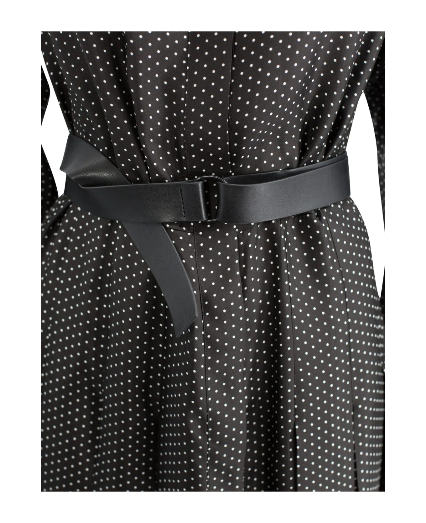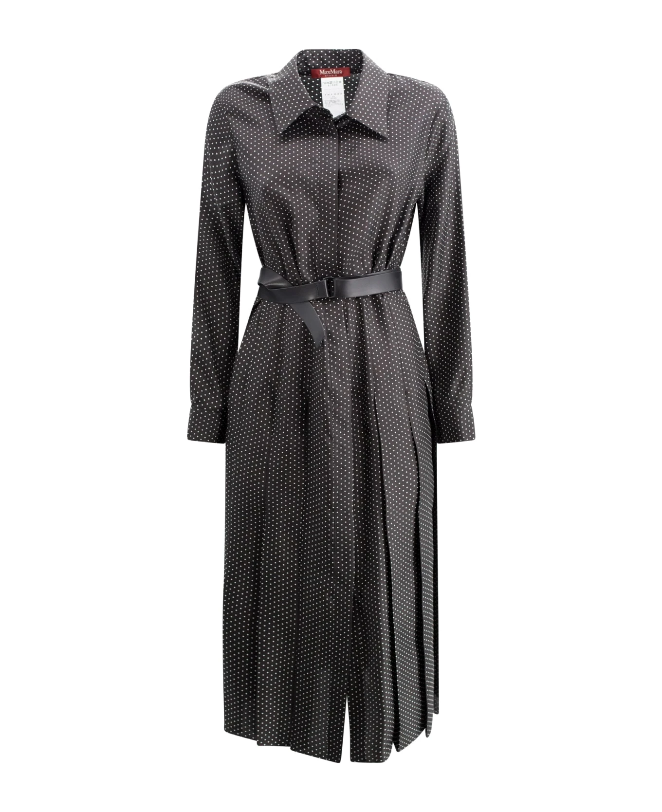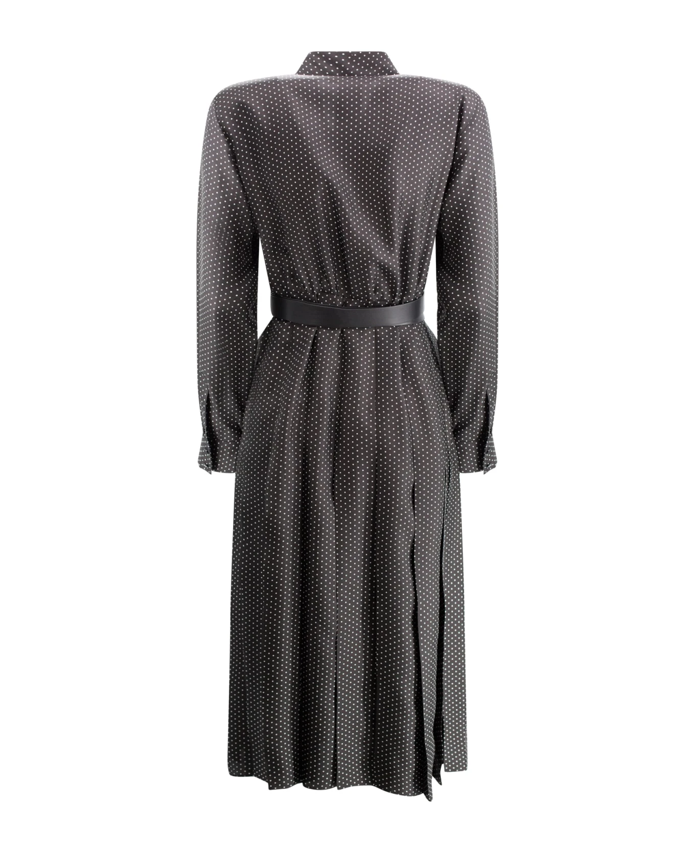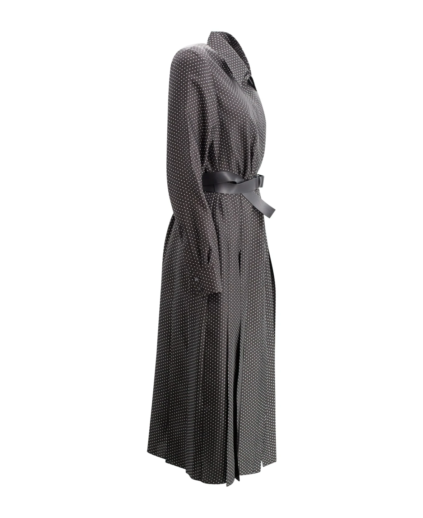 Chemisier midi dress in precious printed pure silk twill. Shirt collar, long sleeves with cuffs at the bottom, pleated skirt. The matching belt defines the waist. Front closure with hidden buttons.