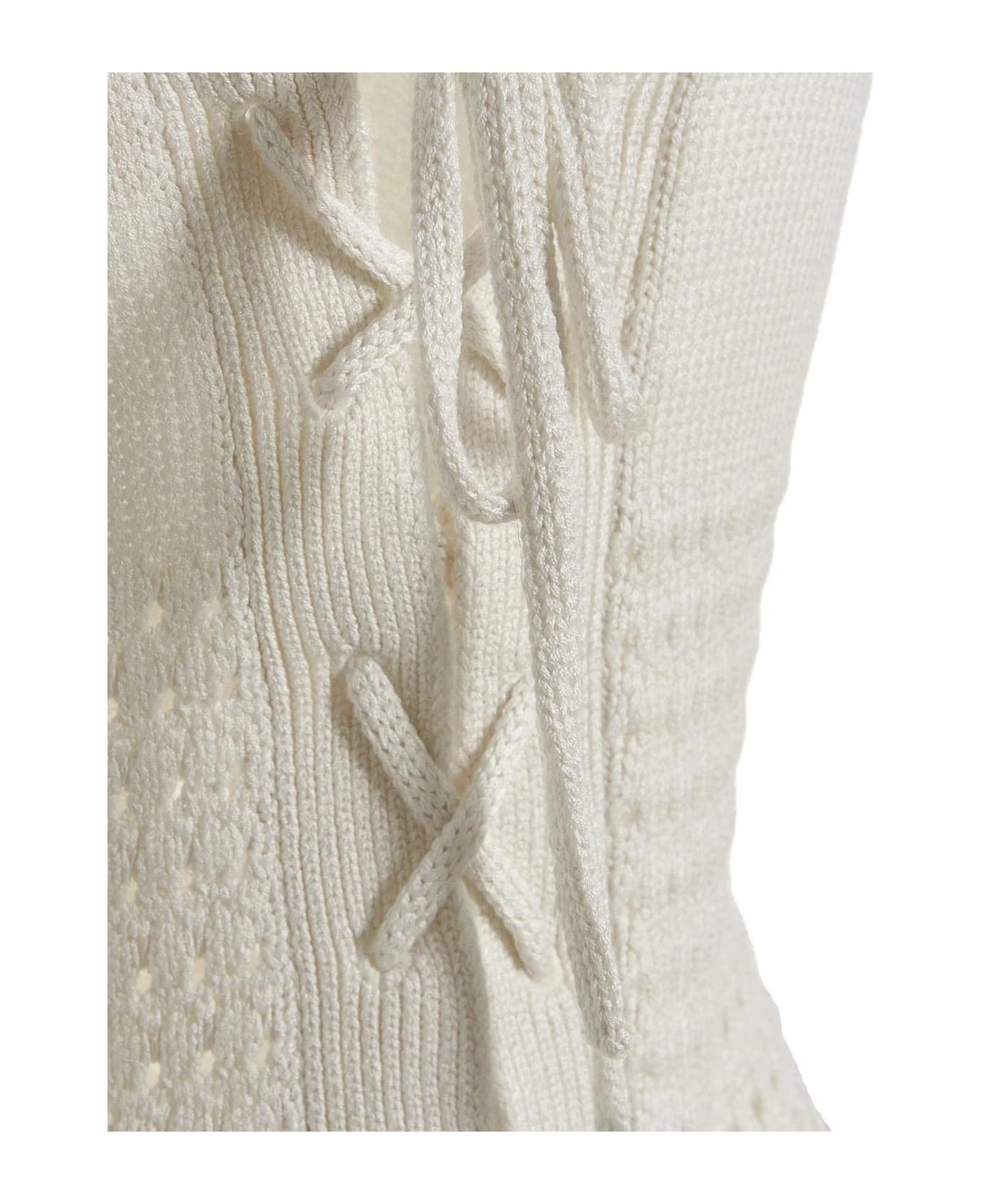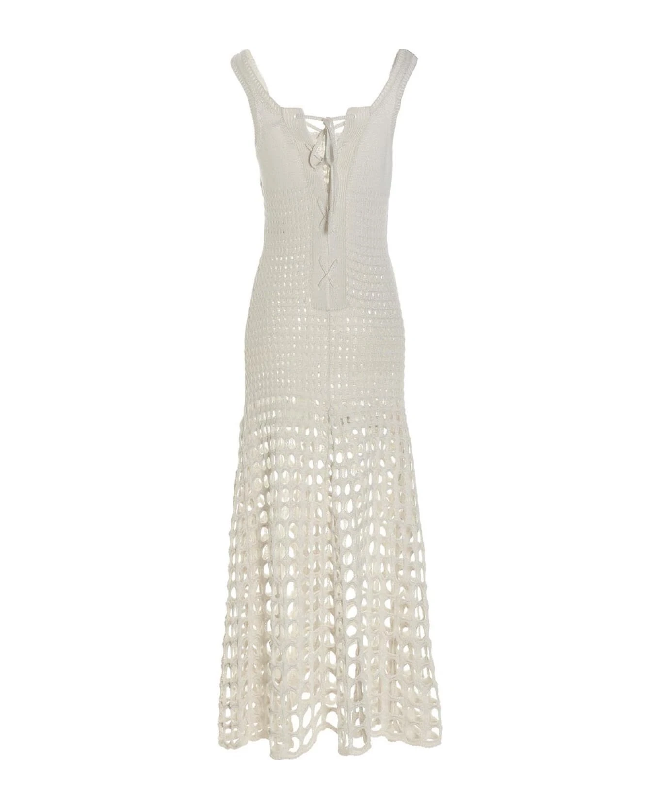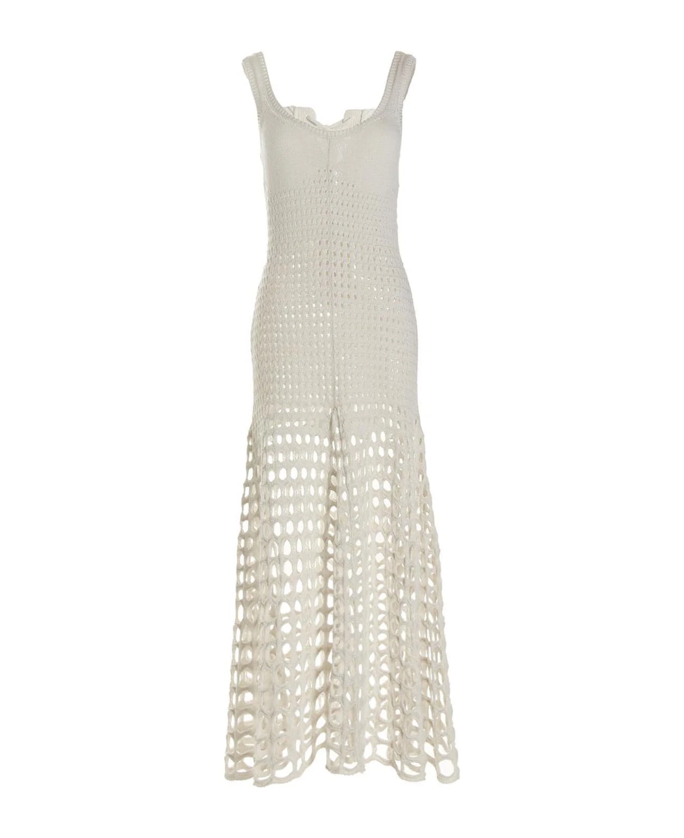 Long macramè silk sleeveless dress with shoulder straps, front fastening detail.