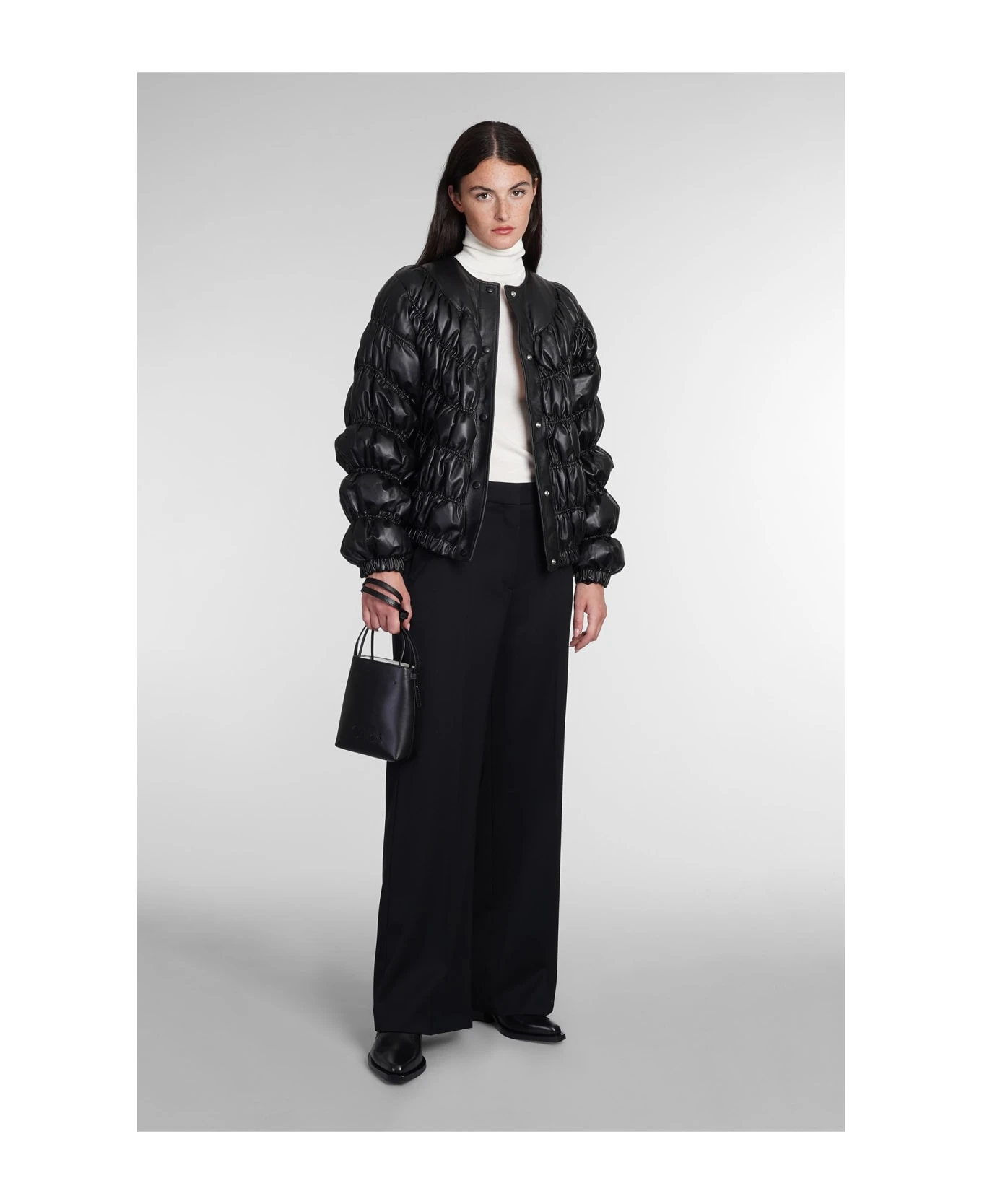 puffer in black leather, gathered detailing, round neck, long sleeves, automatic buttons, elasticized cuff and bottom, 100% leather, Made in Italy, Model is 180 cm and wears 36
