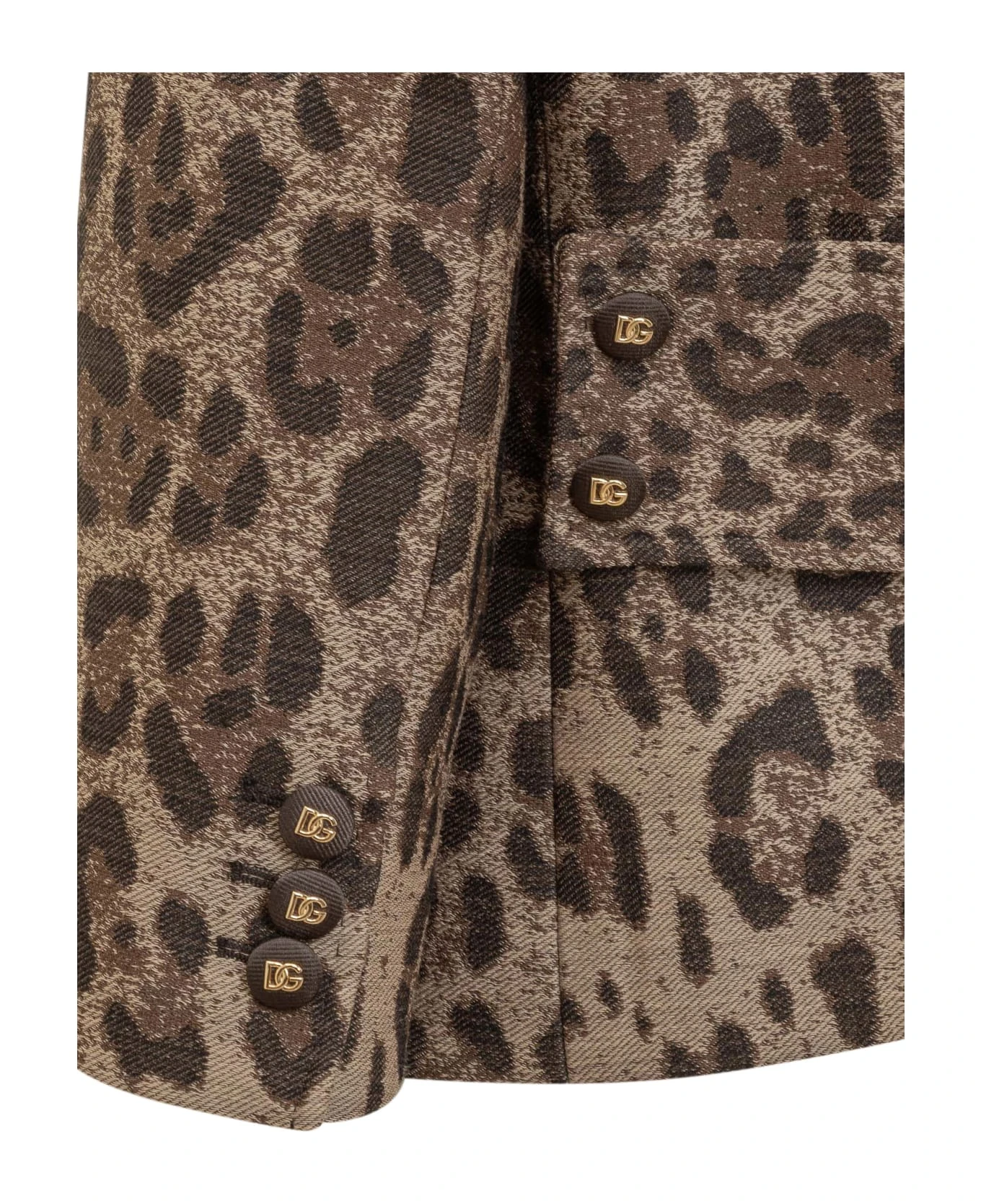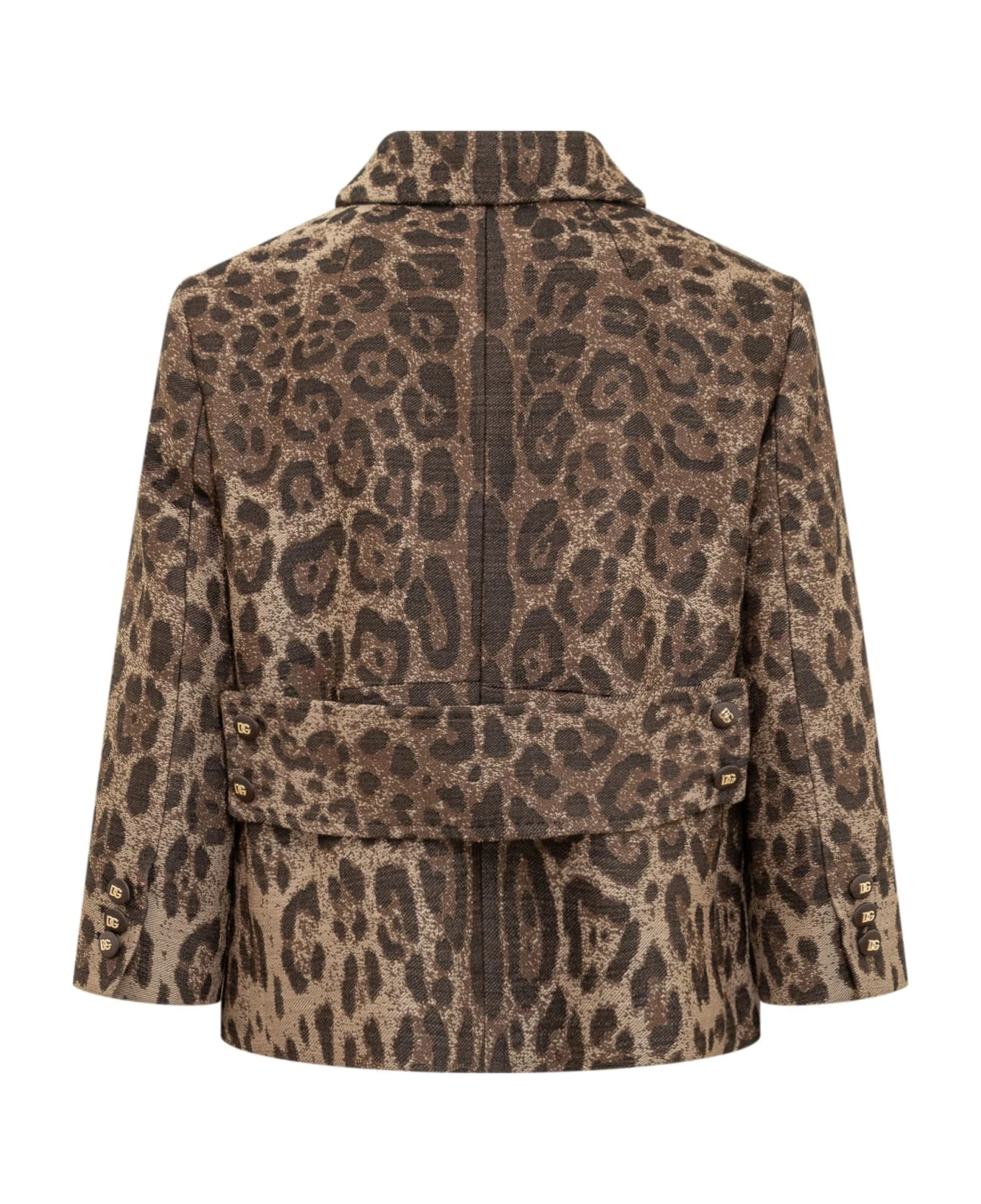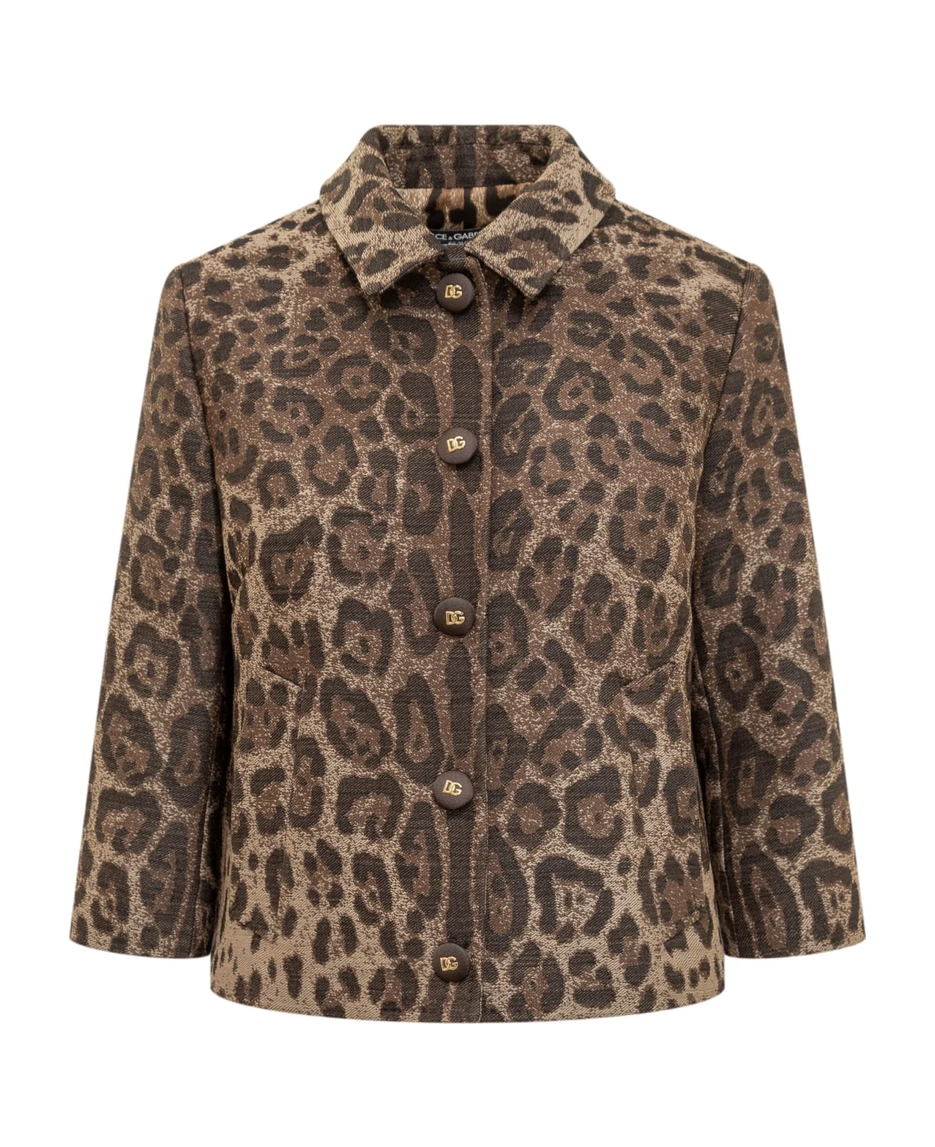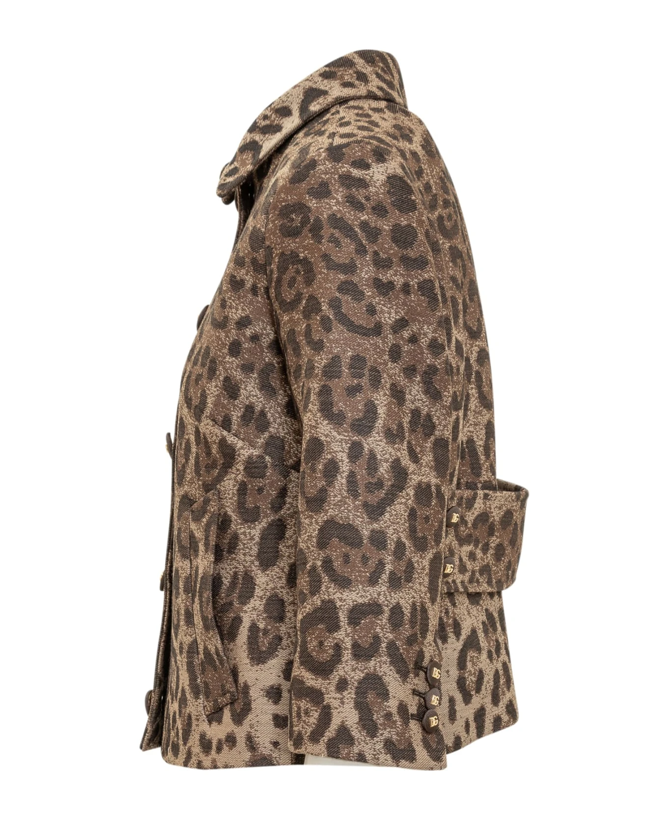 Brown jacket with long sleeves. Front closure with buttons and clips. Animal print. Side pockets. Band on the back. Buttons on the wrists with logo.