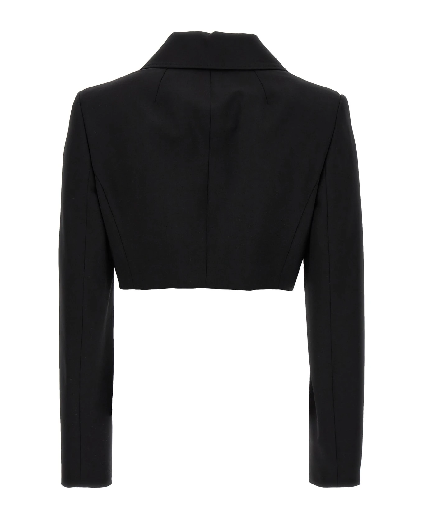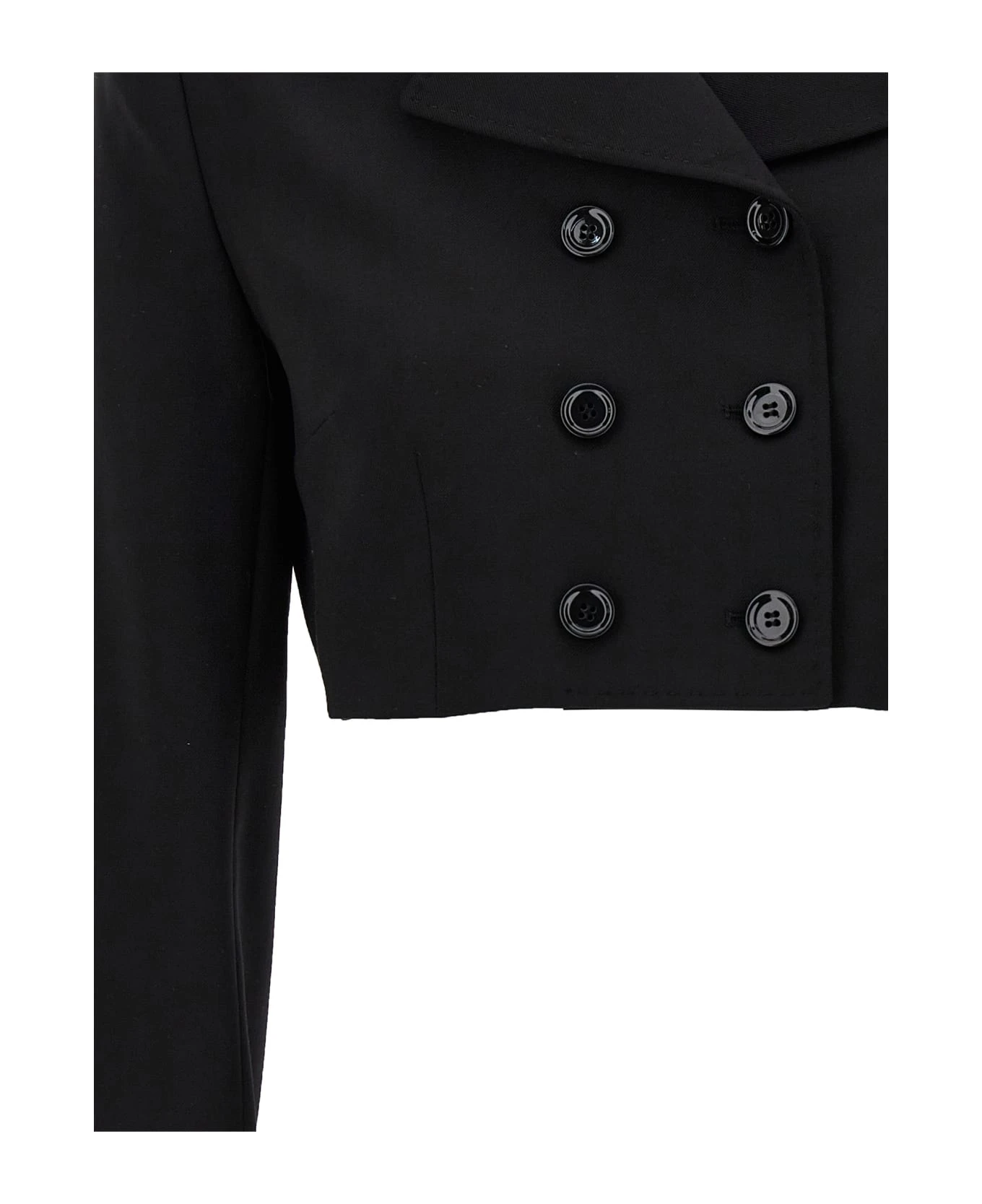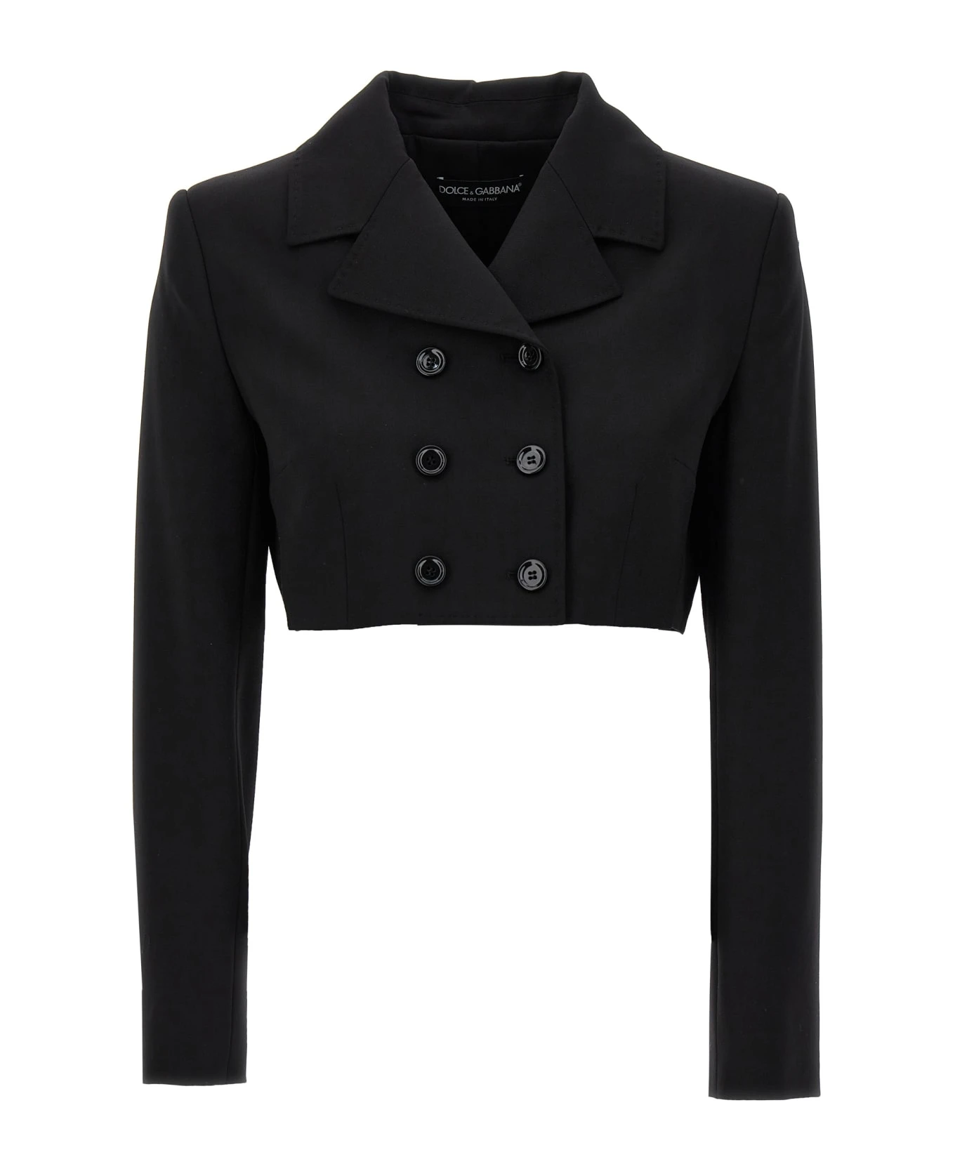 ‘Black DNA’ double-breasted cropped stretch wool blazer with button closure and long sleeves.