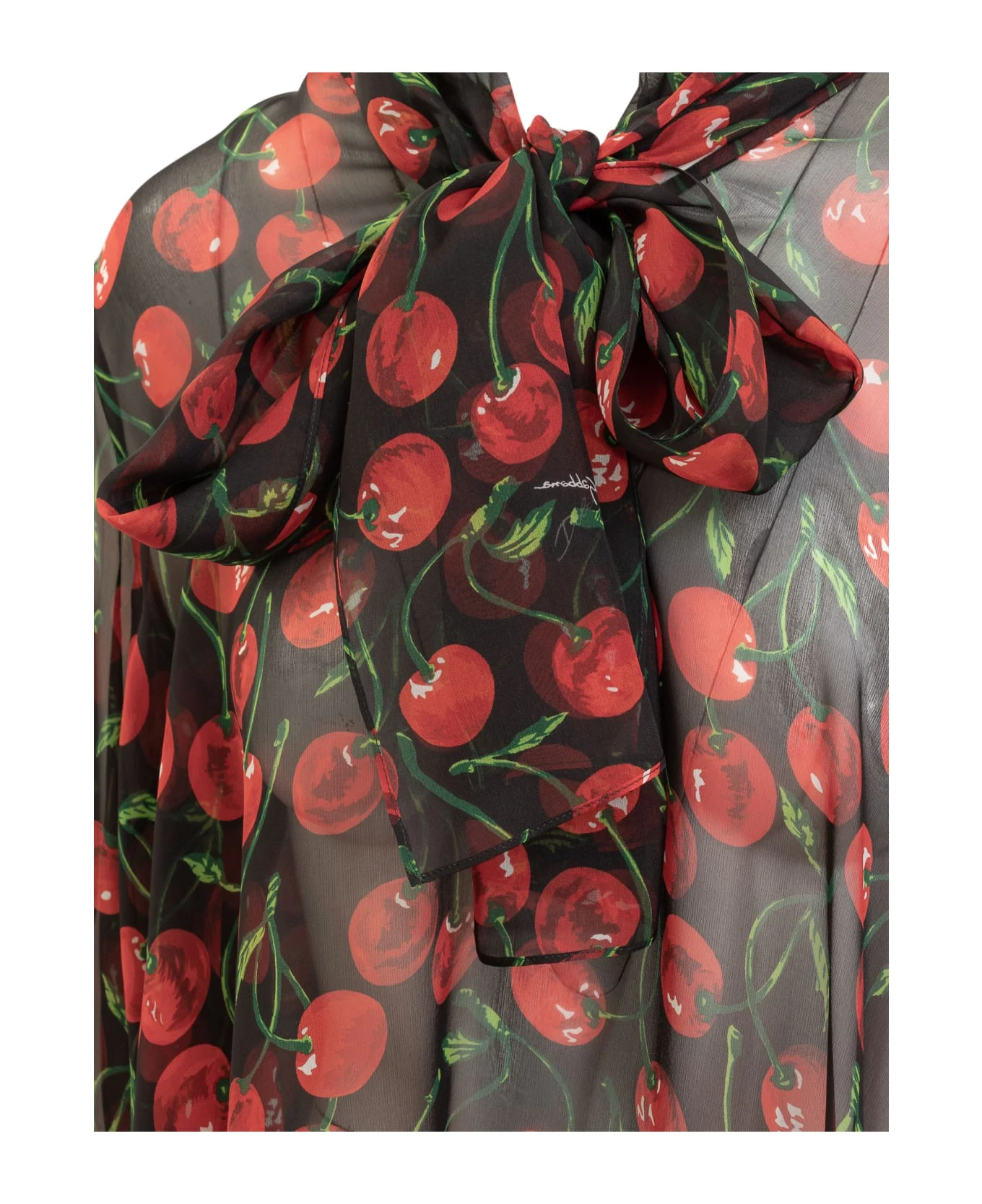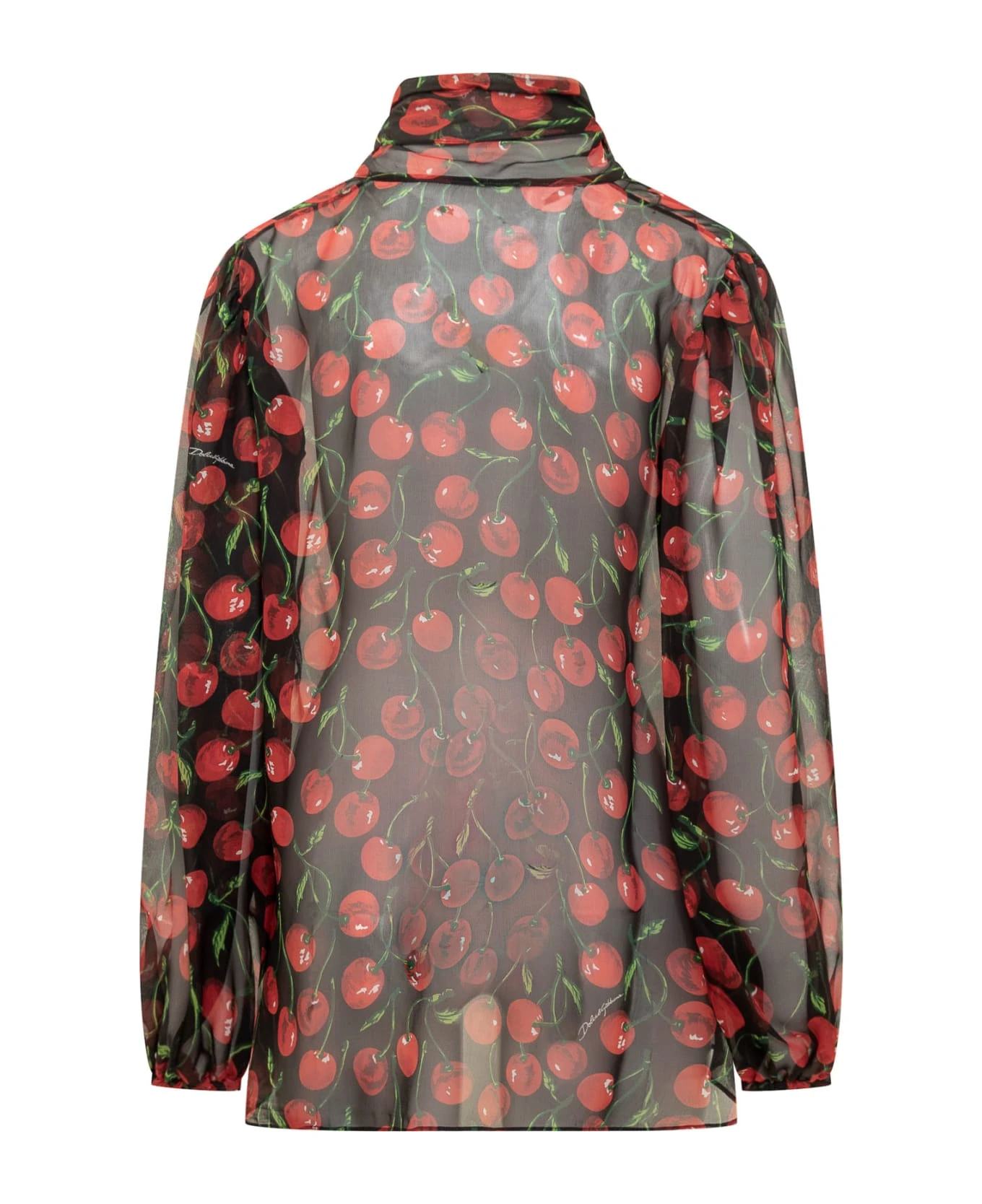 Long sleeve blouse. High neck with bow detail. All-over cherry print. Transparent effect.