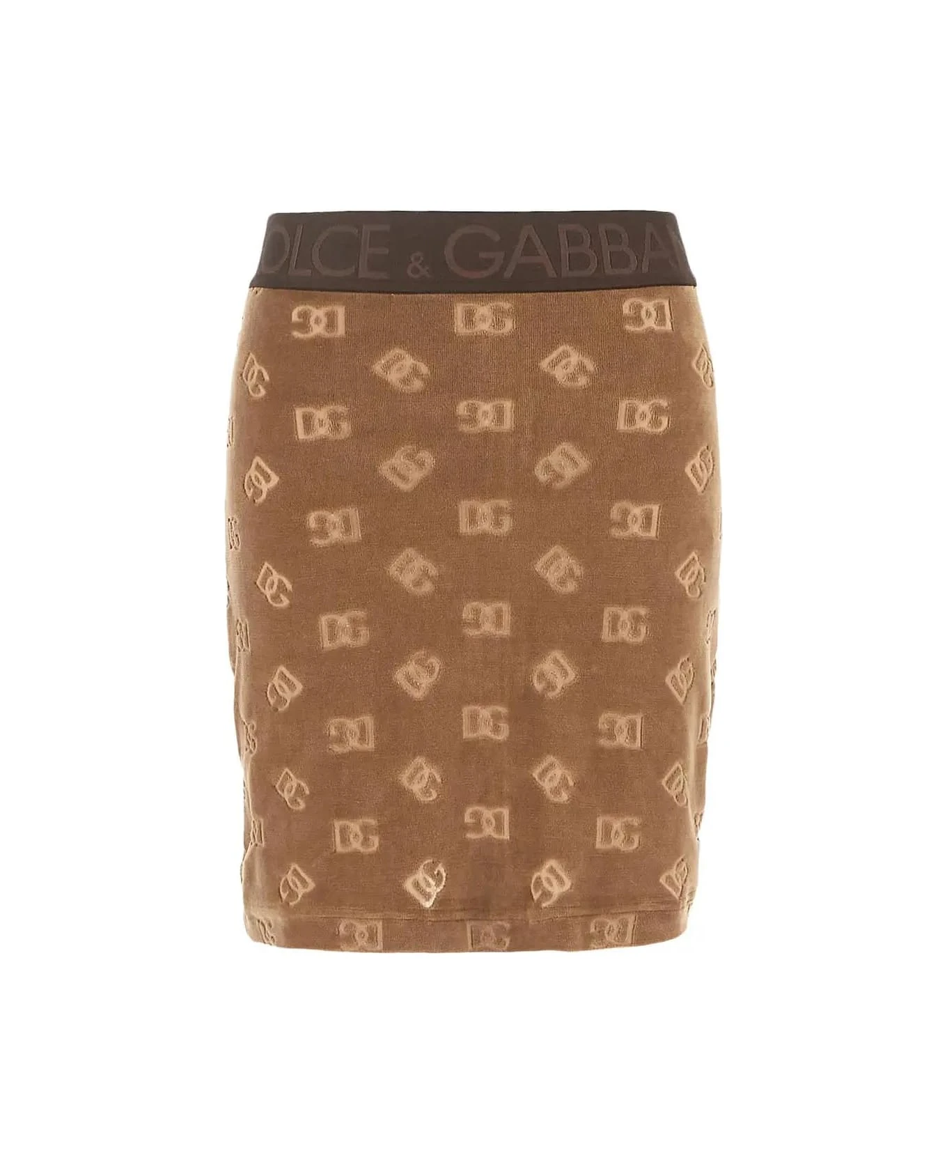 Dolce & Gabbana mini skirt in medium beige velvet cotton with all-over DG logo motif, back zip and hook-and-eye closure and dark brown branded elastic waistband.