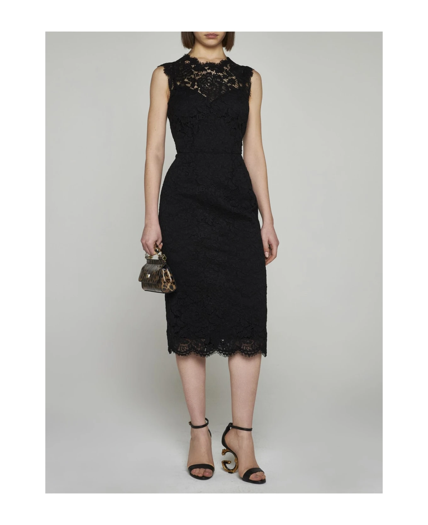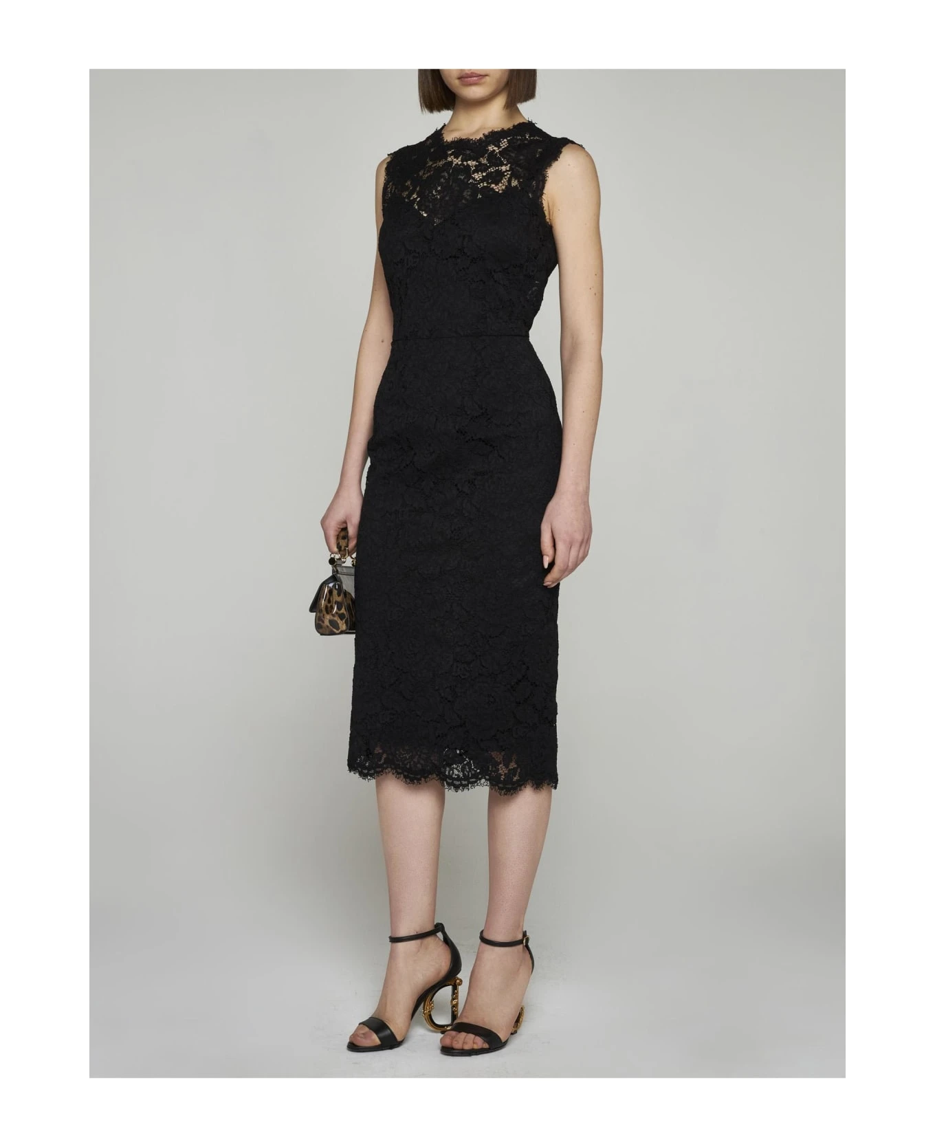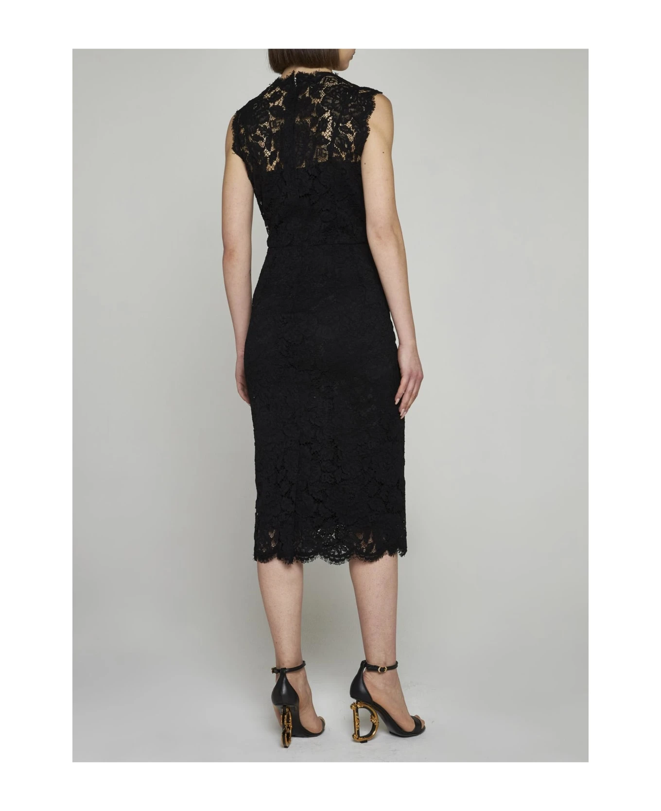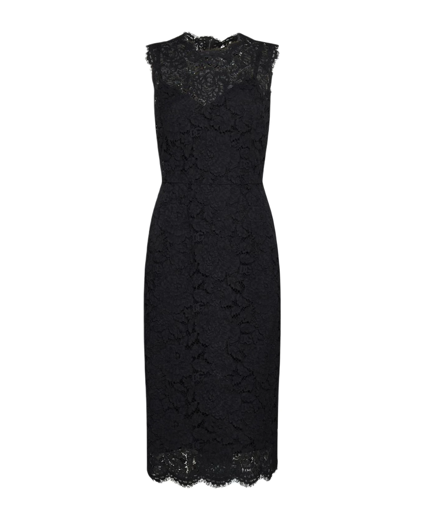 Dolce & Gabbana’s lined black viscose and cotton blend lace midi pencil dress featuring a crew neck, doubled bodice, center back zip fastening, fitted silhouette and scalloped edges.