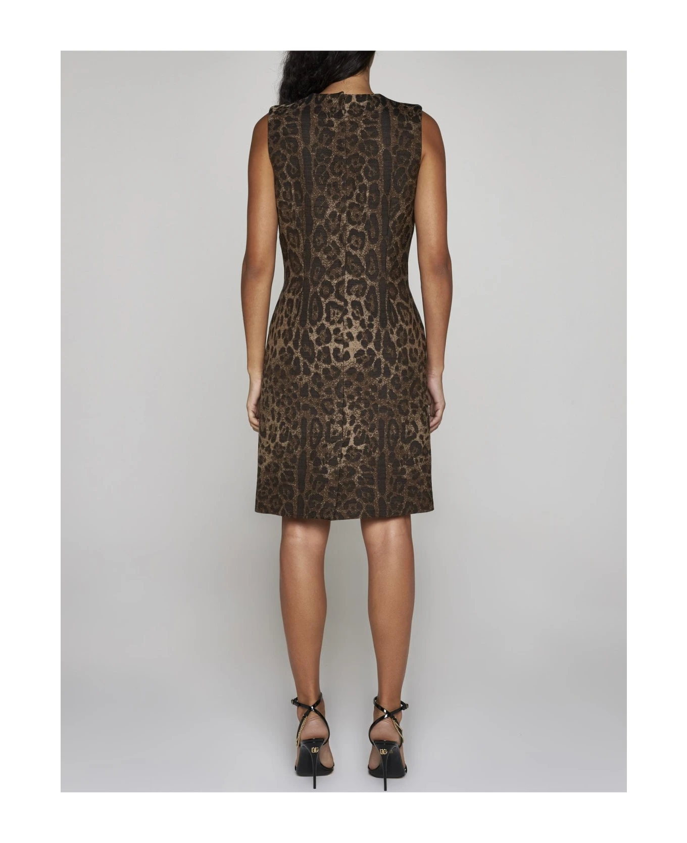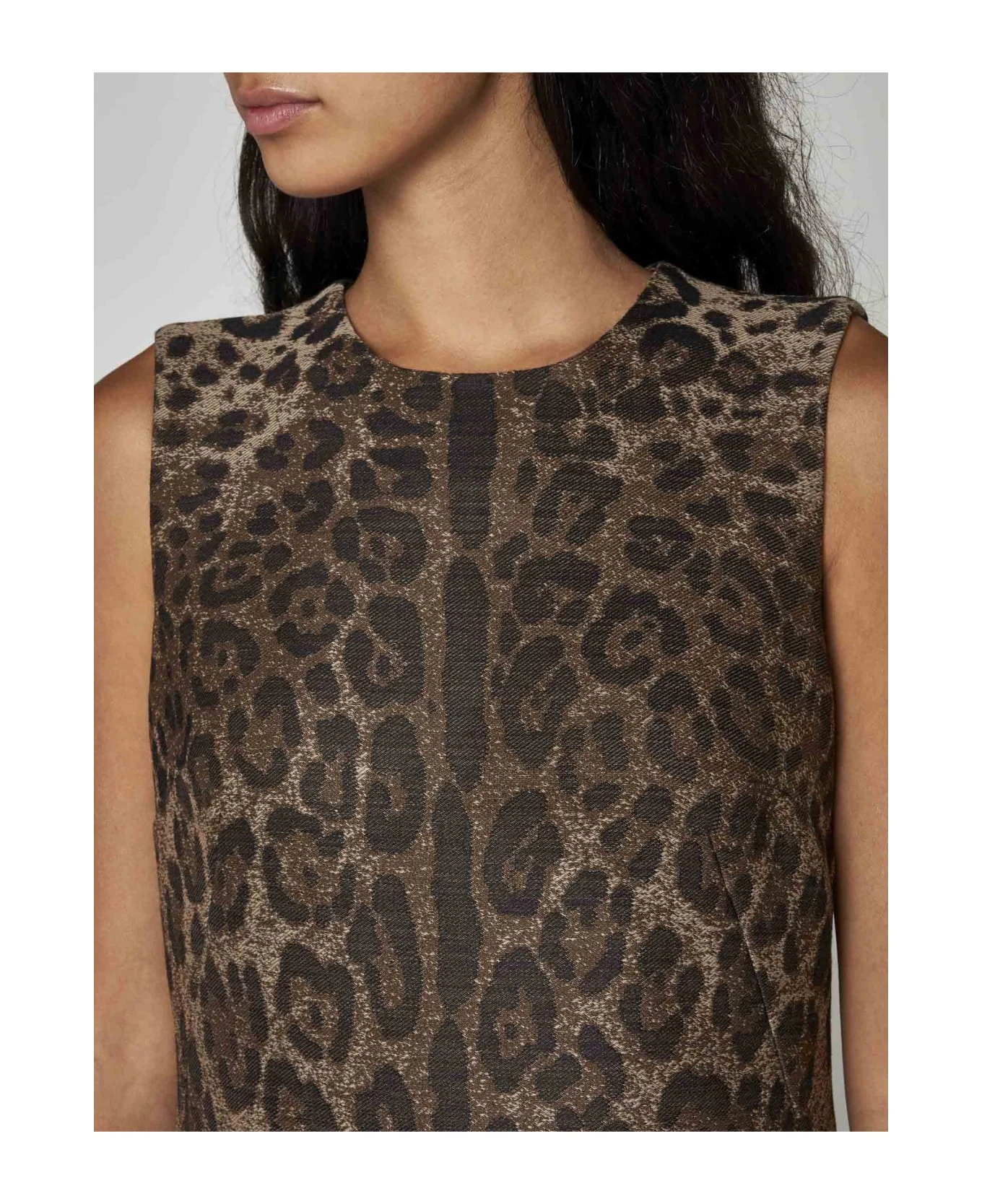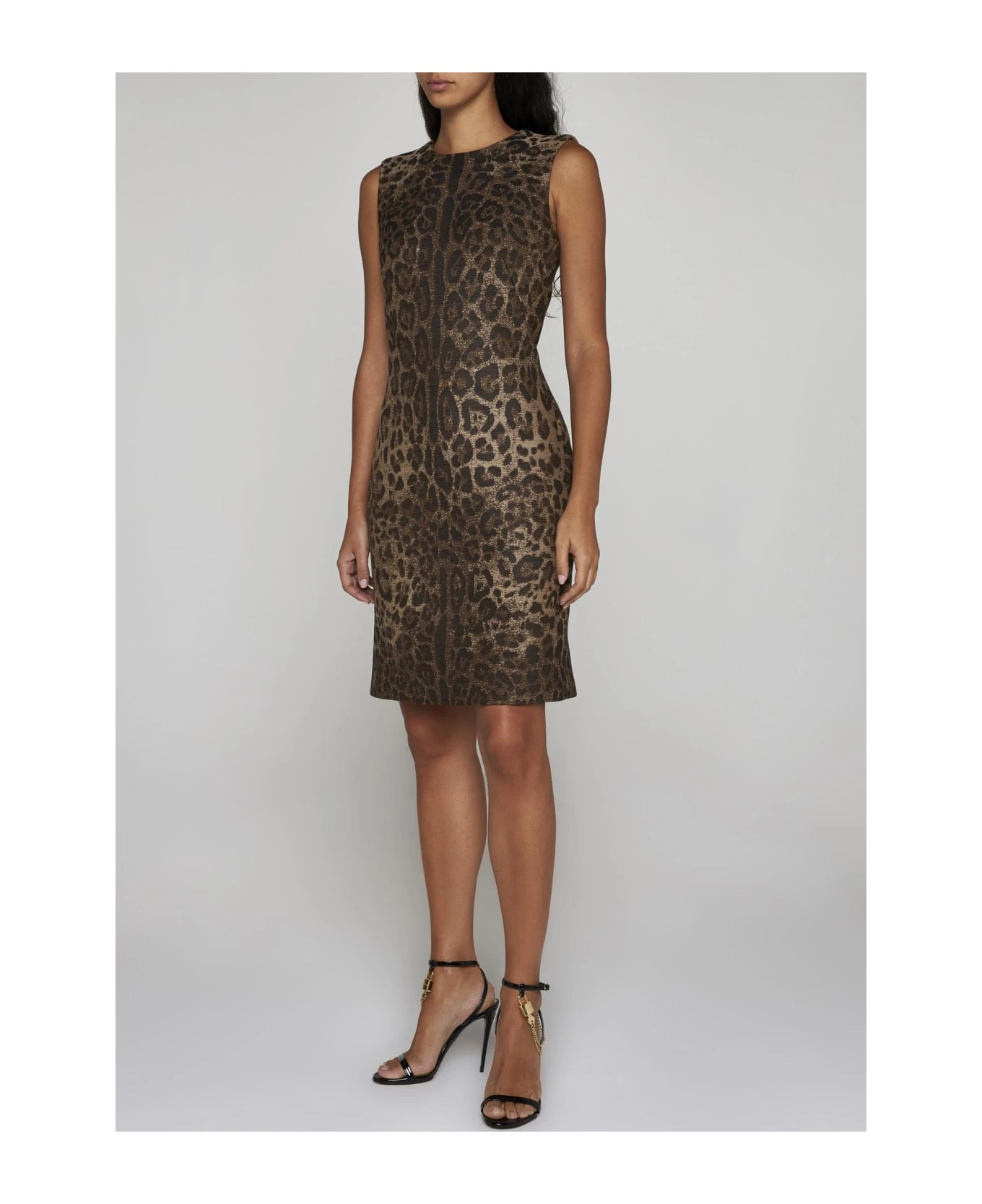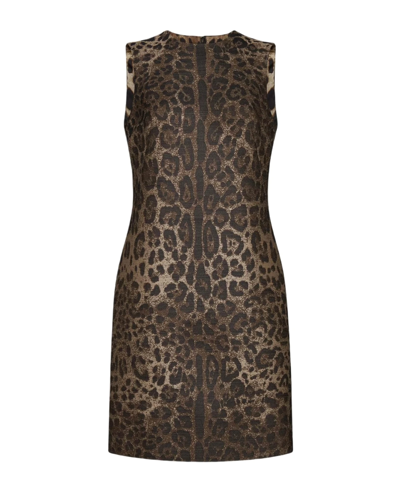 Dolce & Gabbana’s leopard print stretch virgin wool sheath dress featuring a crew neck, zip fastening and slit at center back.