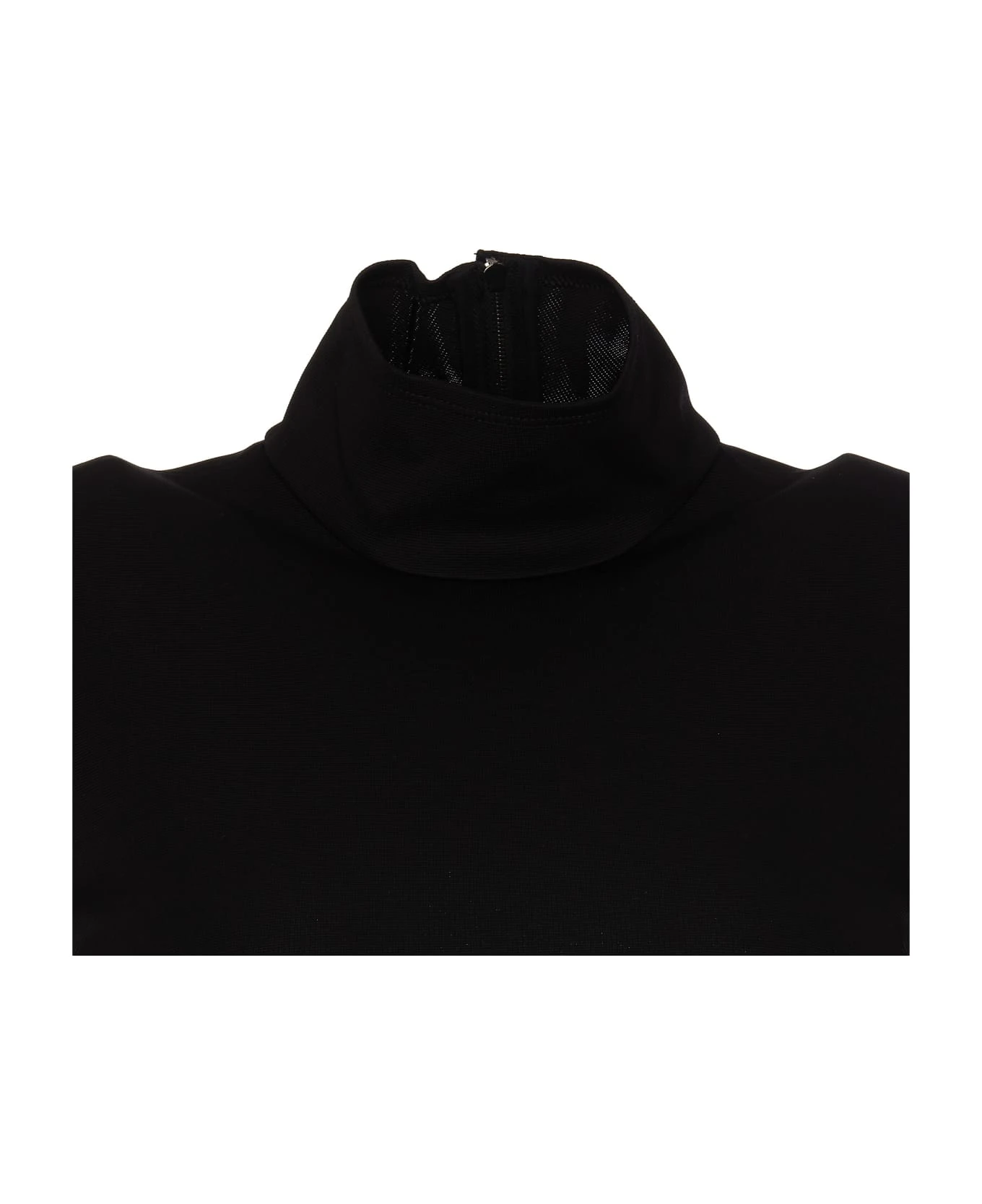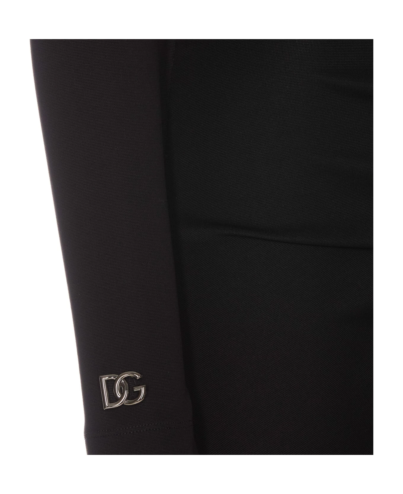 Dolce&Gabbana black mini dress, zip closure on the back, high neck, long sleeves, plaque logo on cuffs, tight fit