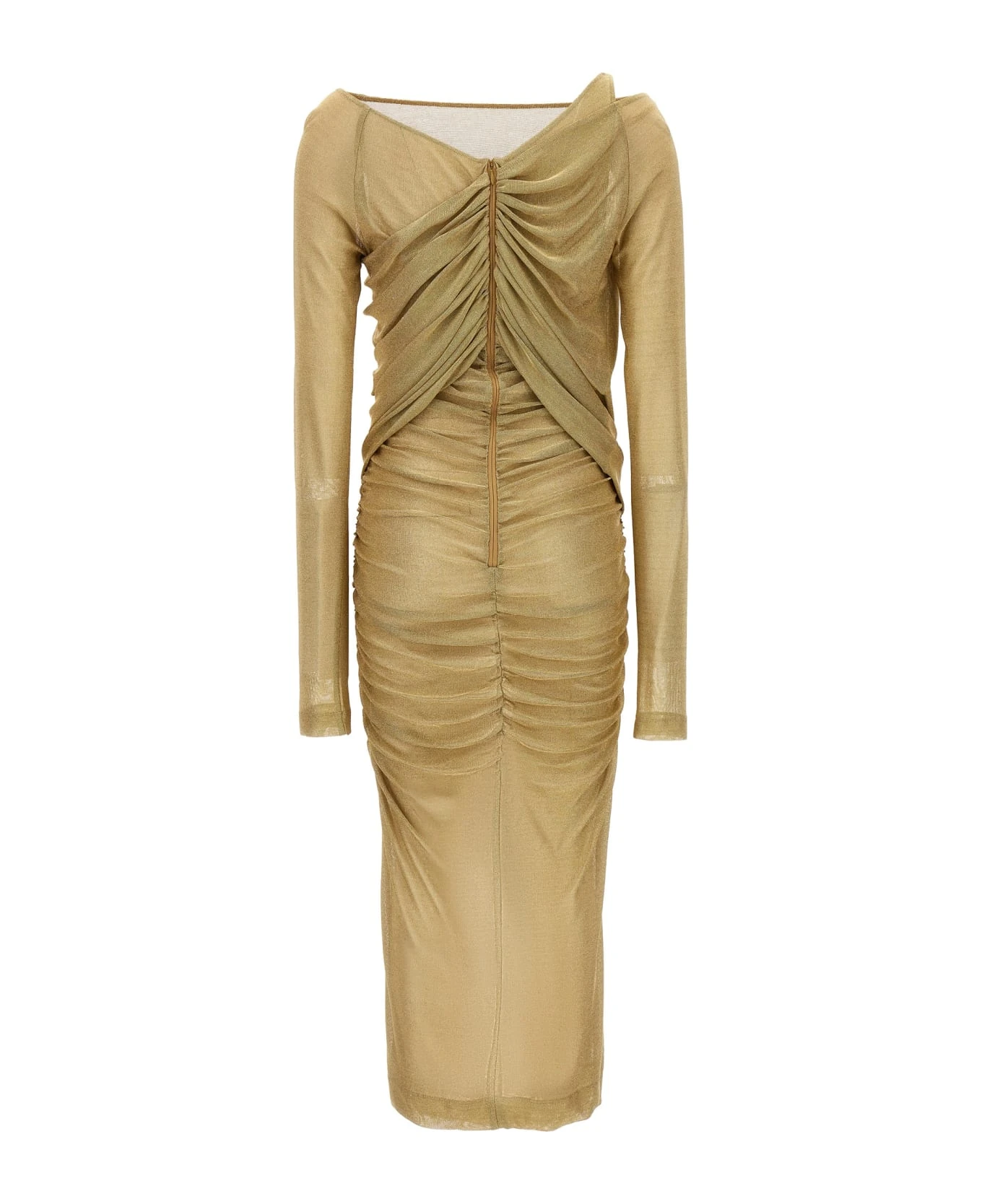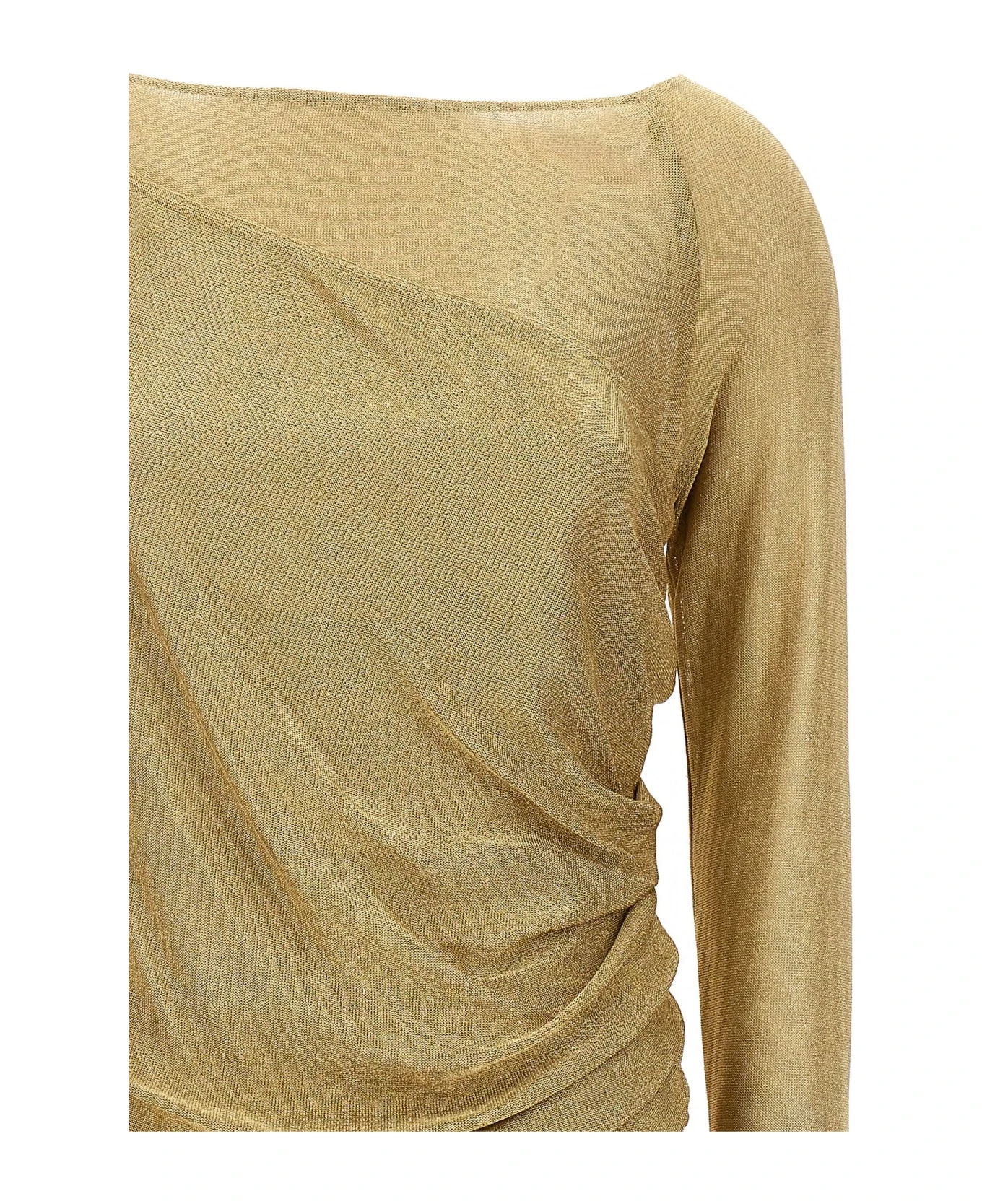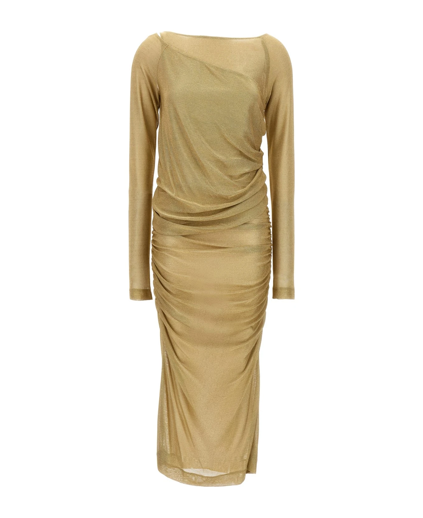 Lurex knit dress with straight neckline, long sleeves, side zipper closure, back draping.