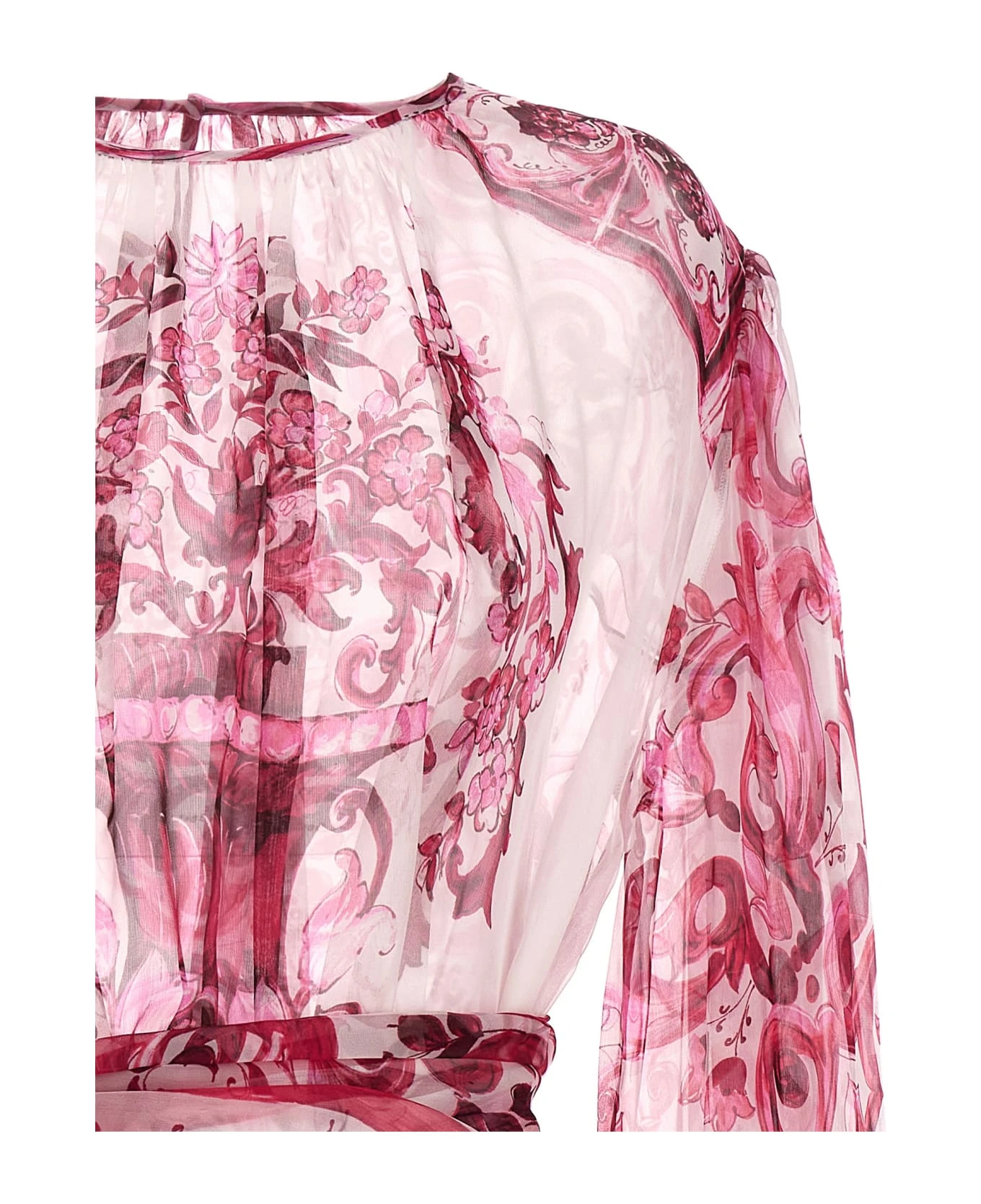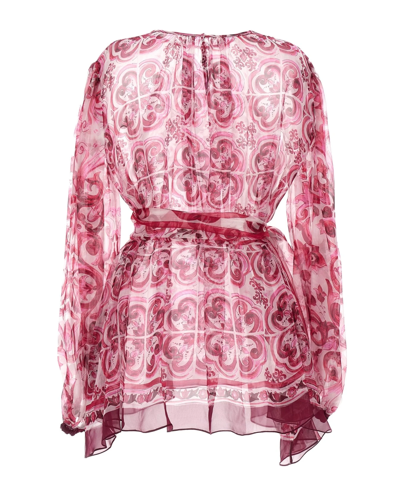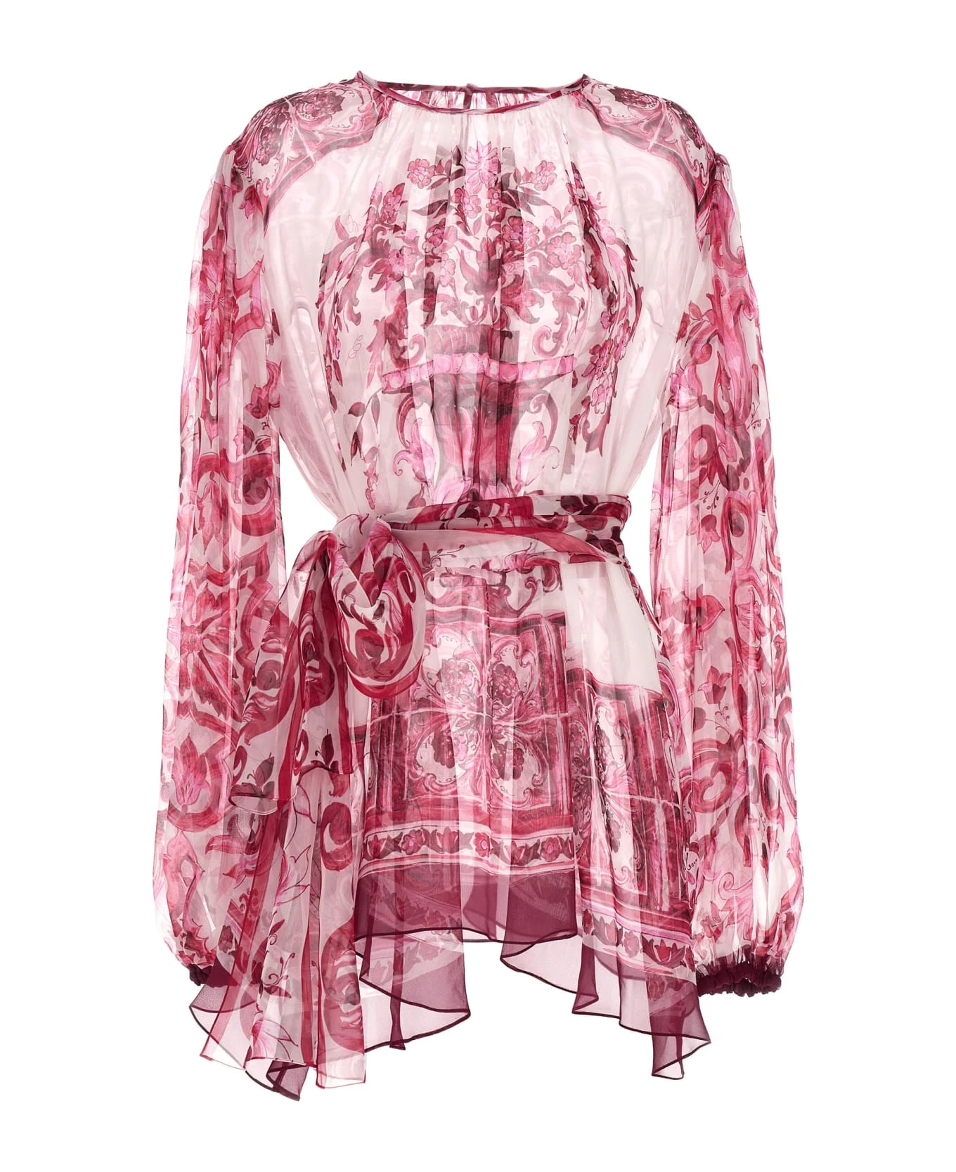 Silk chiffon blous bag with ‘Maiffon’ print, a crewneck, and long cuffed sleeves.