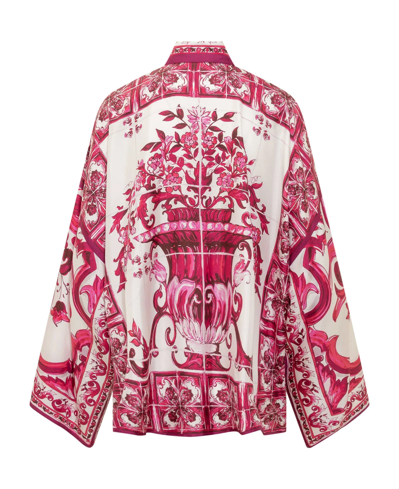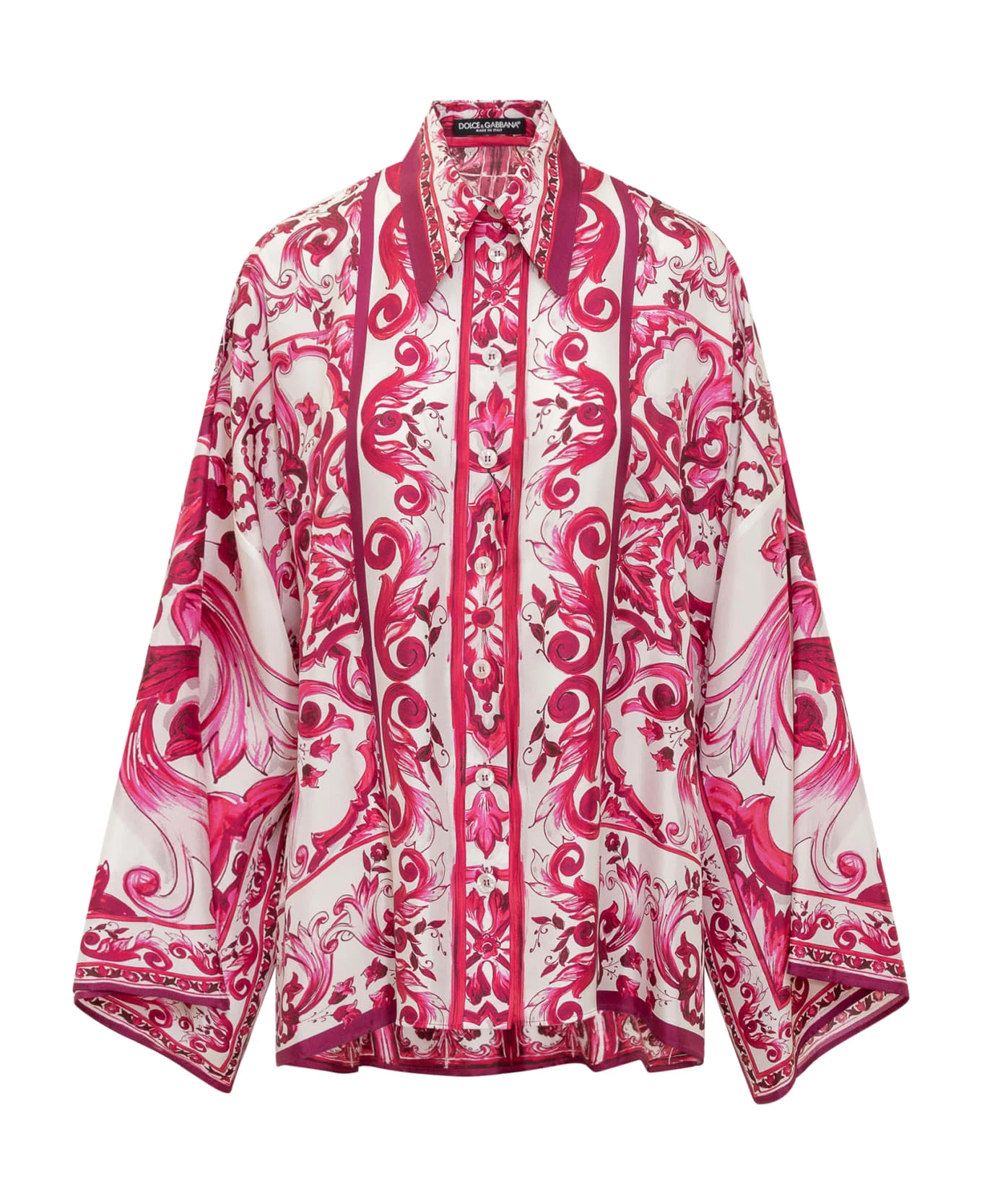 Long sleeve shirt. Wide sleeve. Pointed collar. Button closure. Side slits. Allover majolica print.