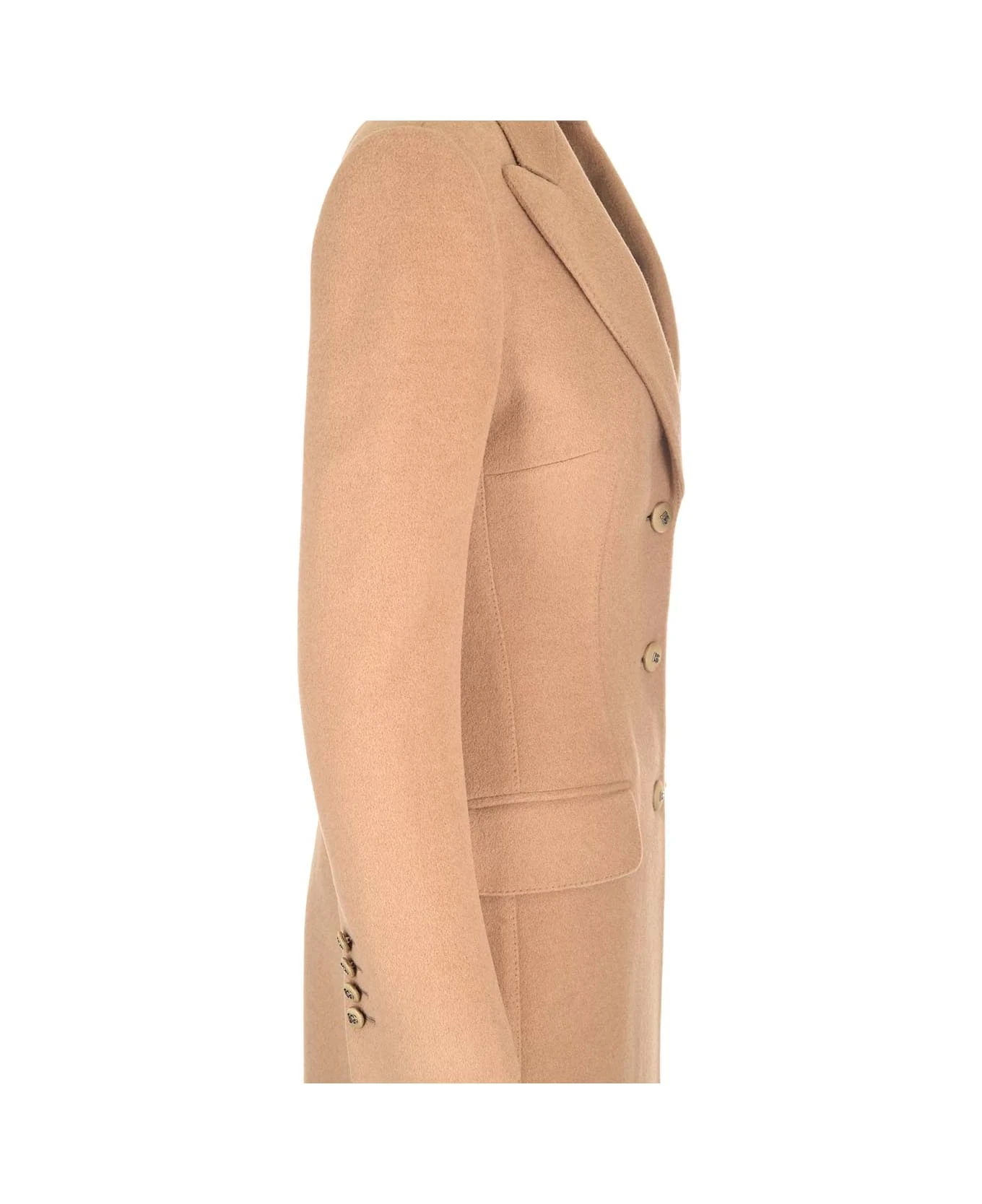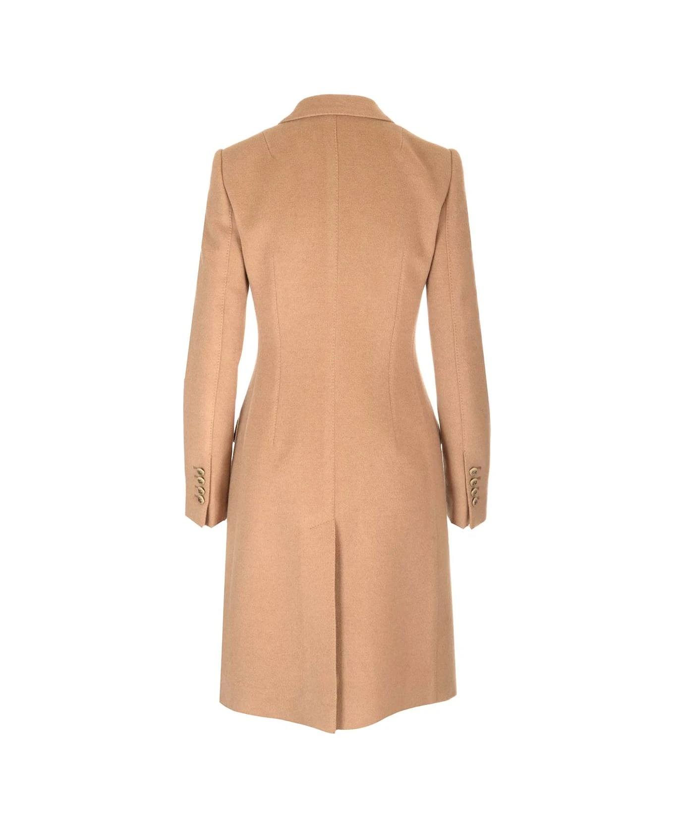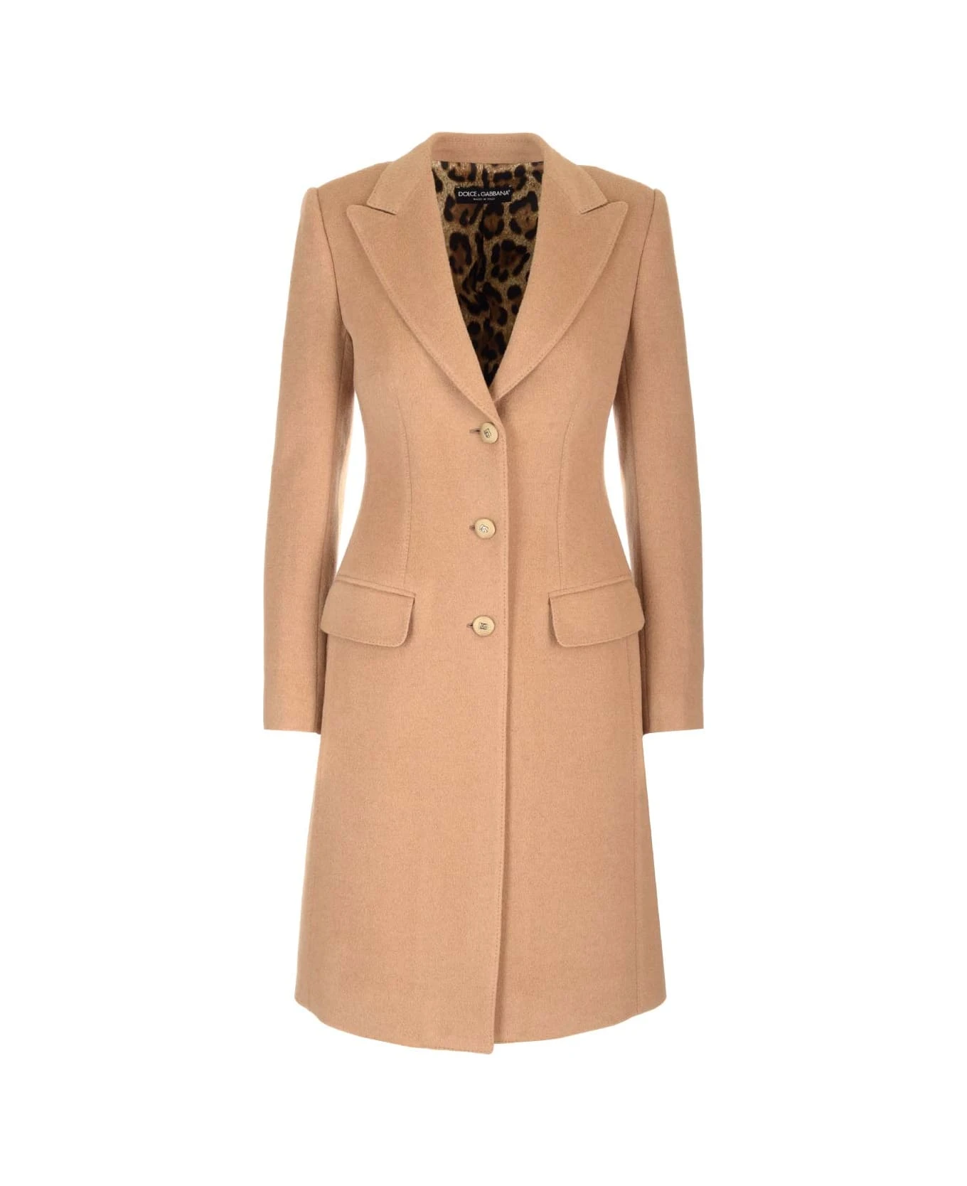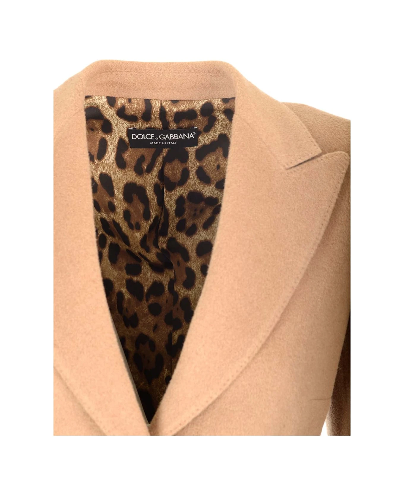 Tailored coat in camel wool from Dolce & Gabbana, with slim fit, 2 button fastening, animalier lining, low pockets with flap, rear vent.