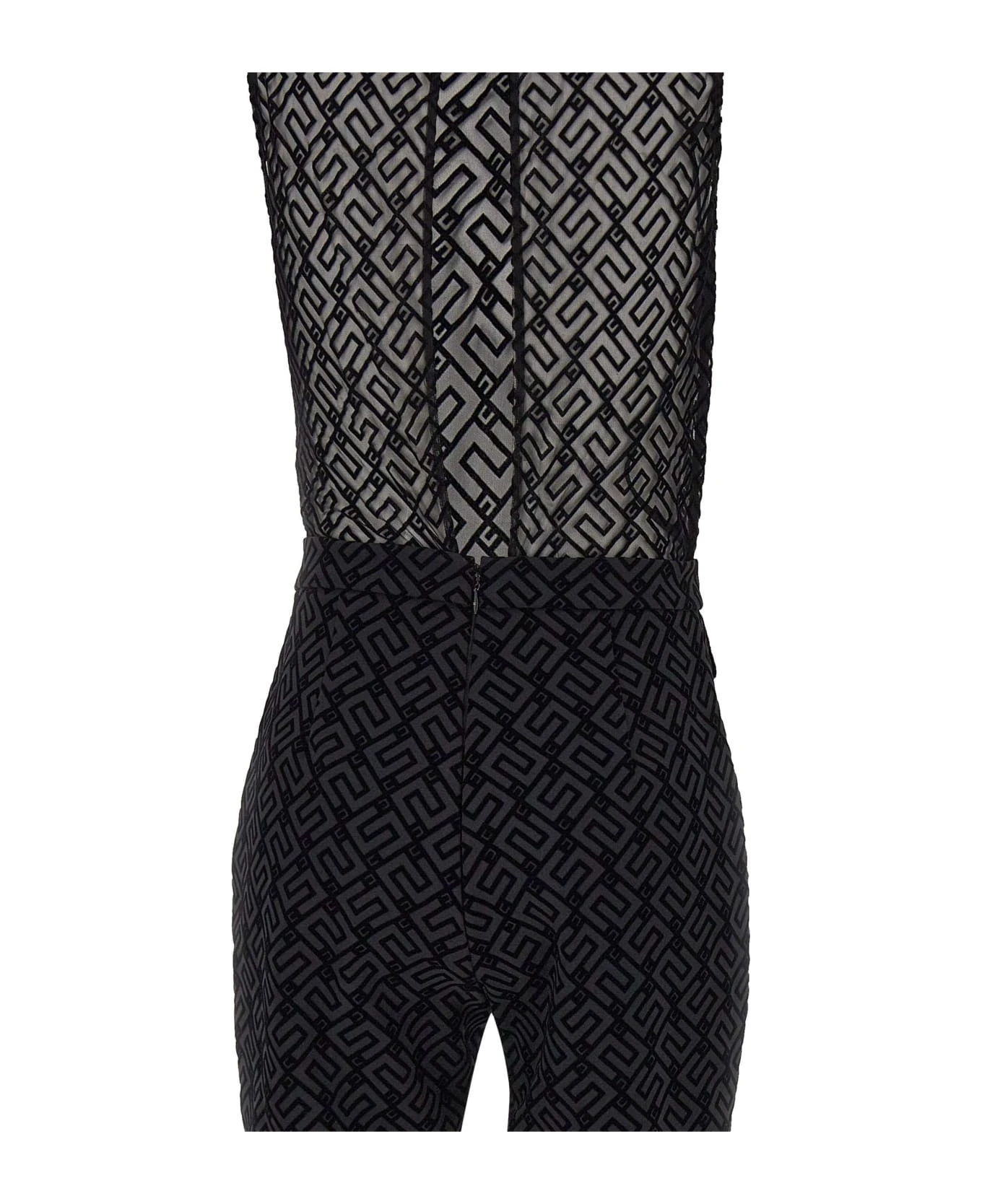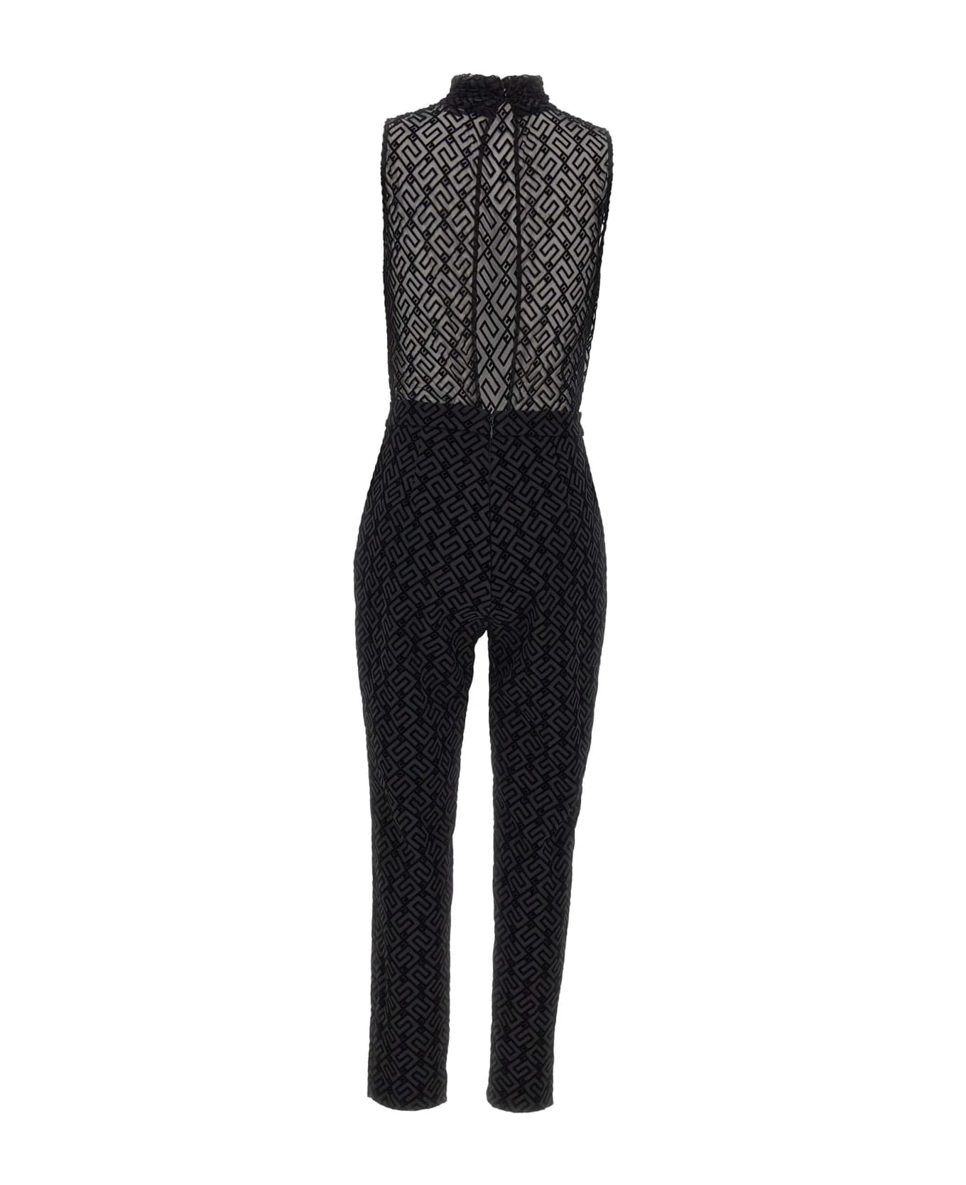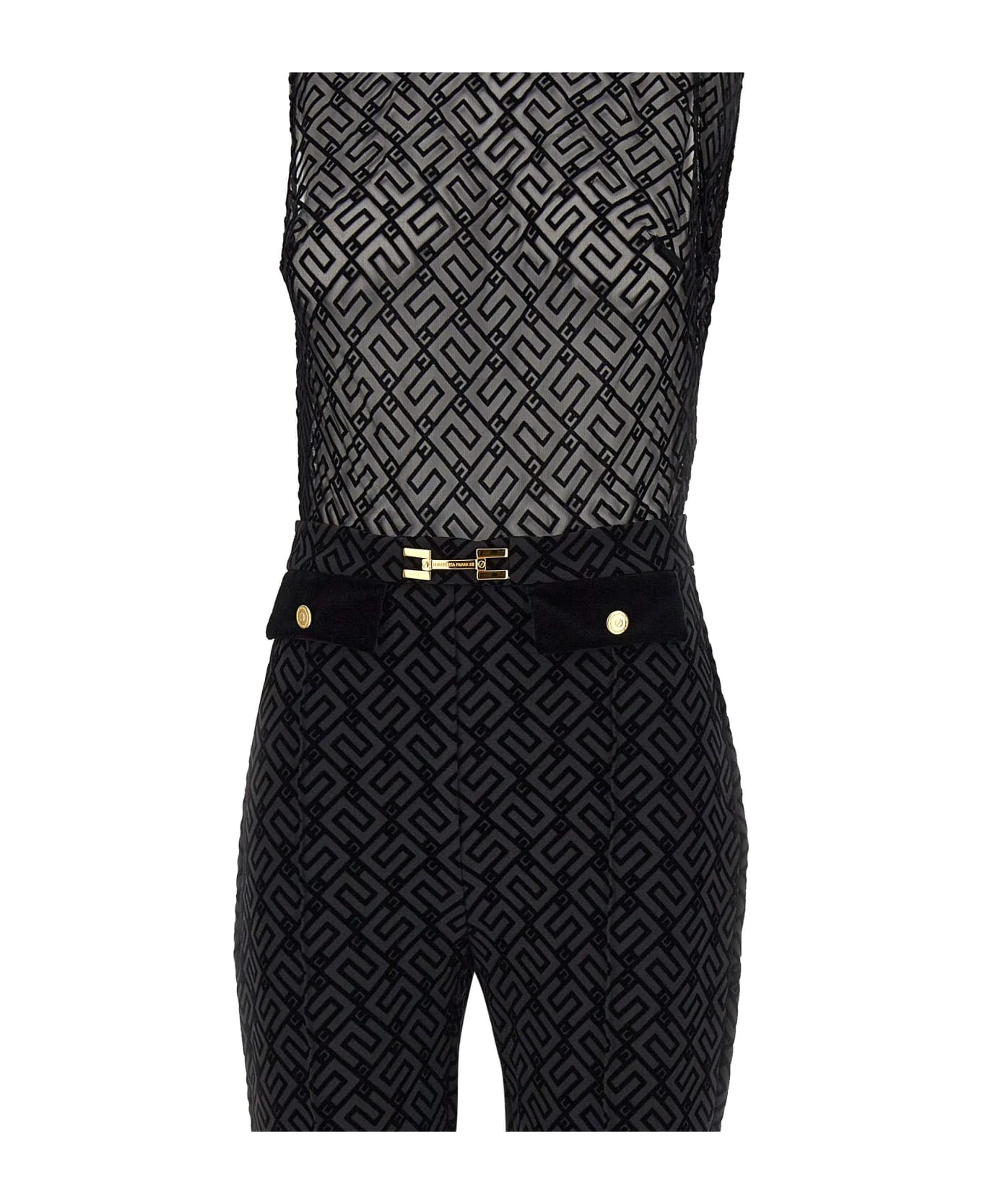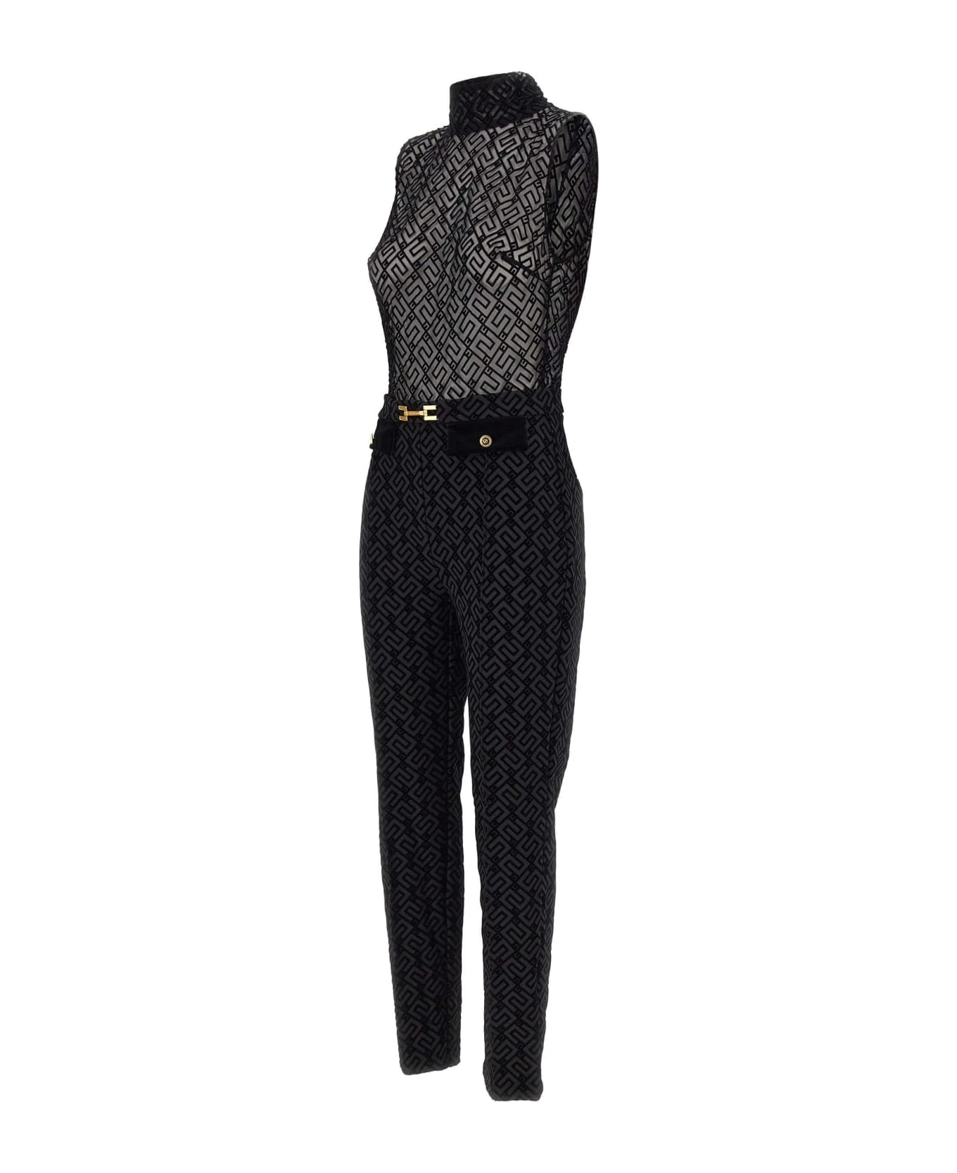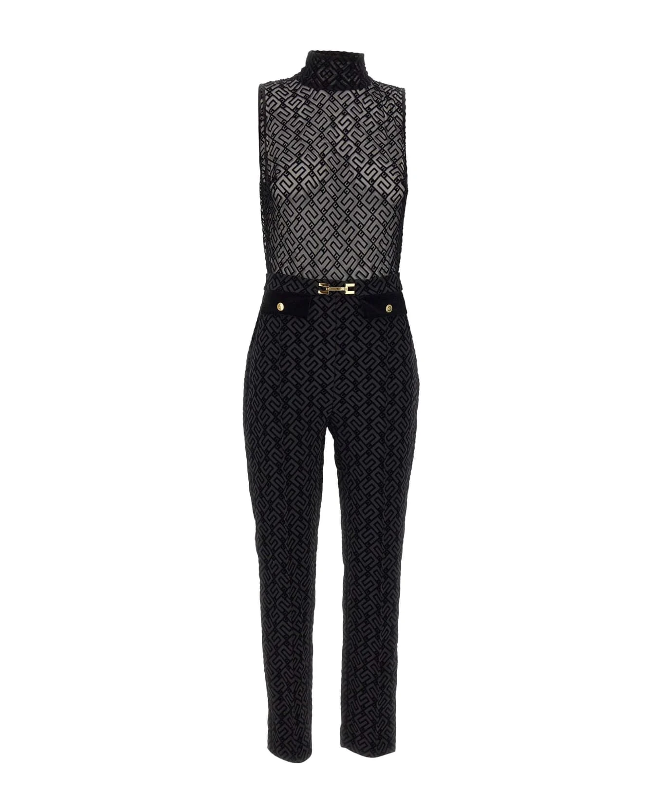 Elisabetta Franchi ‘Events’ double stretch crepe jumpsuit, black, cigarette trousers, removable tulle top with flocked logo print, velvet flaps, golden metal logoed buttons and horsebit to emphasize waist, invisible zip on back, slim fit. Made in Italy.