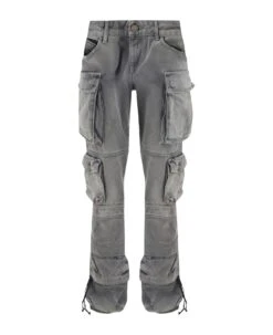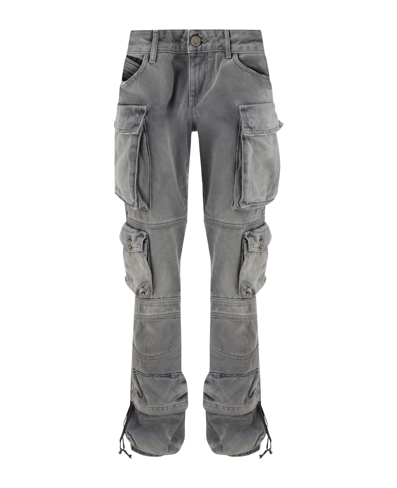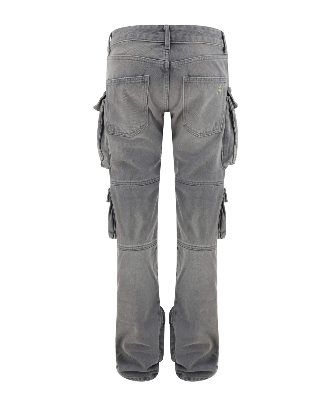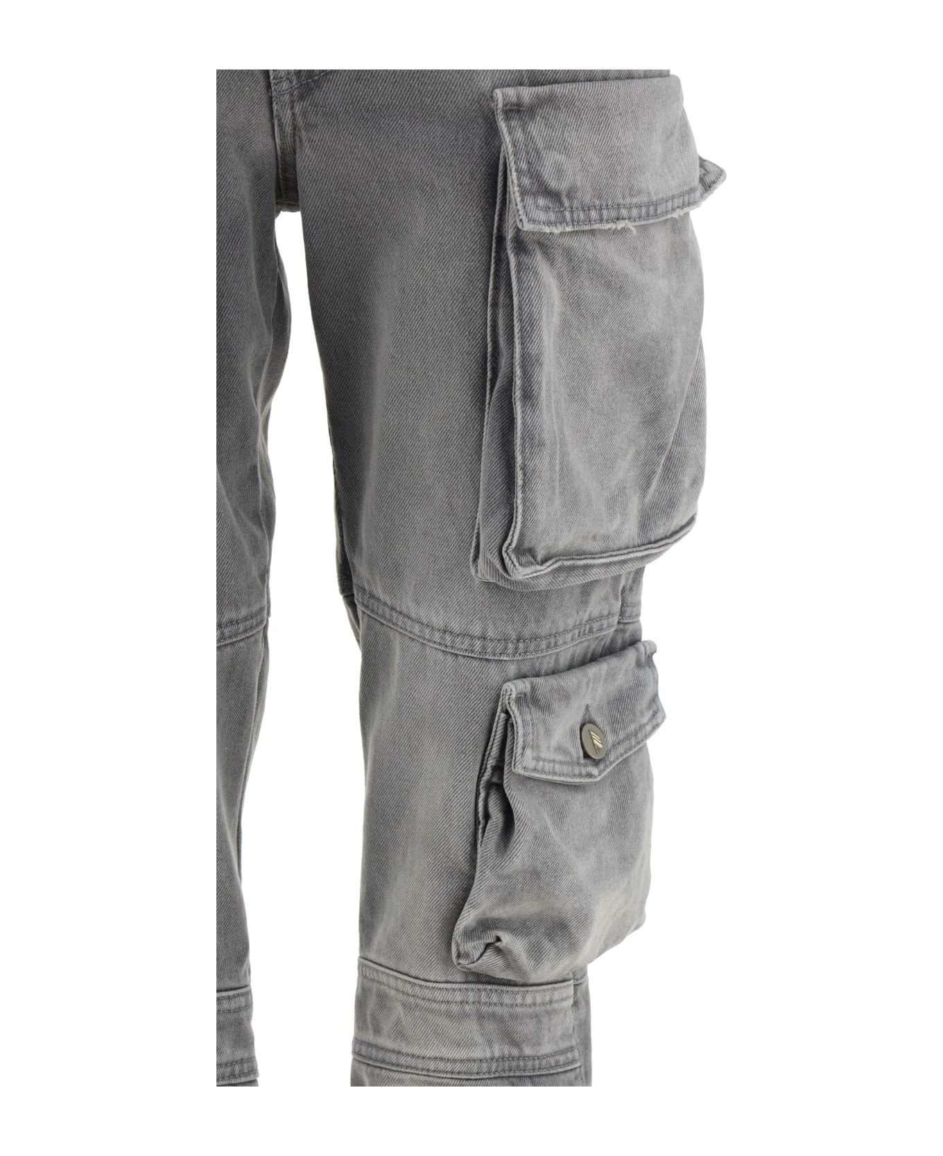 Essie cargo pants by the attico, denim-effect design, low-waisted five-pocket style, front button and zipper closure, six large cargo patch pockets on front and side panels, monochrome pattern, iconic contrasting embroidered brand logo on back pocket, waistband loops.