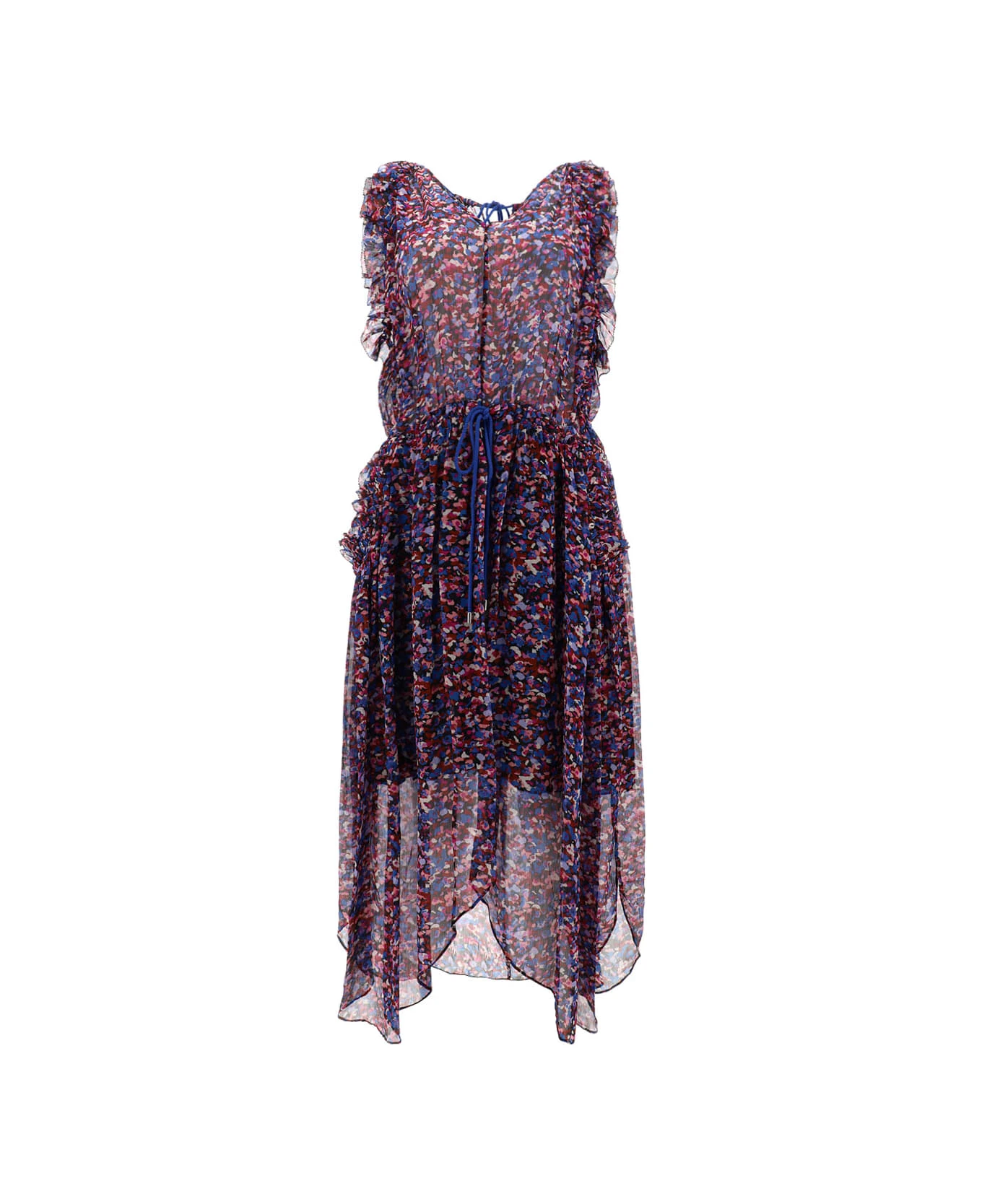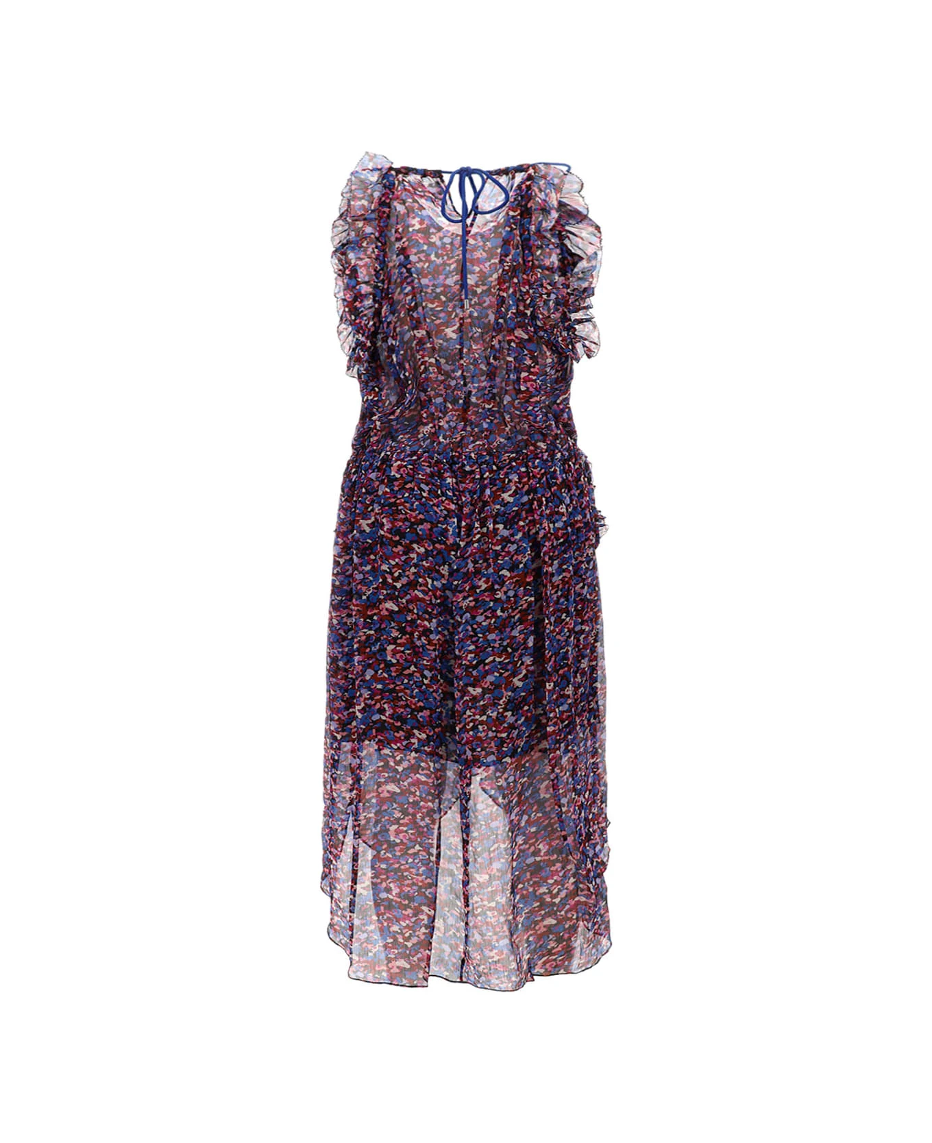 Fadelo dress by isabel marant etolie, adjustable crew neck with string drawstring back, sleeveless design with ruffle hems, elasticized waistband detail, soft skirt, skirt fitted with opaque slip, multicolored floral pattern.