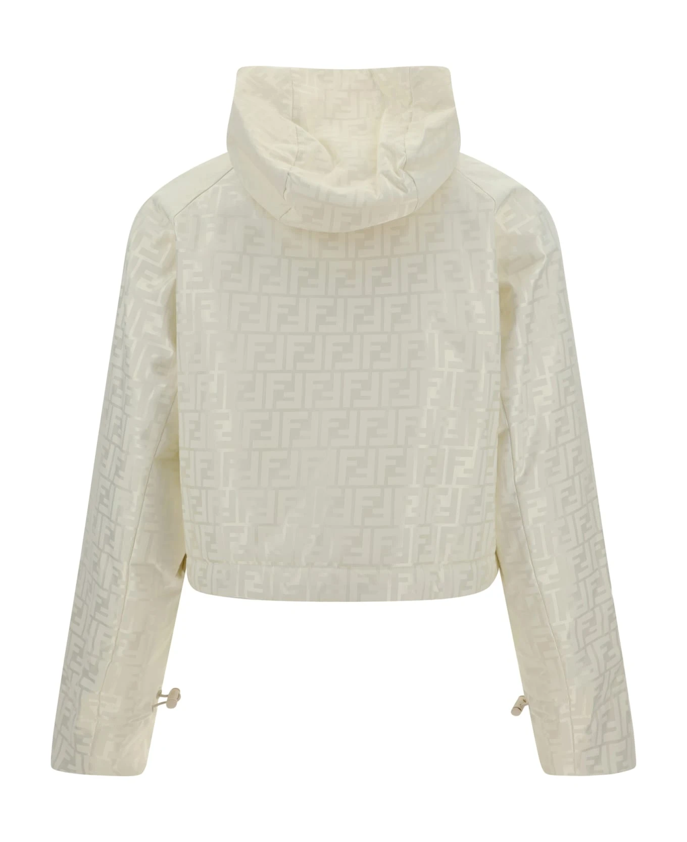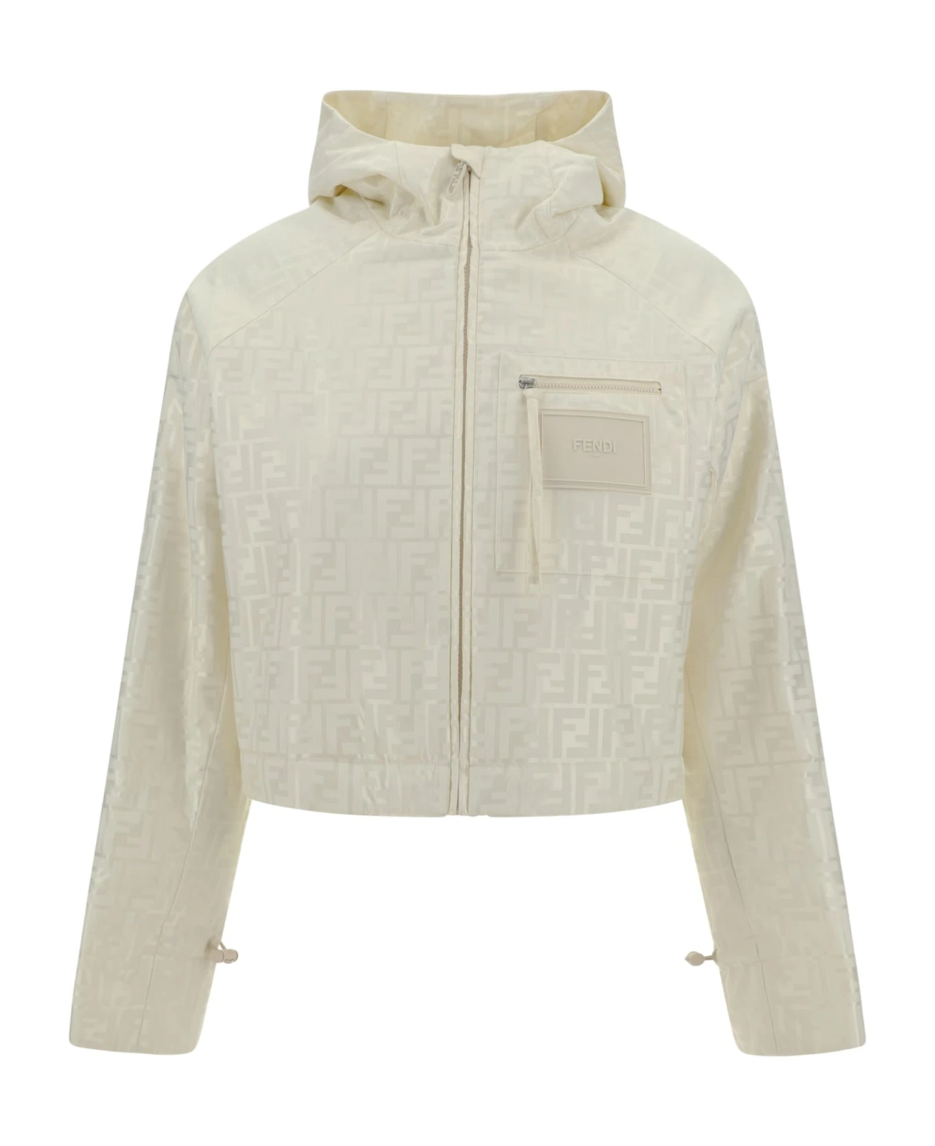 Ff windproof jacket by fendi, high crew neck, hooded model front zipper closure, iconic all-over tone-on-tone repeated brand logo, adjustable drawstring cuffs, two side welt pockets, monochrome pattern, one patch pocket on the front embellished with logo press-on patch.