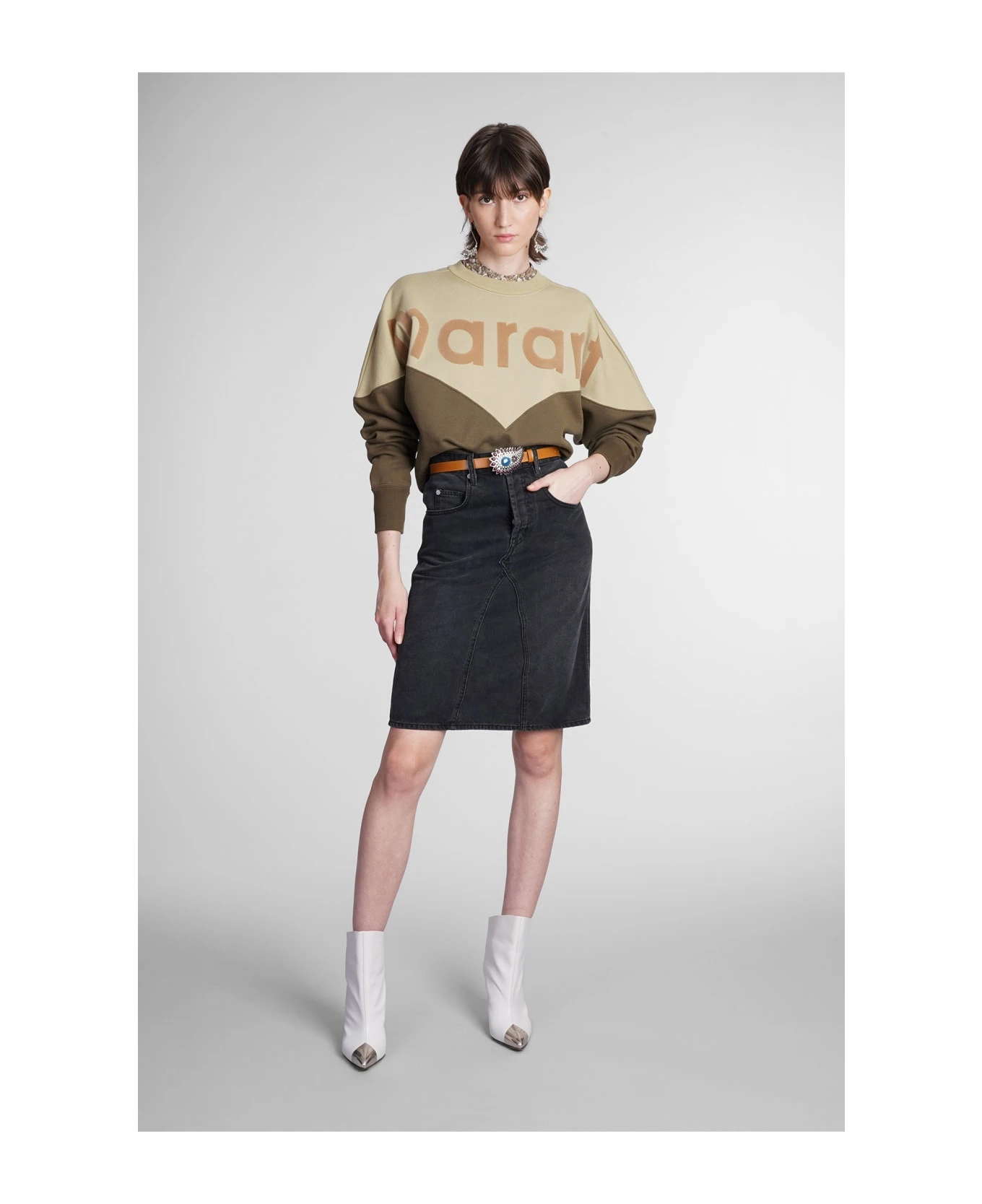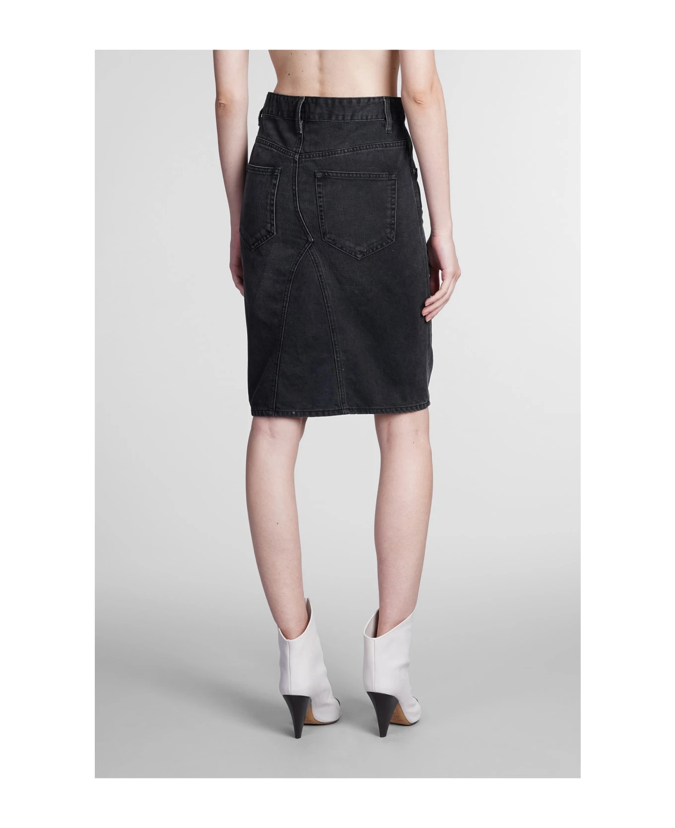 Fiali Skirt in black denim, button and zip closure, five pockets, waist belt loops, 100% cotton, Made in Tunisia, Model is 180 cm and wears 36