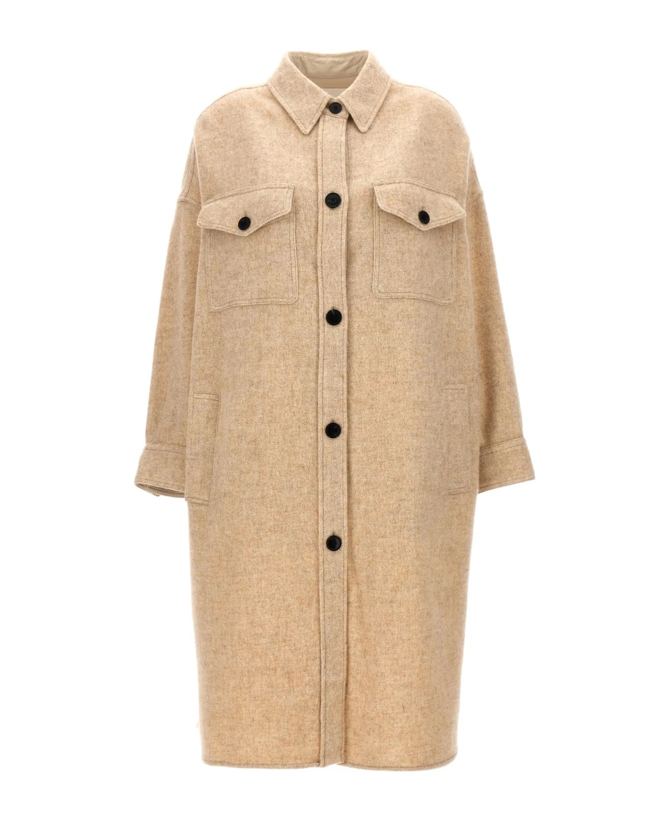 ‘Fontia’ wool blend coat with button closure, pockets, long cuffed sleeves, and back logo embroidery.