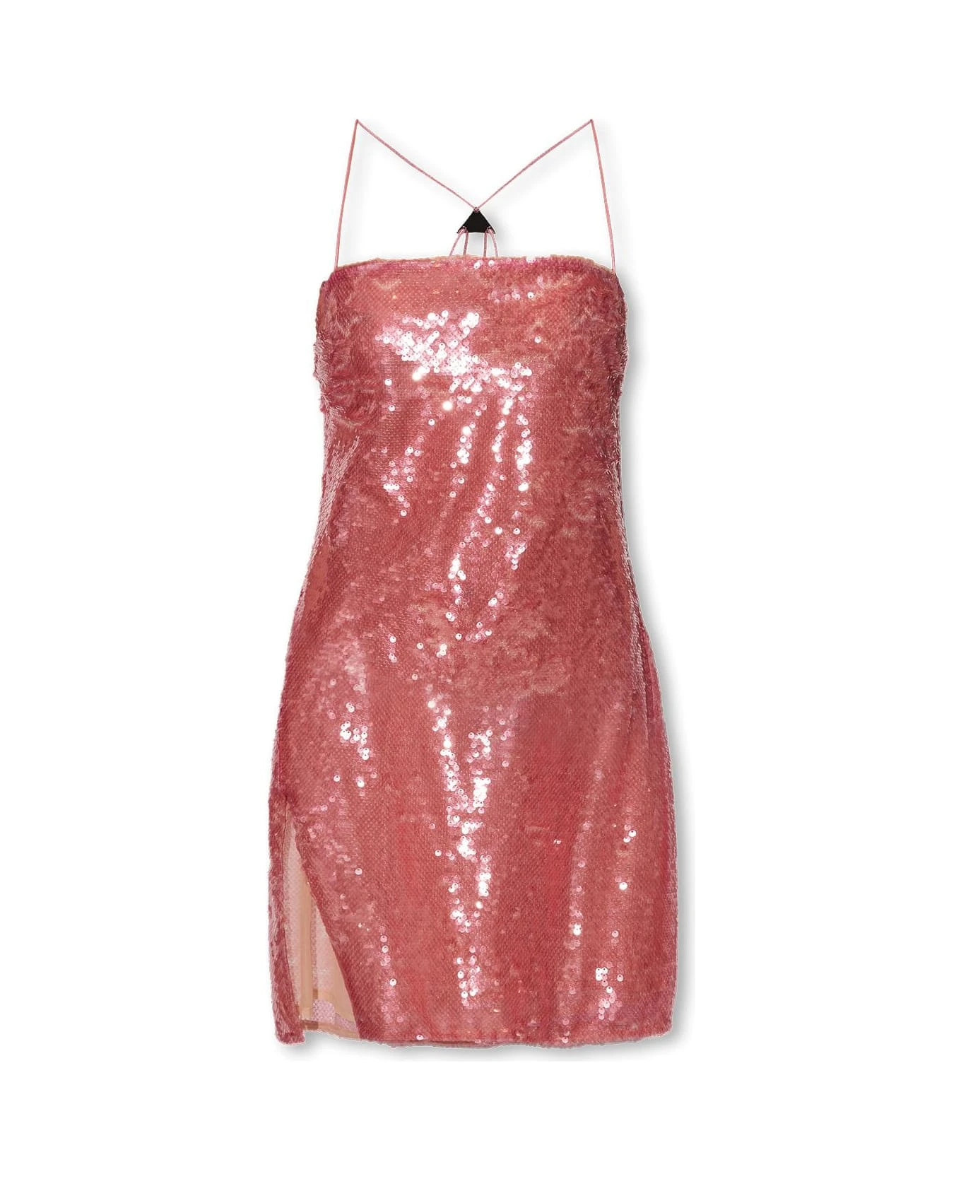 Pink ‘Fujiko’ slip dress from The Attico. Spruced up with semi-transparent, glossy sequins, this style fastens with a hidden back zipper an features spaghetti straps accentuated with silver-tone logo hardware and a side slit on the skirt.