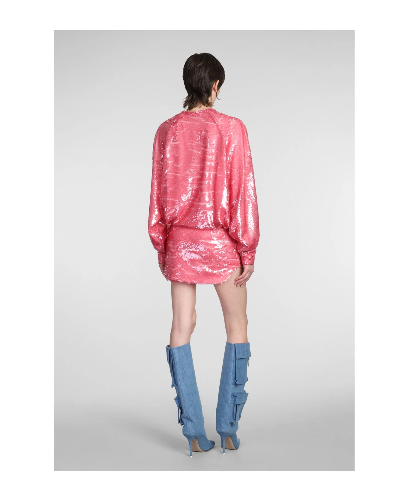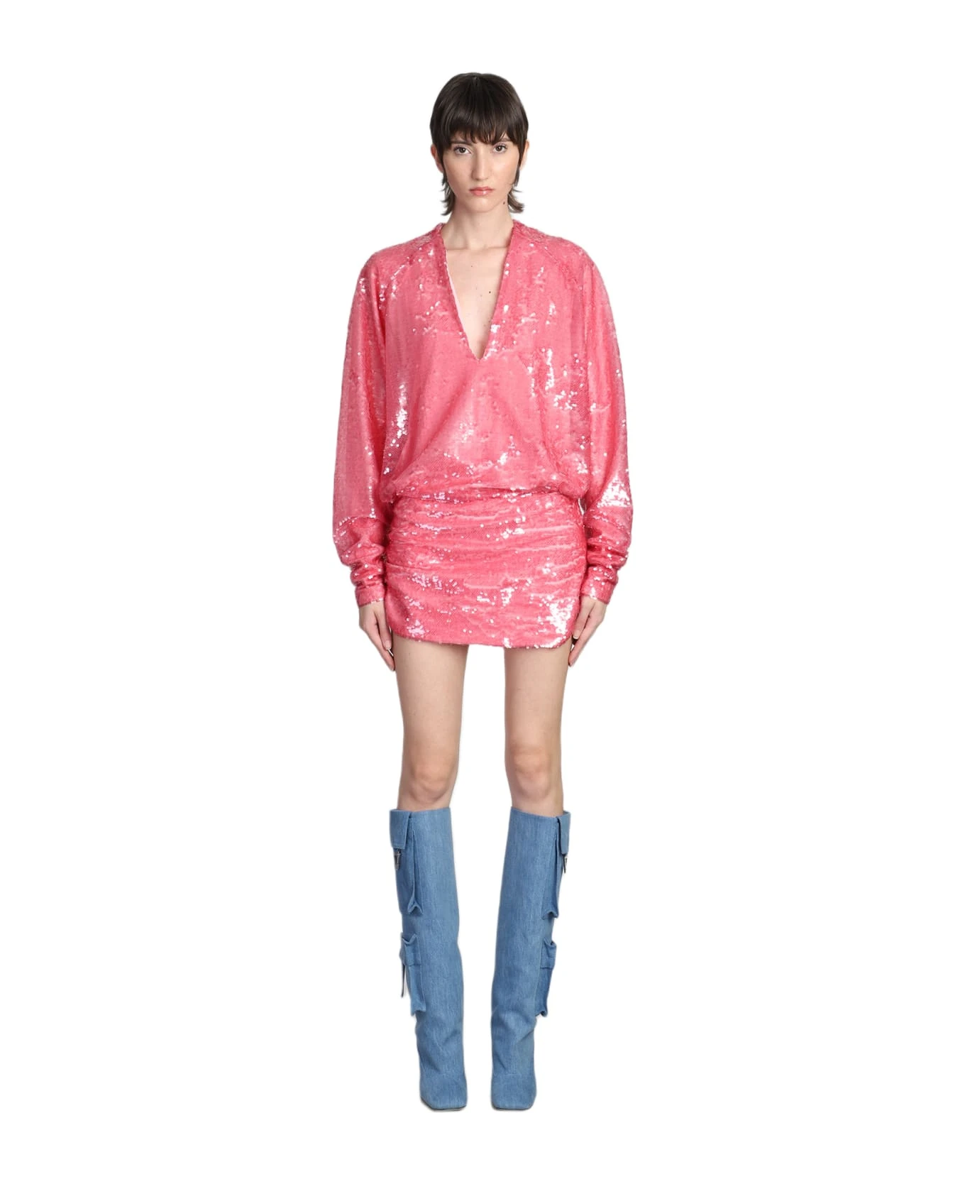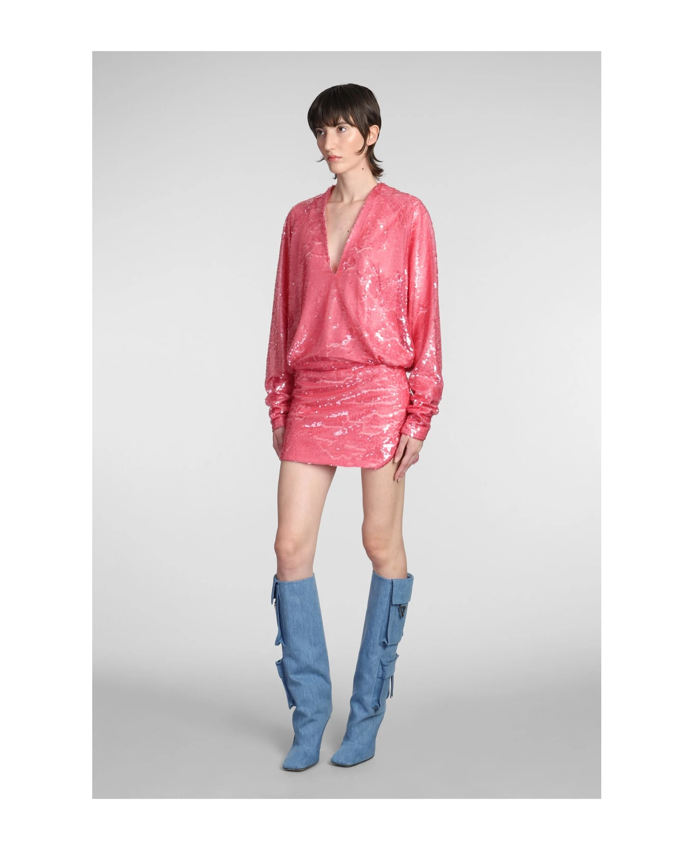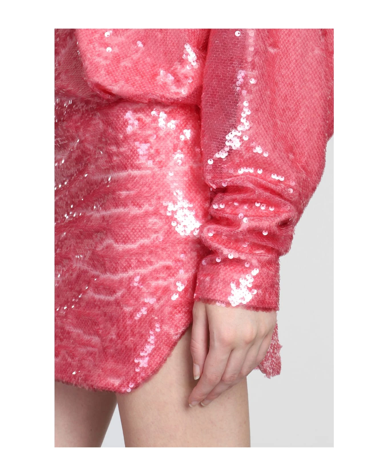 Gael Dress in rose-pink polyester, V neck, long sleeves, sequins, 100% polyester, Made in Italy, model is 180 cm and wears size 40