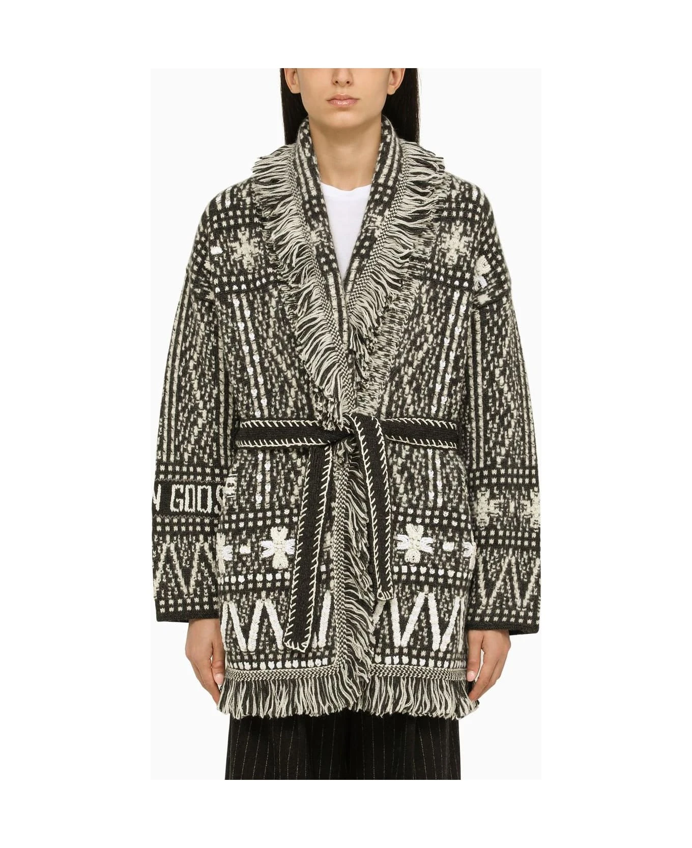 Dark grey alpaca-blend cardigan by Golden Goose Deluxe Brand features contrasting embellishments, a belted waist and decorative fringes.