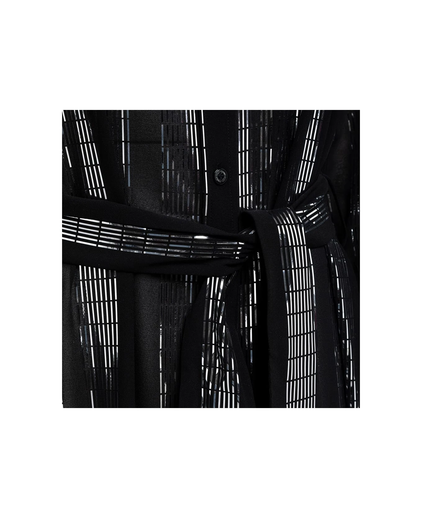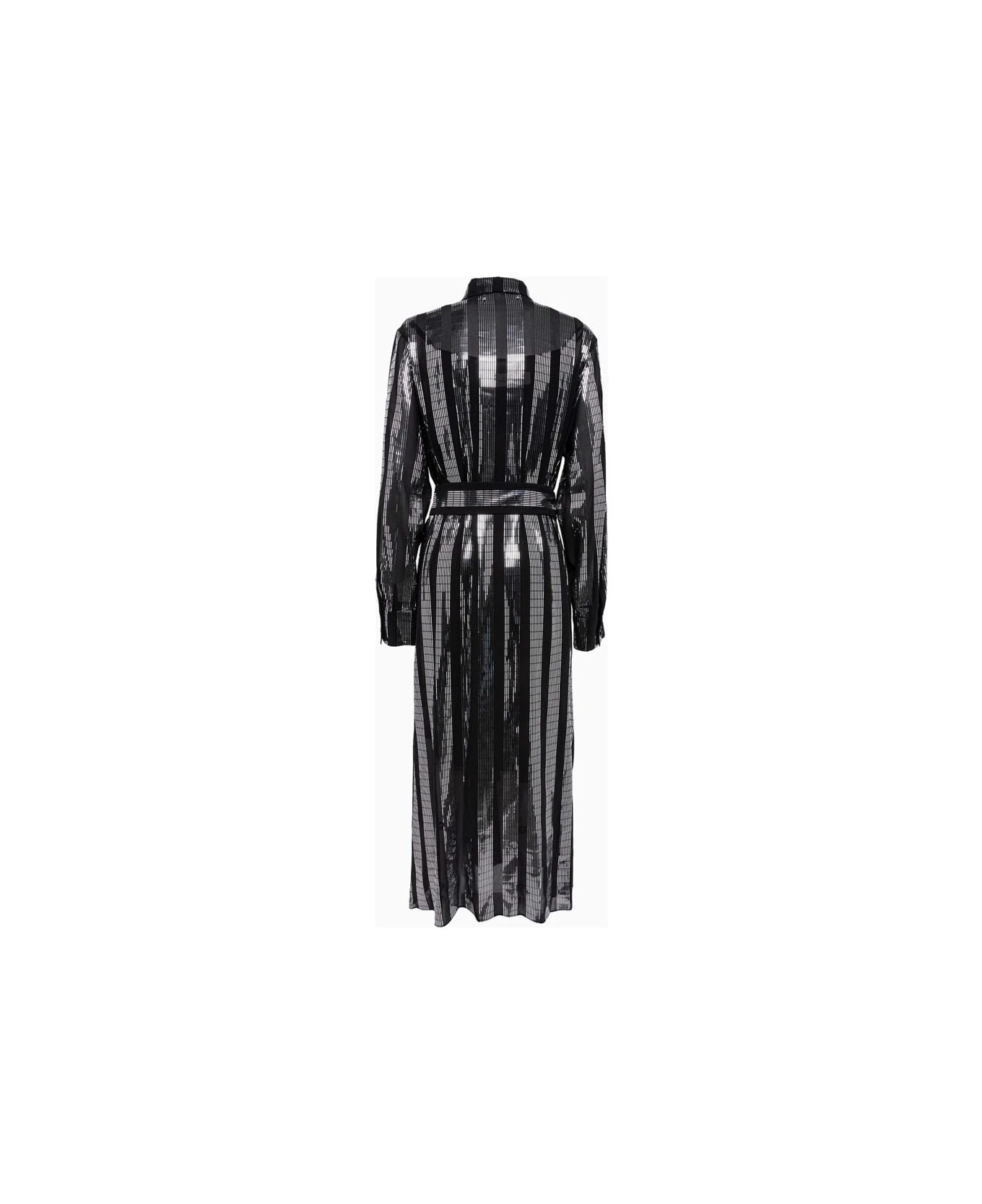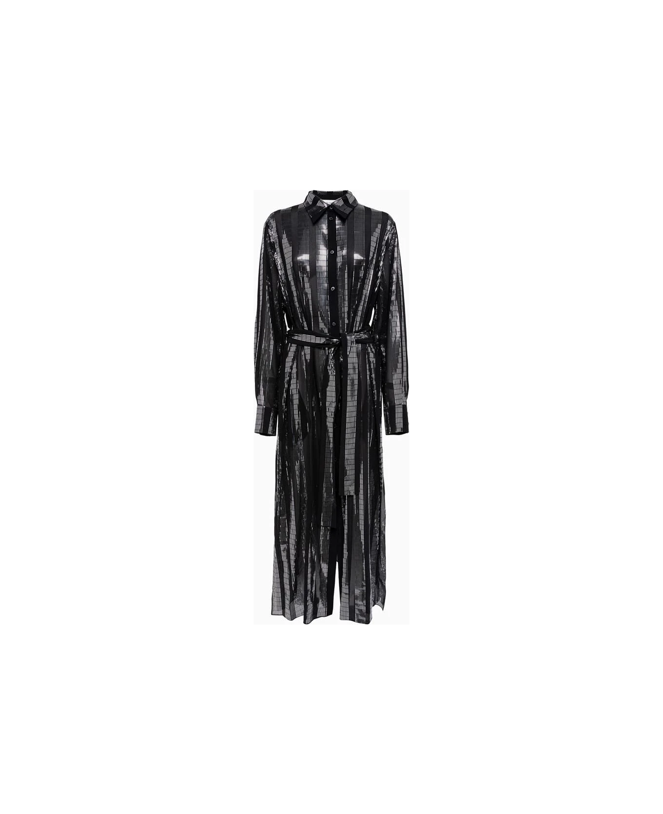 made in italy journey chemisier dress in solid color fabric with laminated optical details. classic collar. button closure. long sleeves, buttoned cuffs. loops at waist and sash belt. side welt pockets. solid color lining. regular fit. composition: 100% polyester.