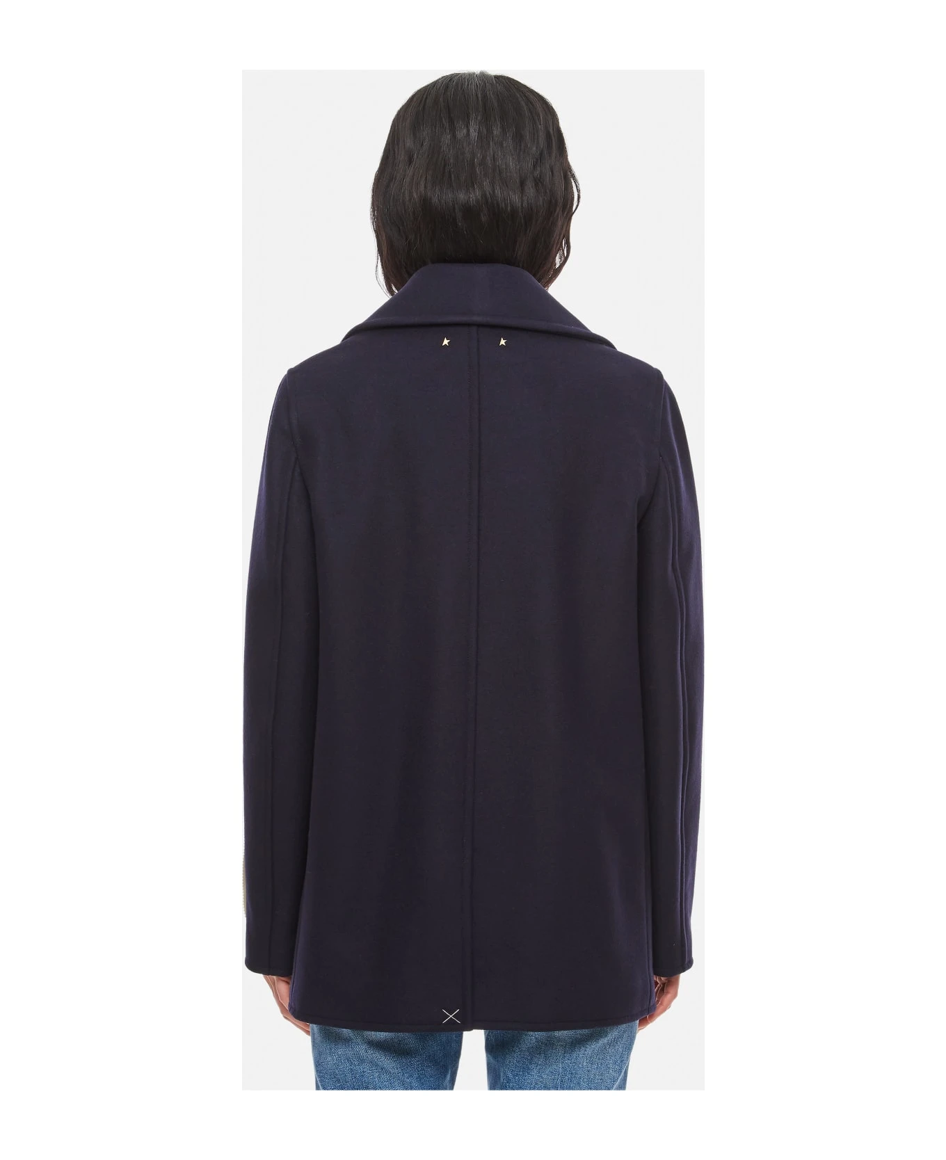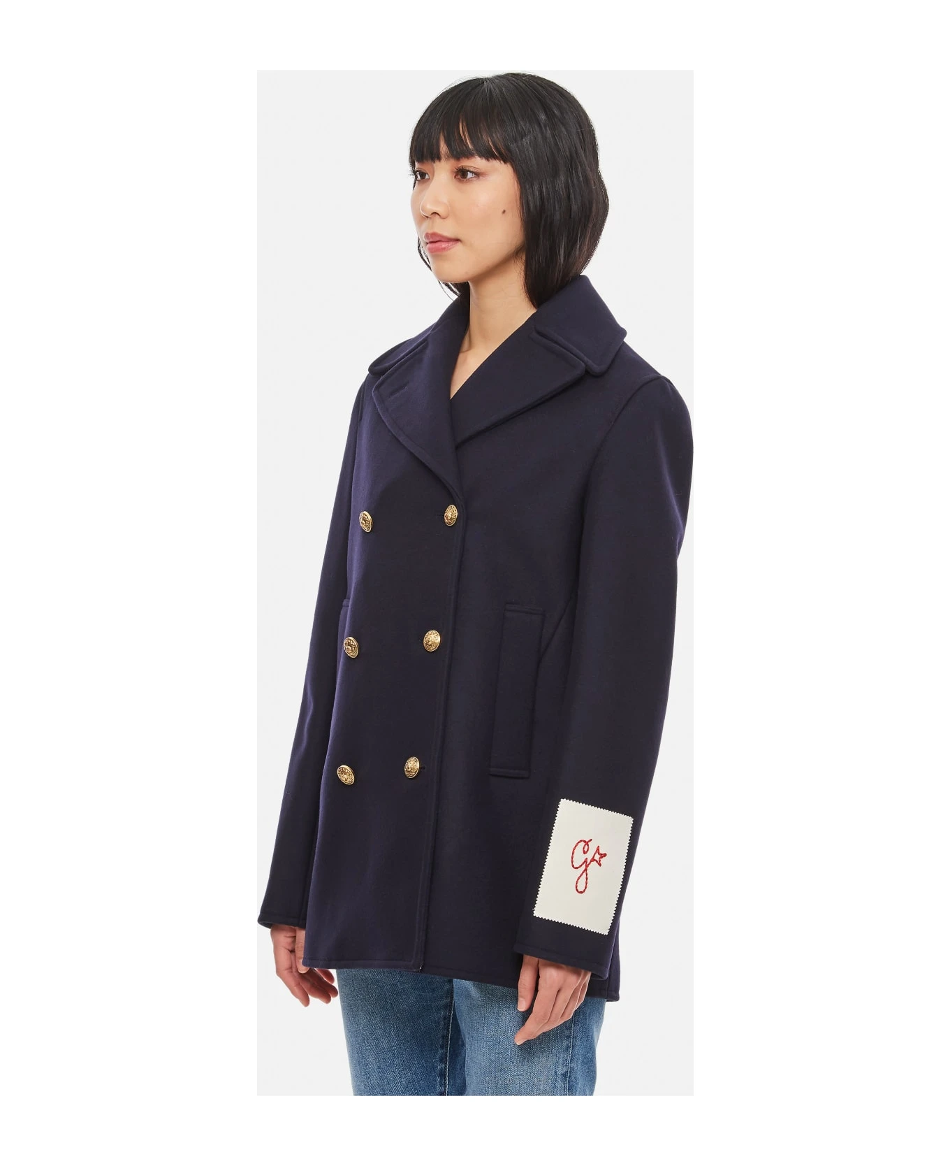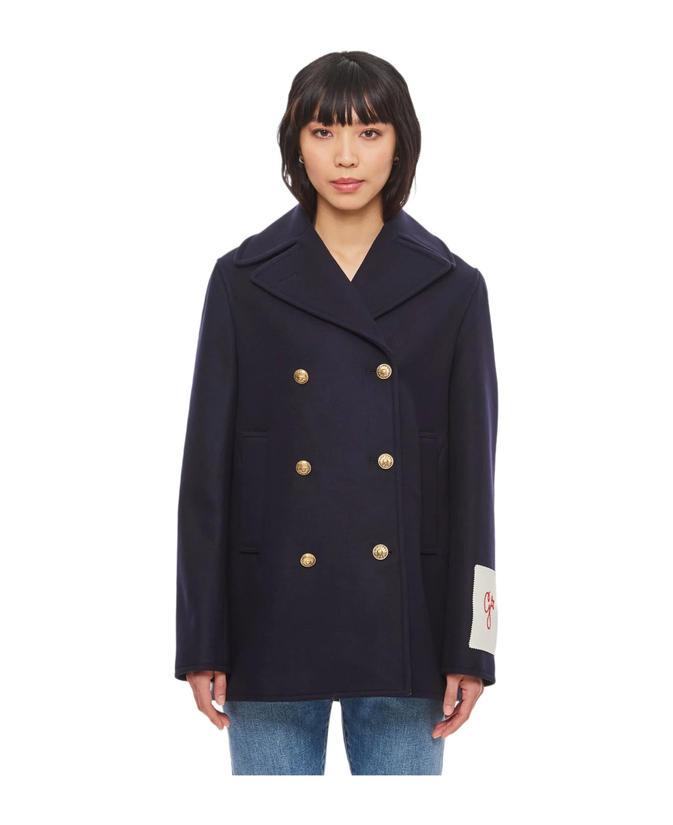 Double breasted coat. Button front closure. White patch with logo. Color: Blue.