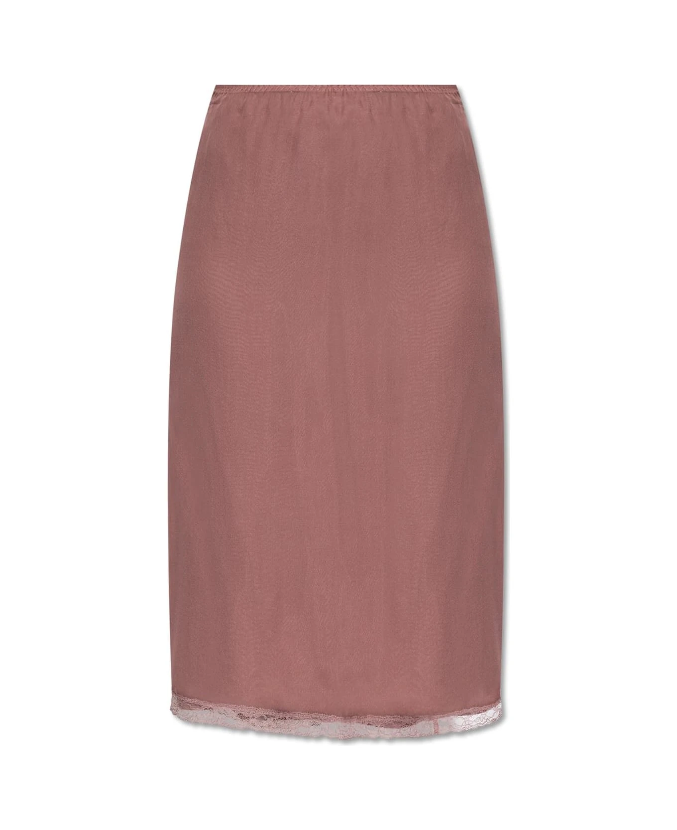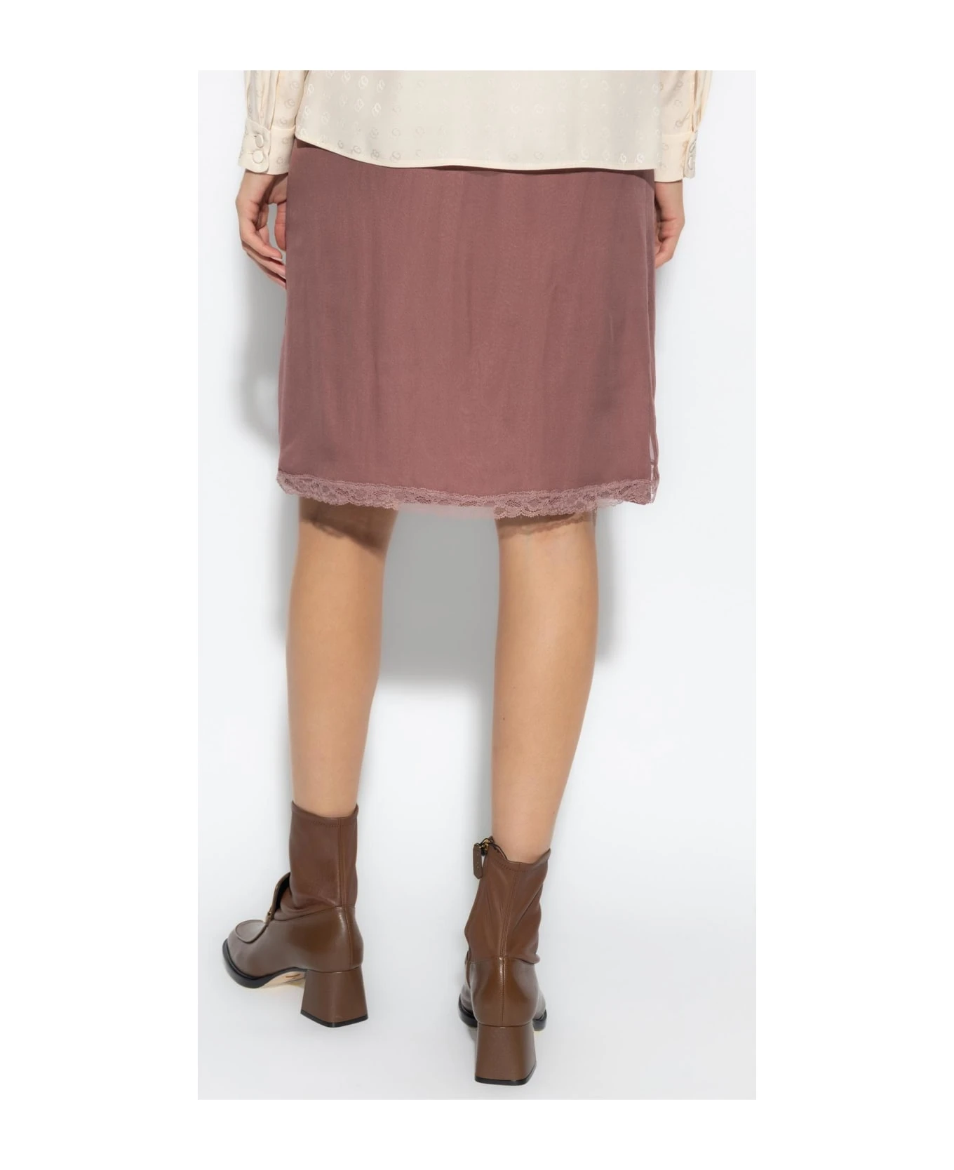 Dark pink two-layer skirt in lingerie style from Gucci. Made of silk, this item features an elasticized waistband, lace trims at the hem and a detachable slip lining.