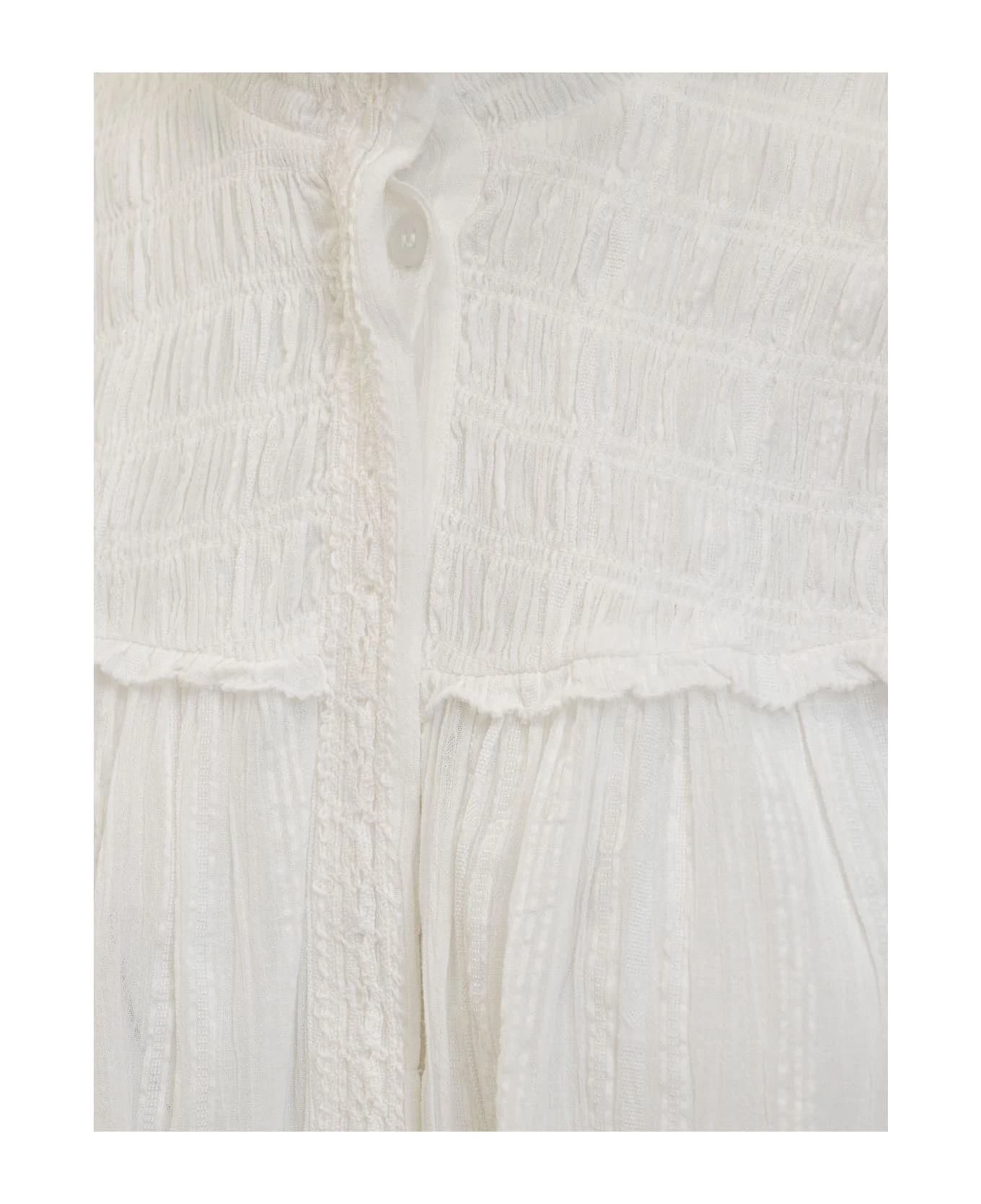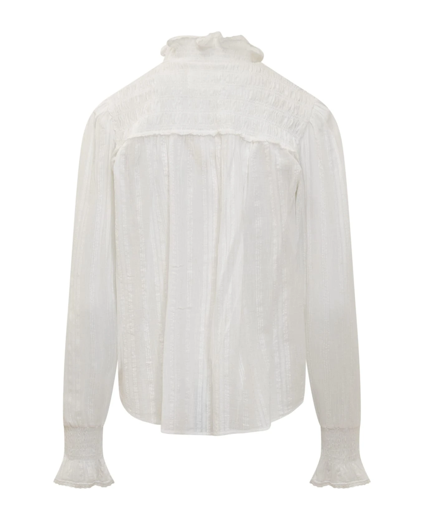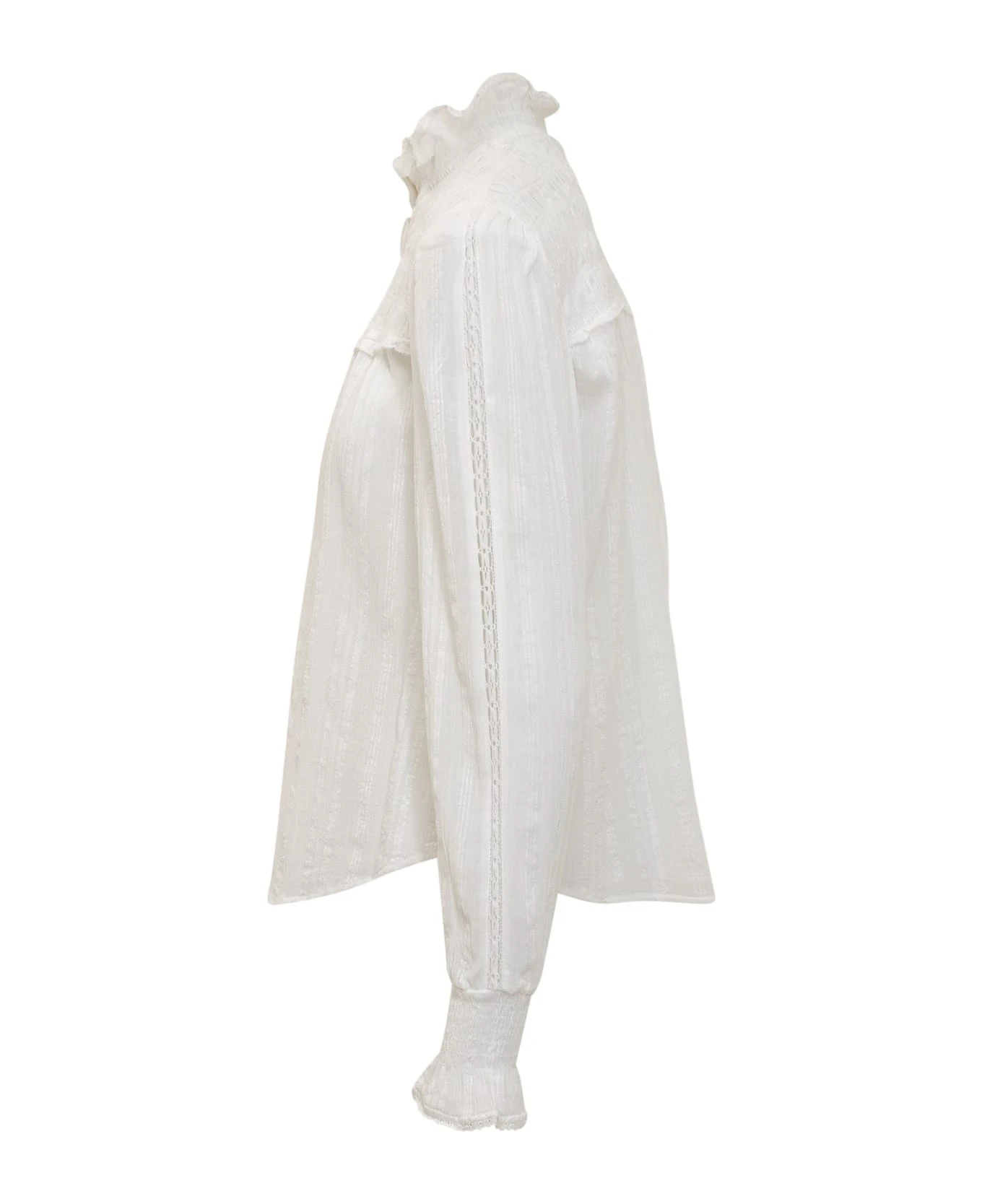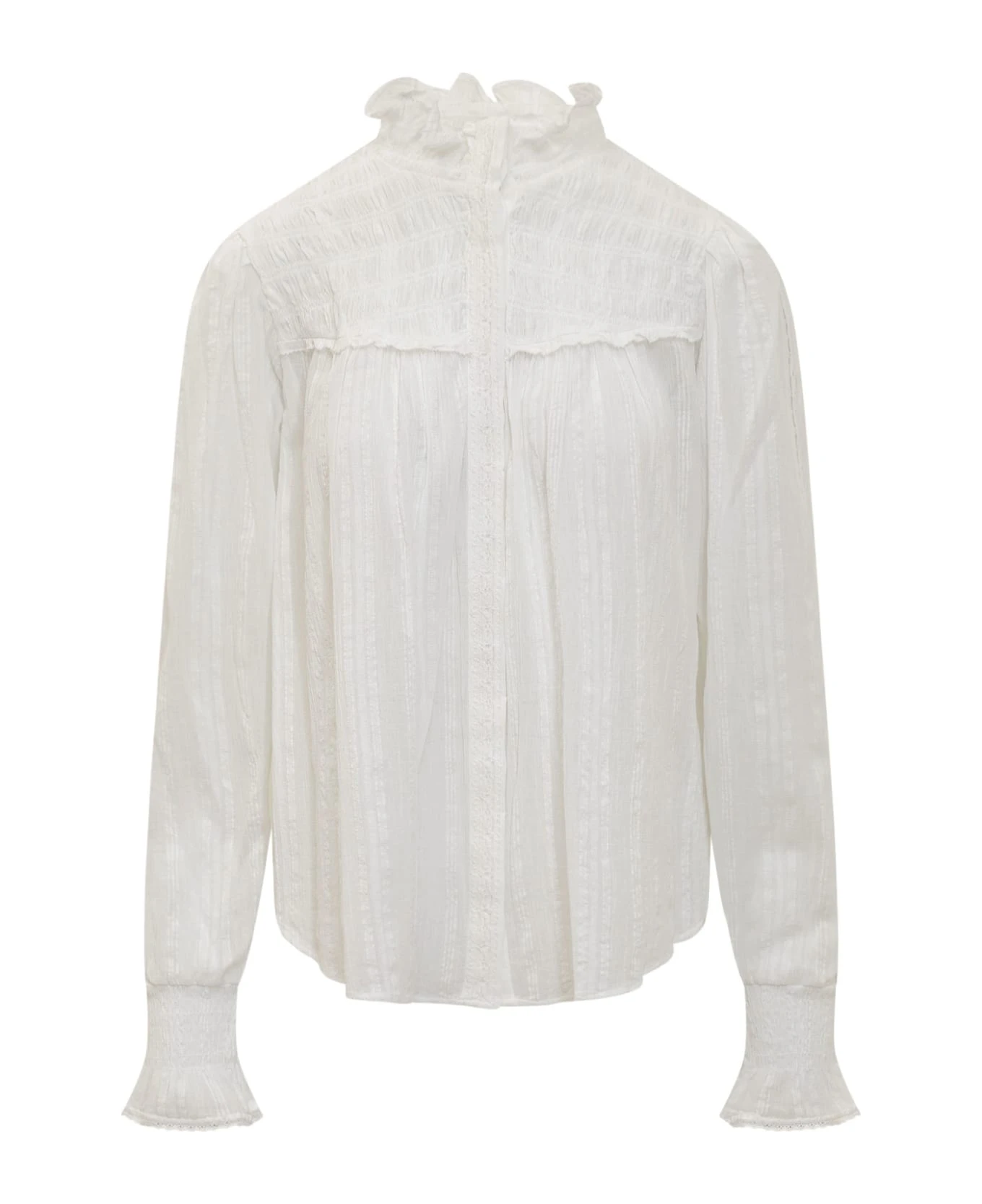 White shirt with long sleeves. High collar. Button closure.