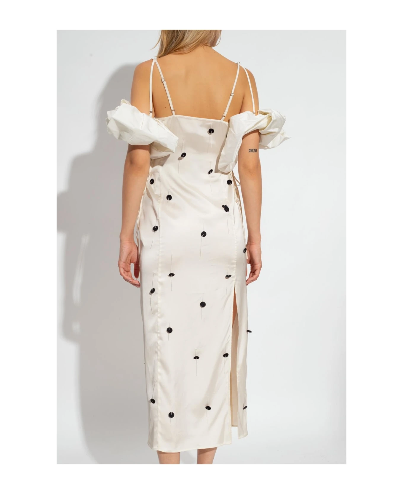 Cream ‘Chouchou’ dress from Jacquemus. Made from satin, this style fastens with a hidden back zipper and hook & eye closure and features a square neckline, adjustable spaghetti straps, loose hanging threads with round black details, detachable puff sleeve