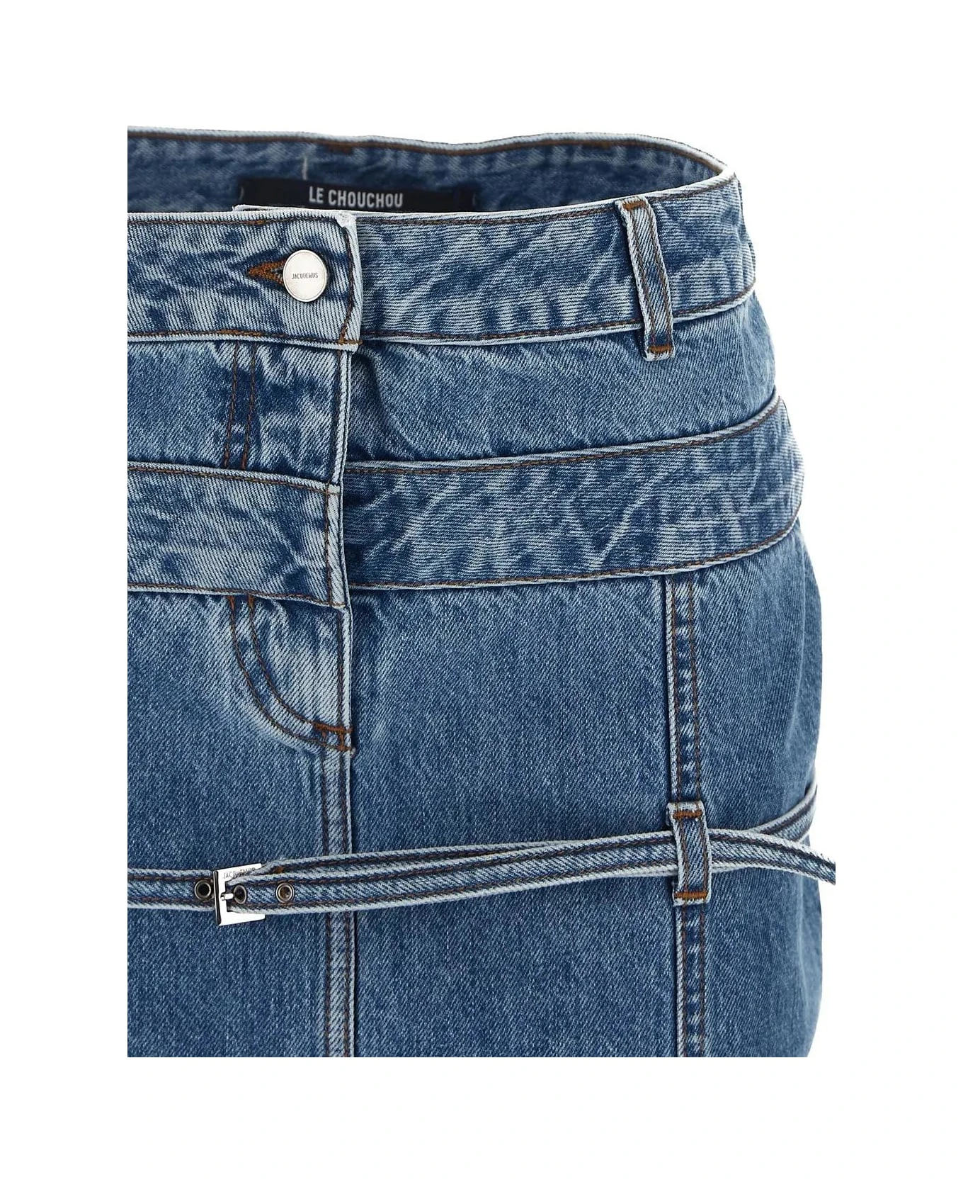Jacquemus denim midi skirt in light blue stonewash cotton with low rise, contrasting stitching, button and zip closure, a back pocket, integrated double waistband, removable thin buckled belt and belt loops, grosgrain logo ribbon on the back and long back slit.