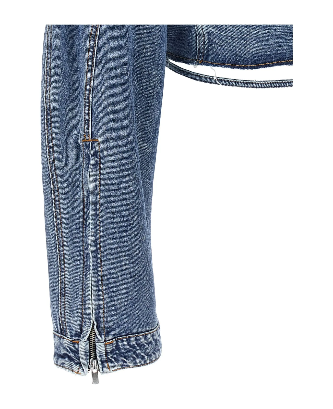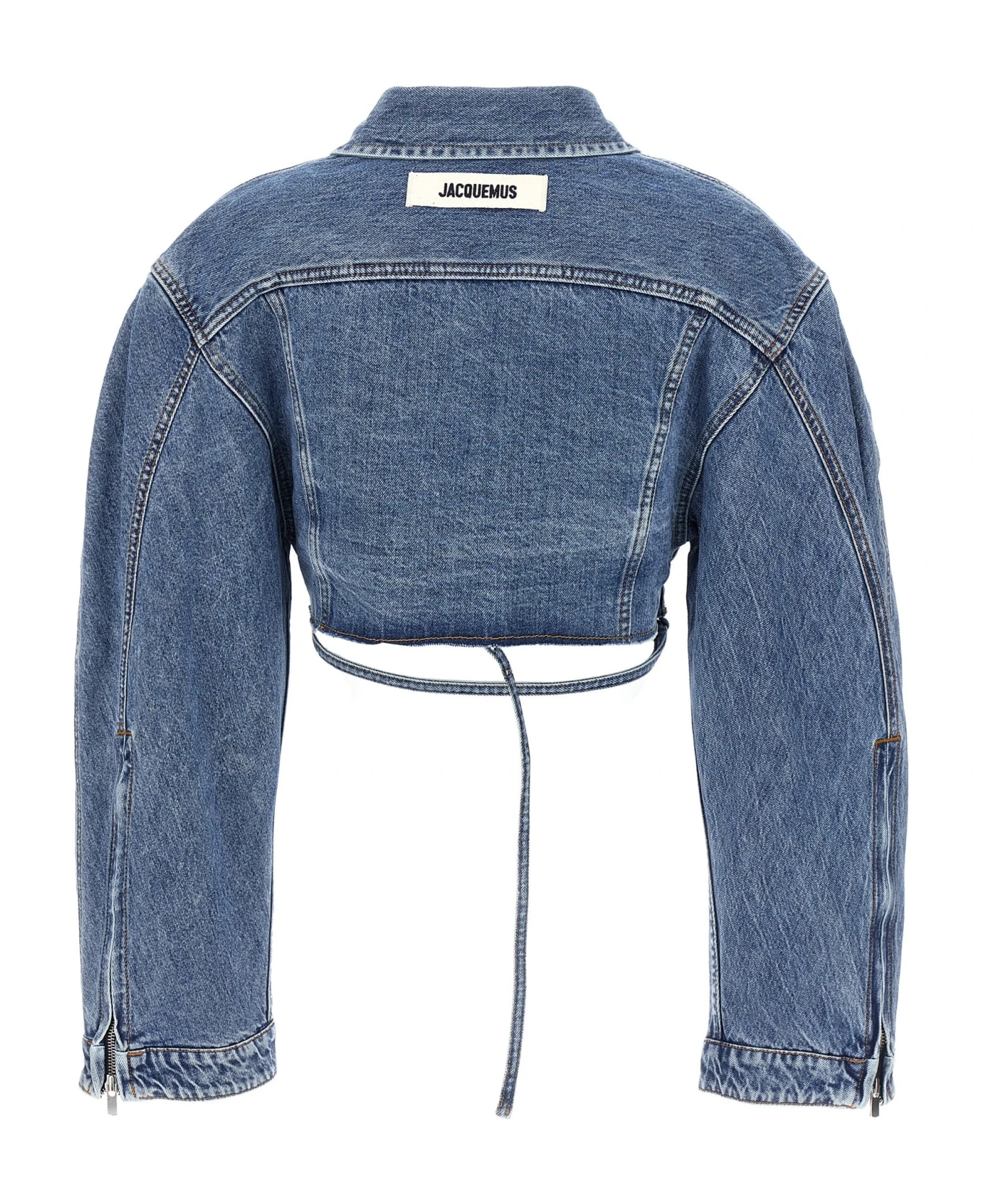 ‘Le haut de nimes corto’ cropped denim jacket with raw cut hem, button closure, double chest pocket, oversized sleeves and a strap at the waist.