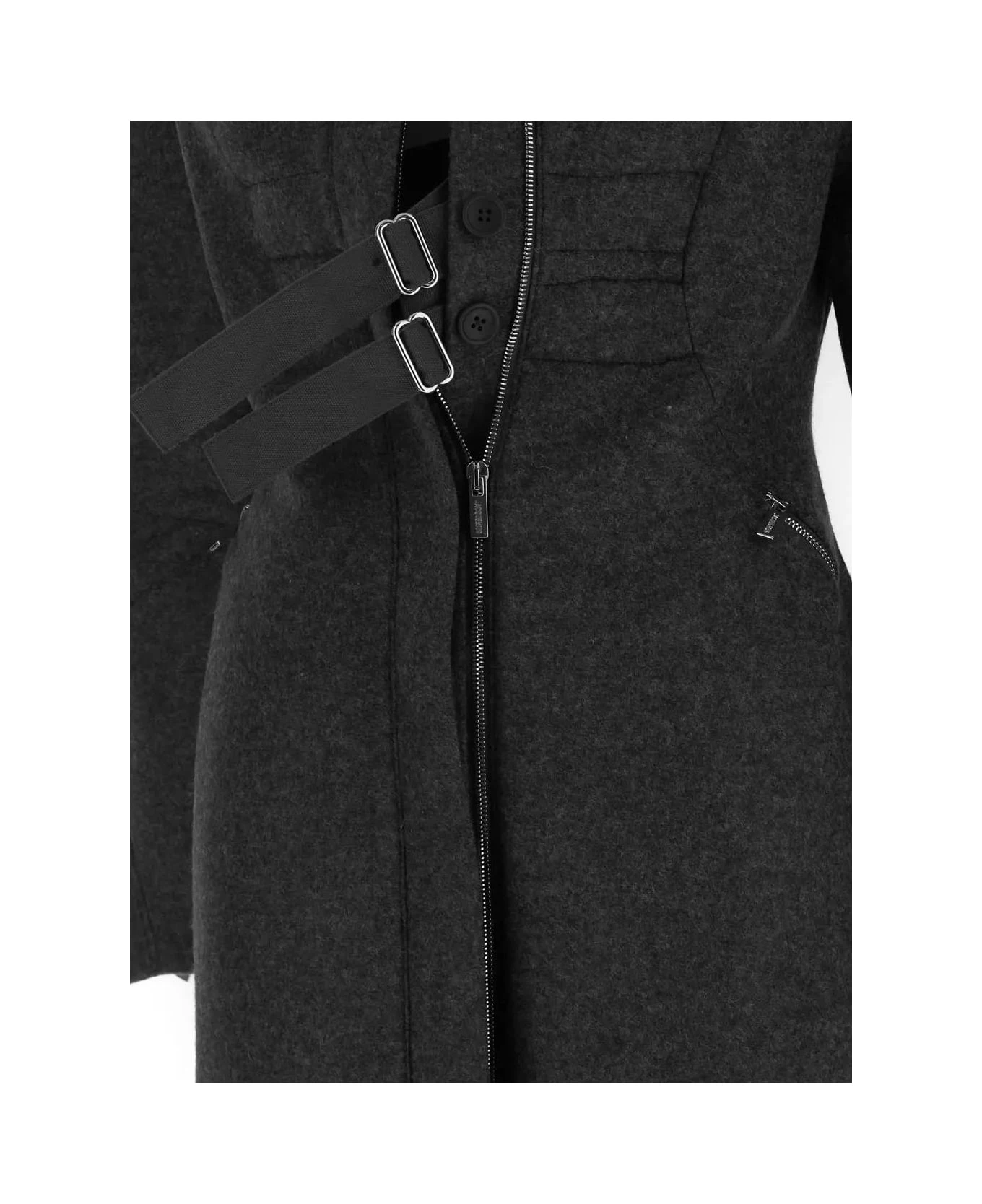 Jacquemus coat in dark grey polyester blend with round raglan sleeves, concealed zip closure, pointed collar, fitted shape, zipped cuffs, below-the-knee length, slanted zipped pockets and waist fastening.