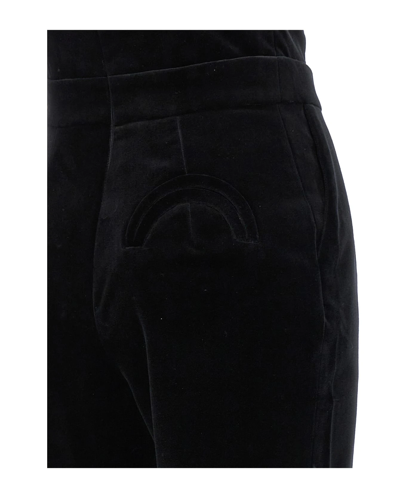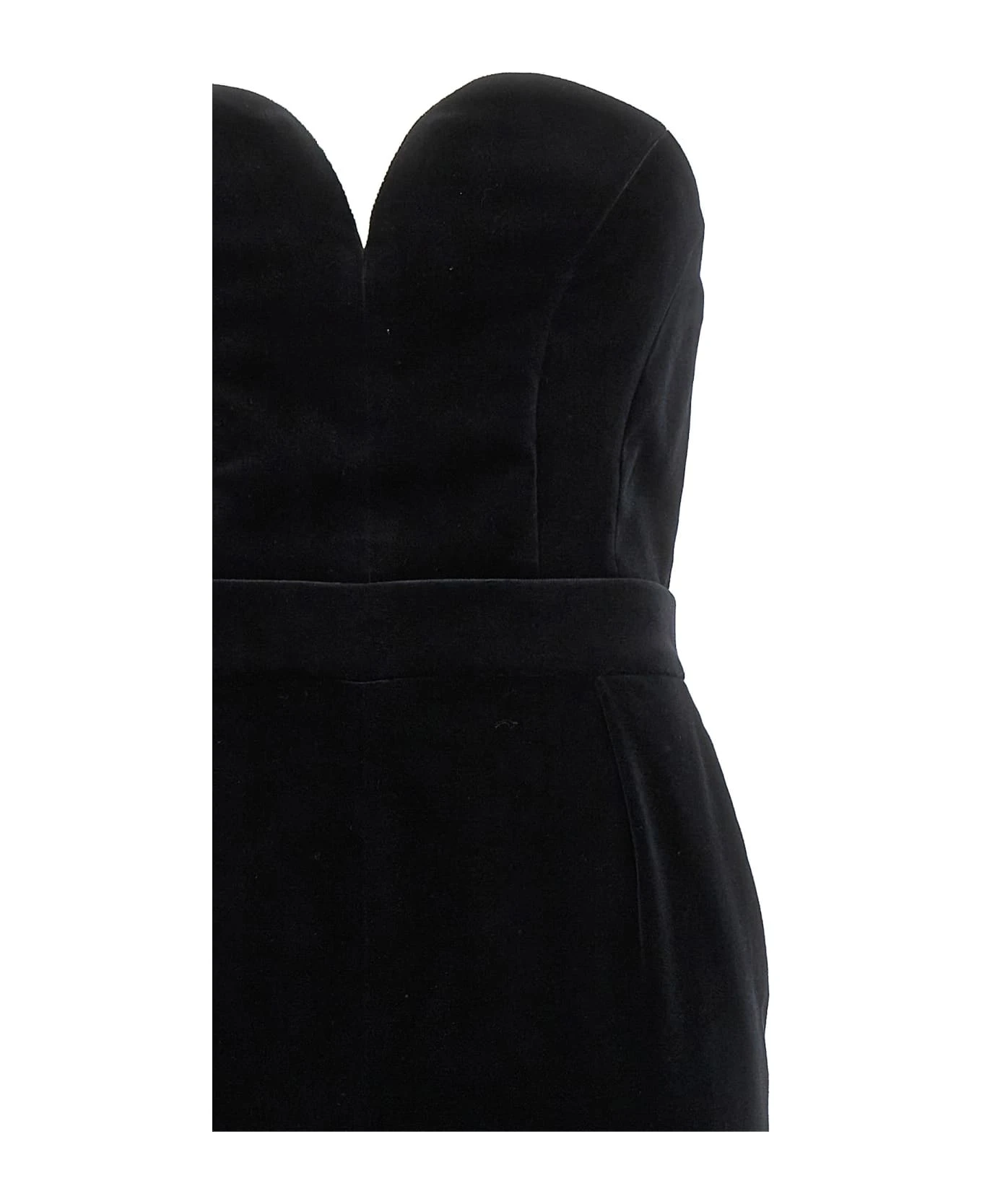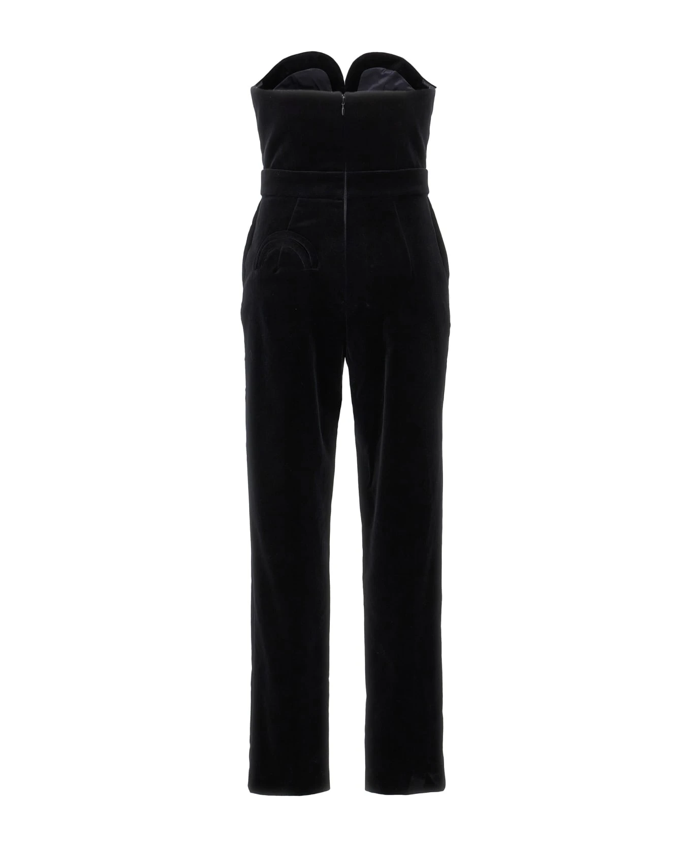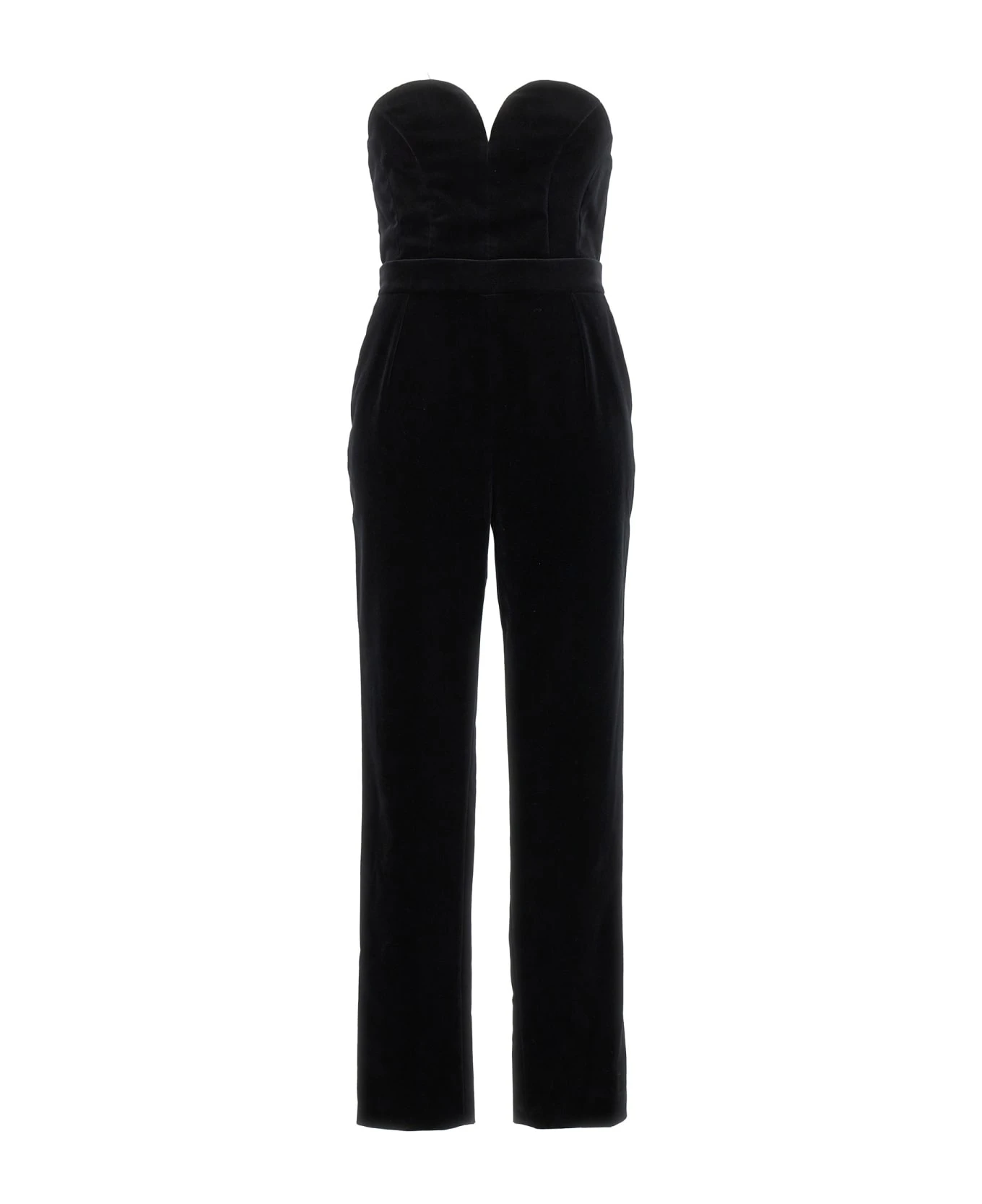 Off-the-shoulder Jealousy velvet jumpsuit with sweetheart neckline and back zip closure.