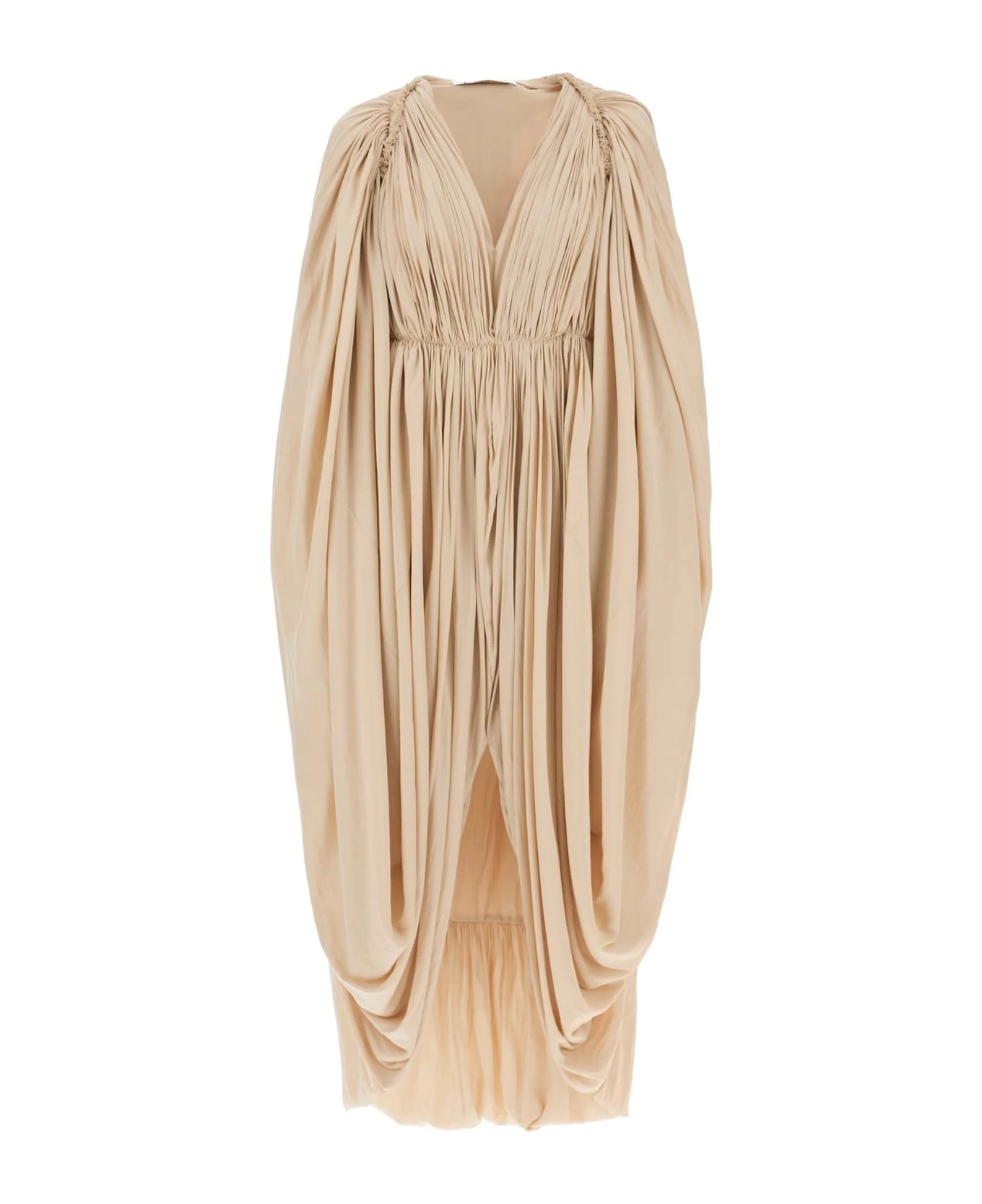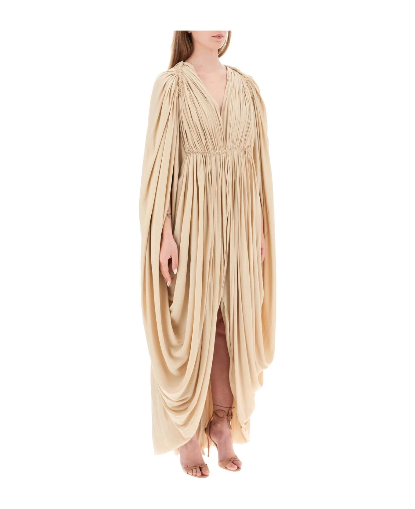 Lanvin maxi dress crafted in fluid charmeuse. Characterized by a draped construction with balloon skirt and front slit, this model features scoop V-neck, gathered bodice with natural waistline, wide ankle grazing balloon sleeves finished with frayed detailing at shoulders. Relaxed fit. The model is 177 cm tall and wears size FR 36.