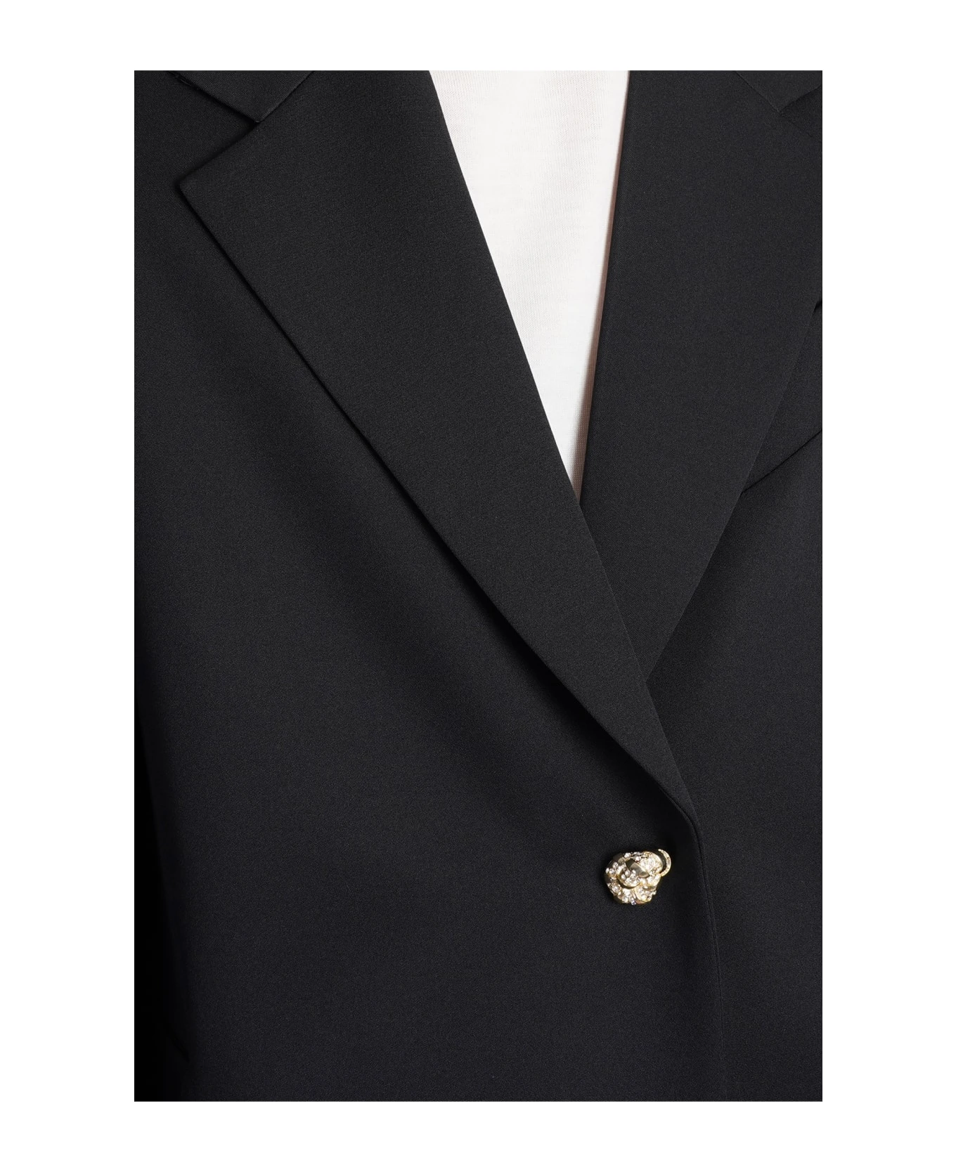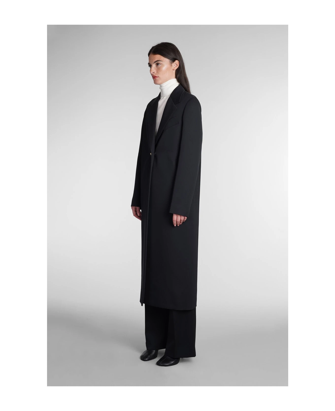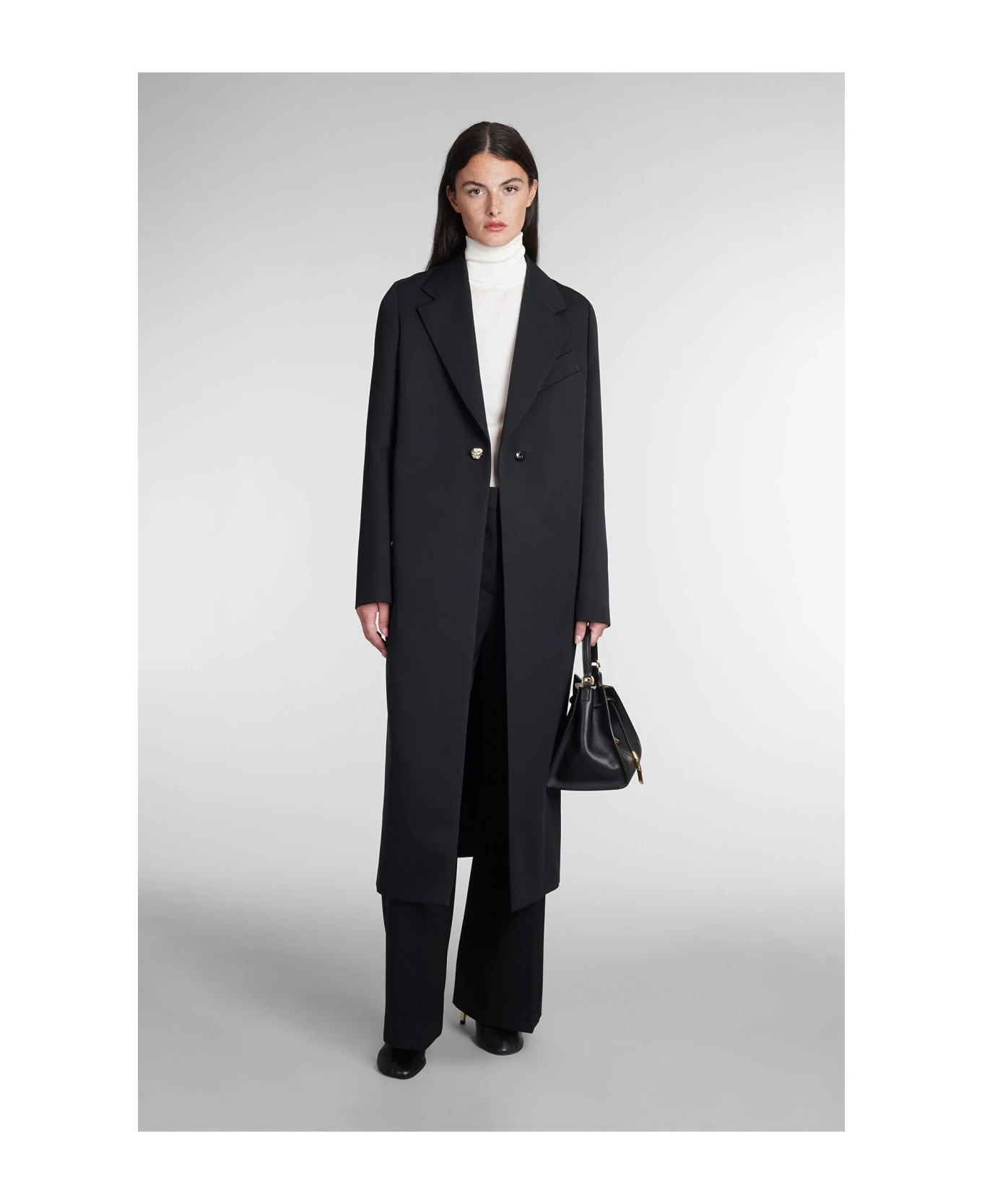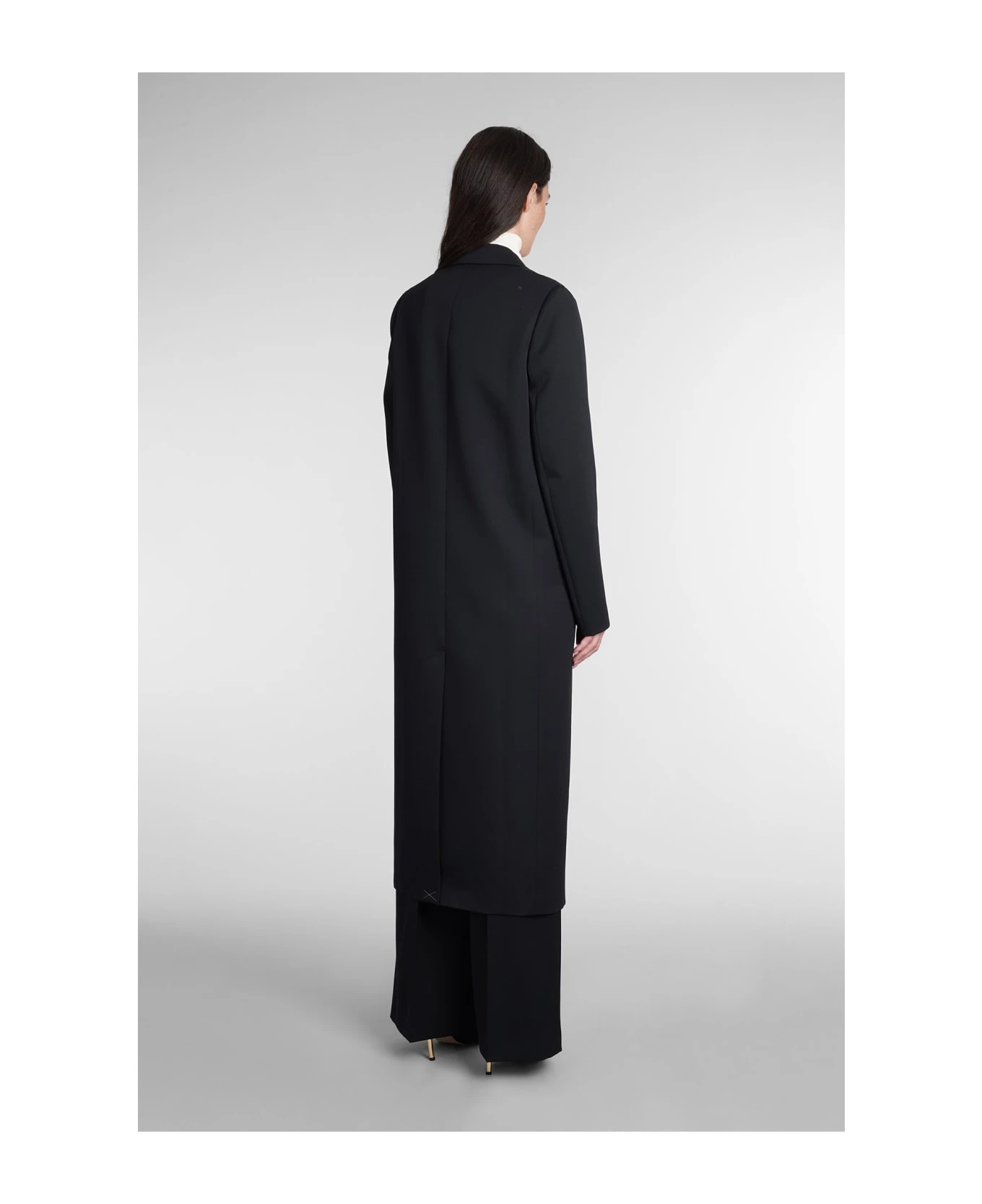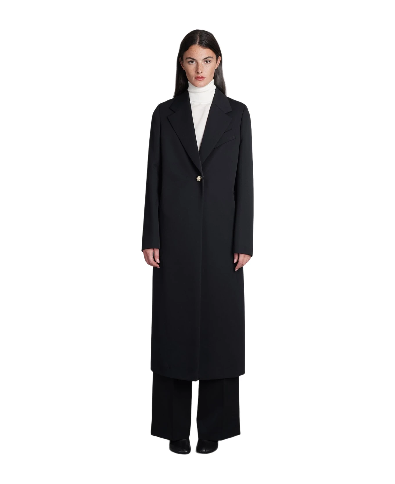 Coat in black polyester, single breasted, frontal buttoning, revers, breast pocket, jewel buttons, 100% polyester, Made in Italy, Model is 180 cm and wears 38