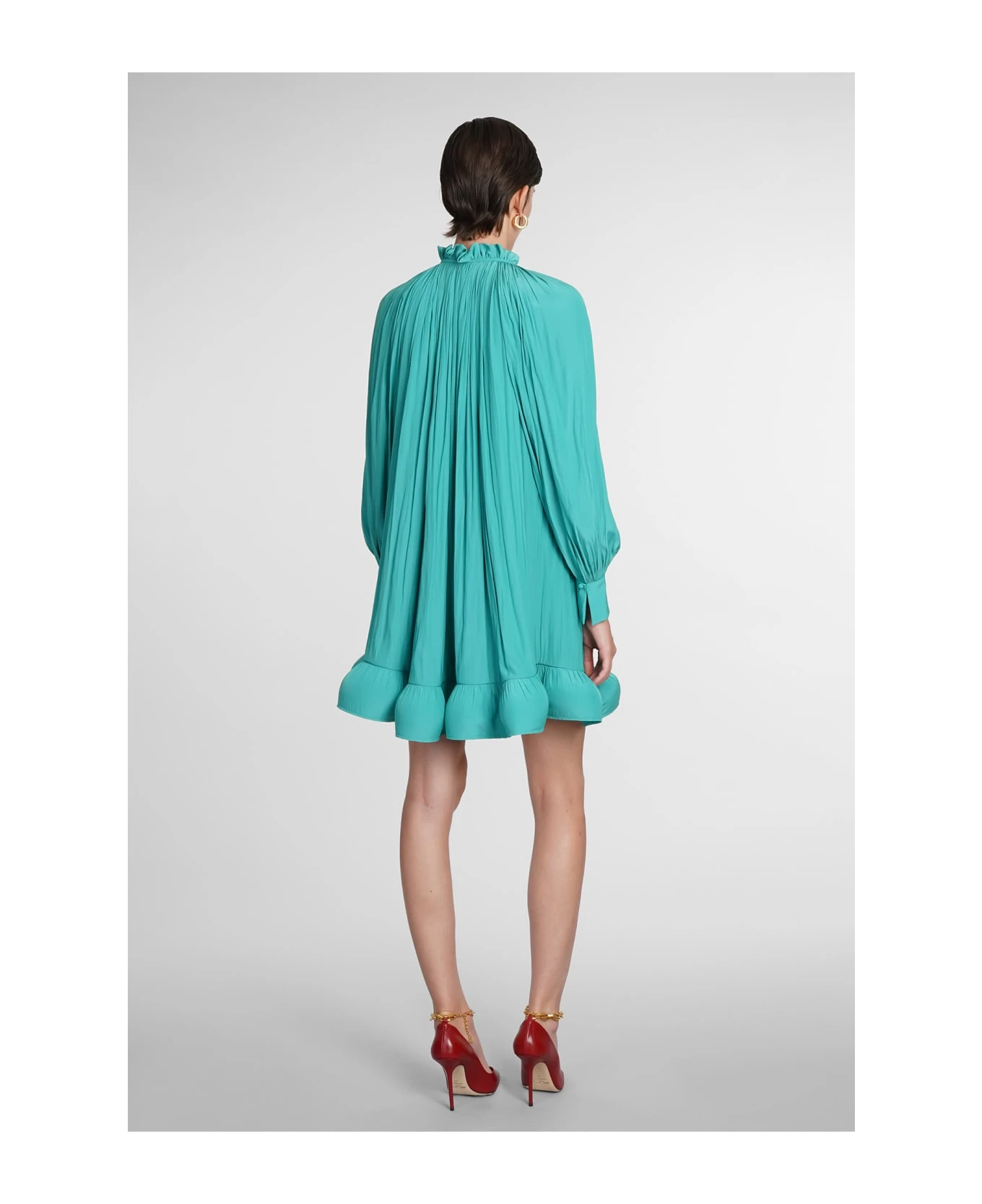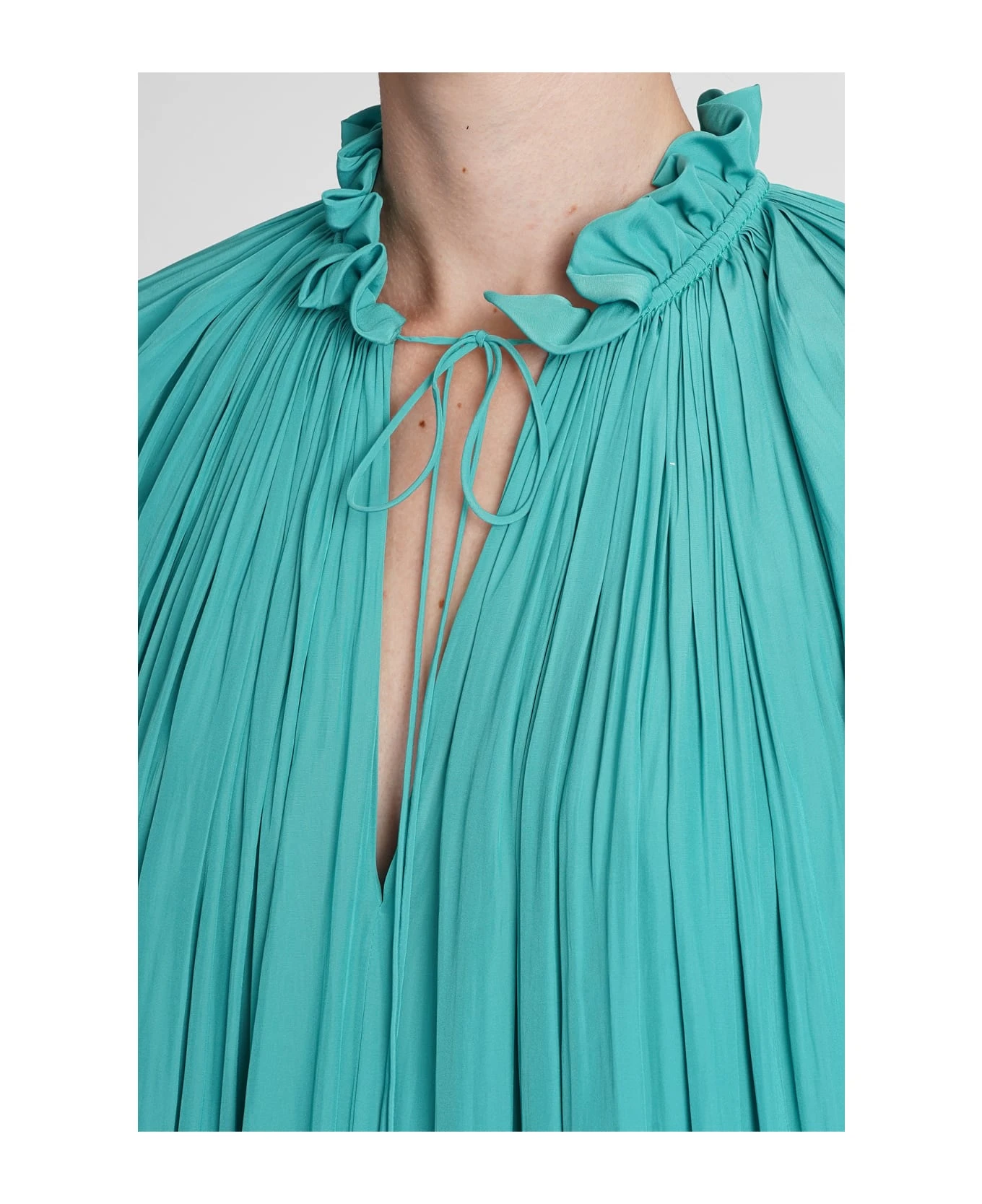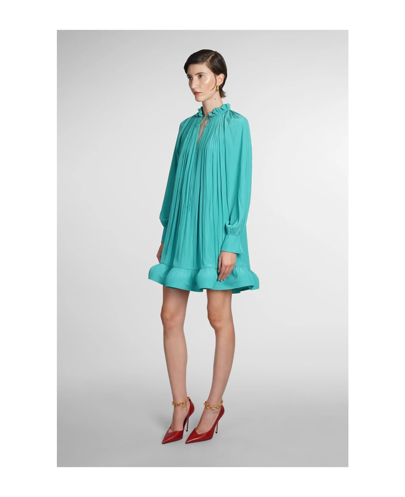 Dress in green polyester, ruffles, ruffle neck, long sleeves, pleated design, 100% polyester, Made in Slovakia, Model is 180 cm and wears 36