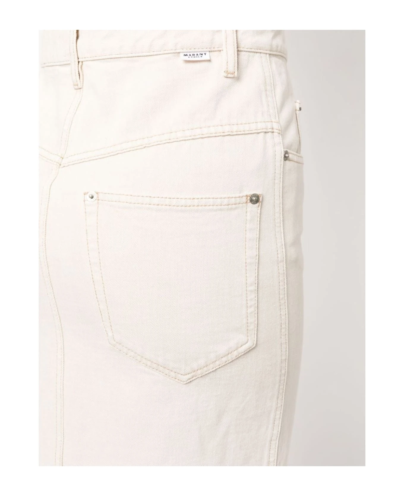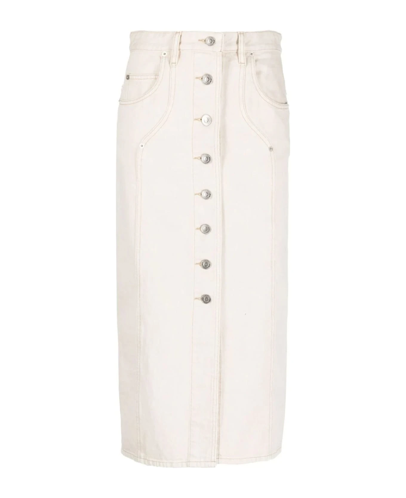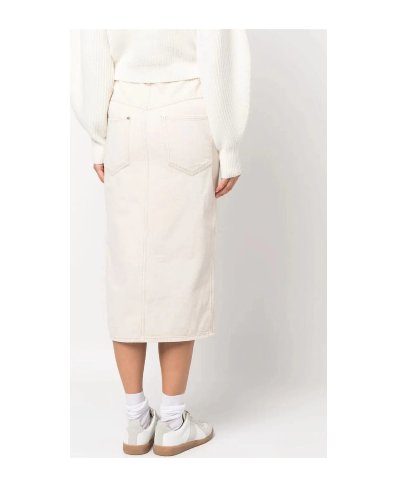 Light beige cotton denim midi skirt, front button fastening, calf-length, panelled design, belt loops, pencil design