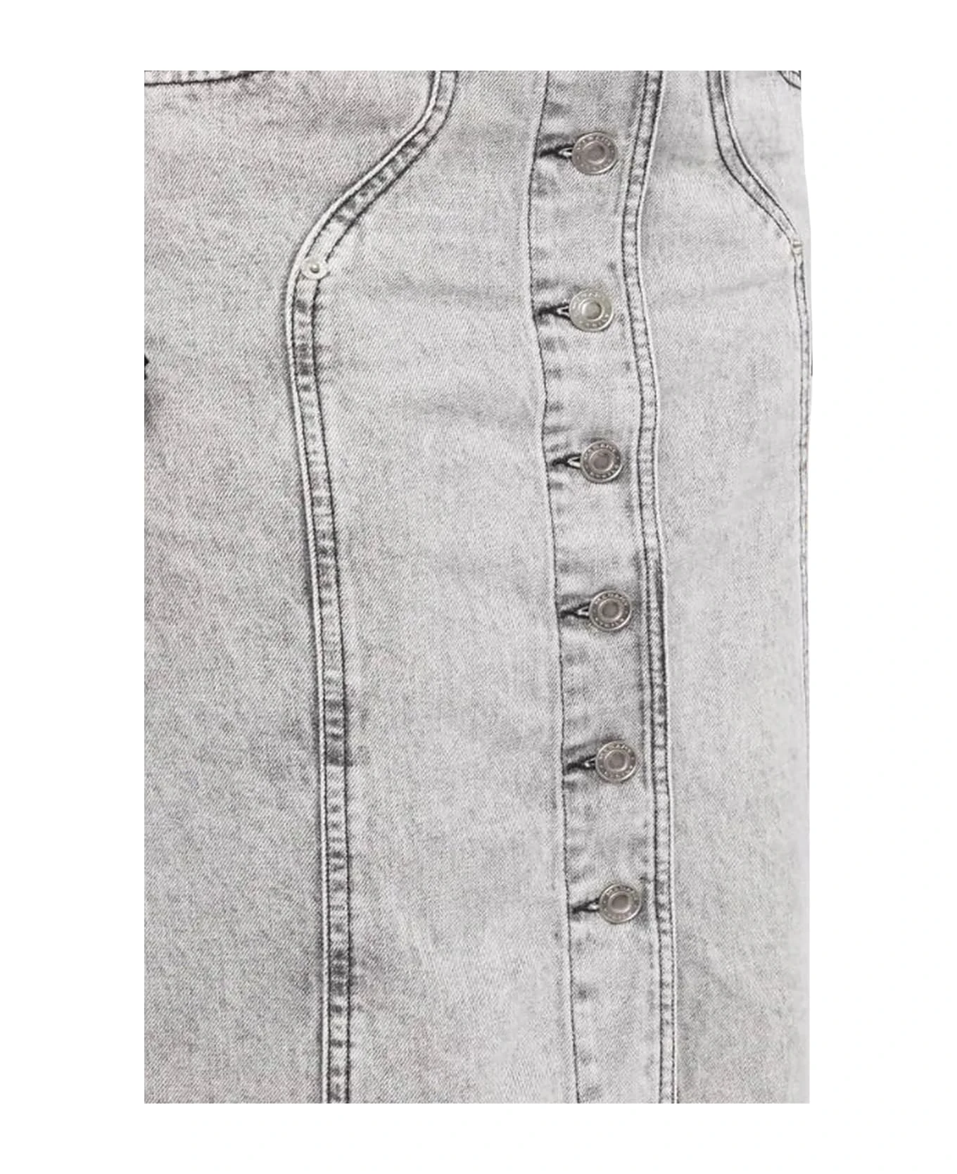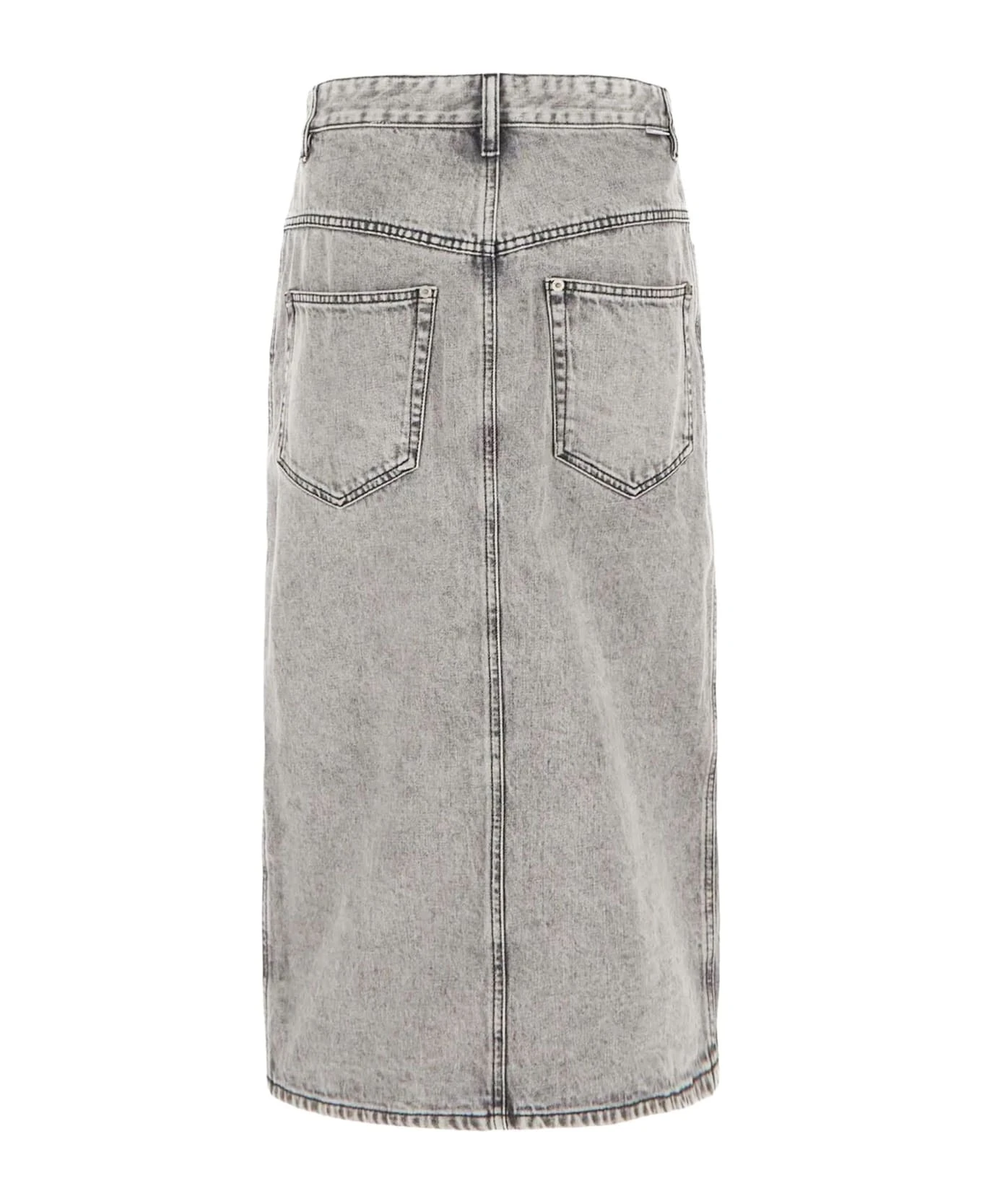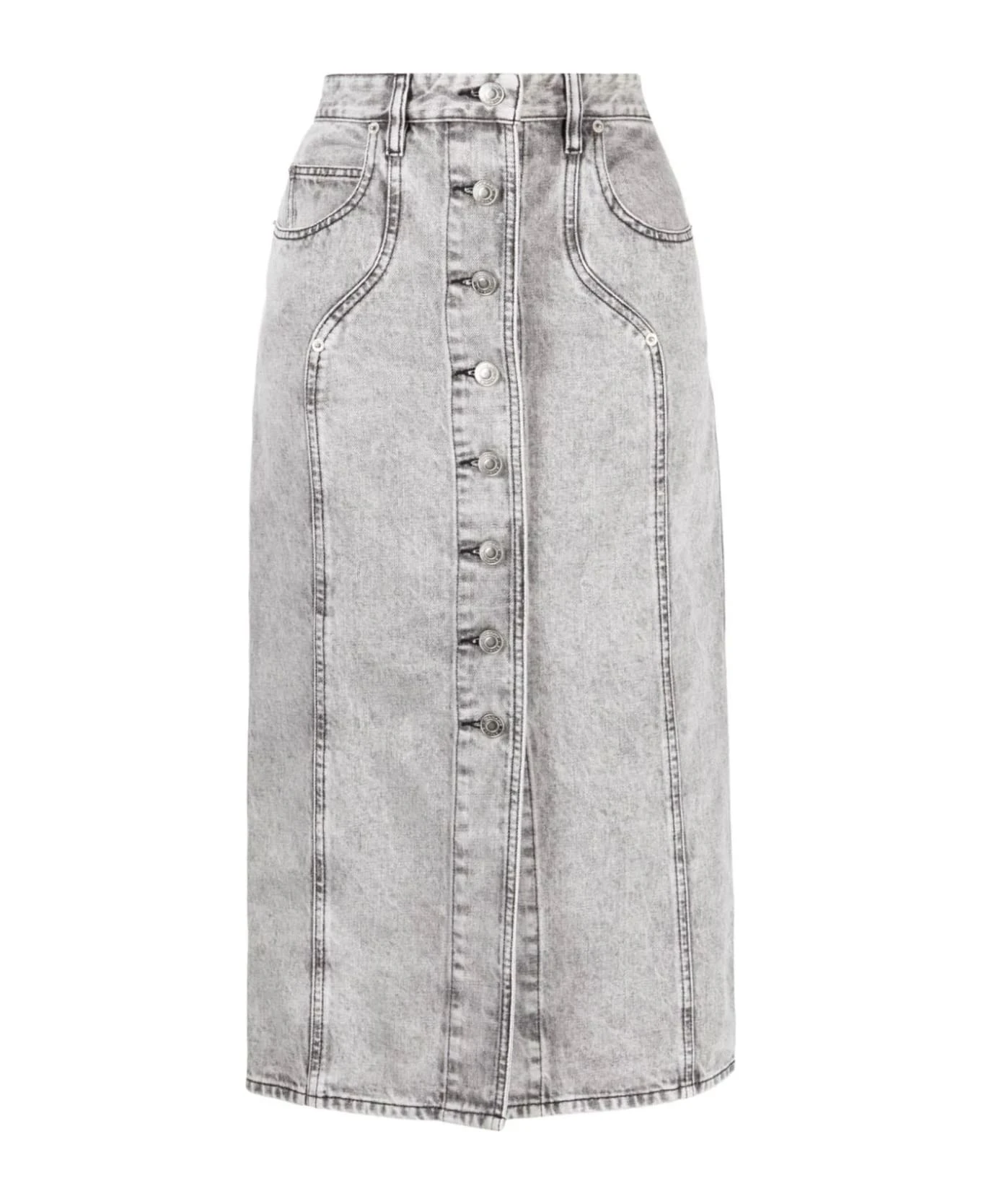 Light grey cotton denim midi skirt, front button fastening, calf-length, panelled design, belt loops, pencil design